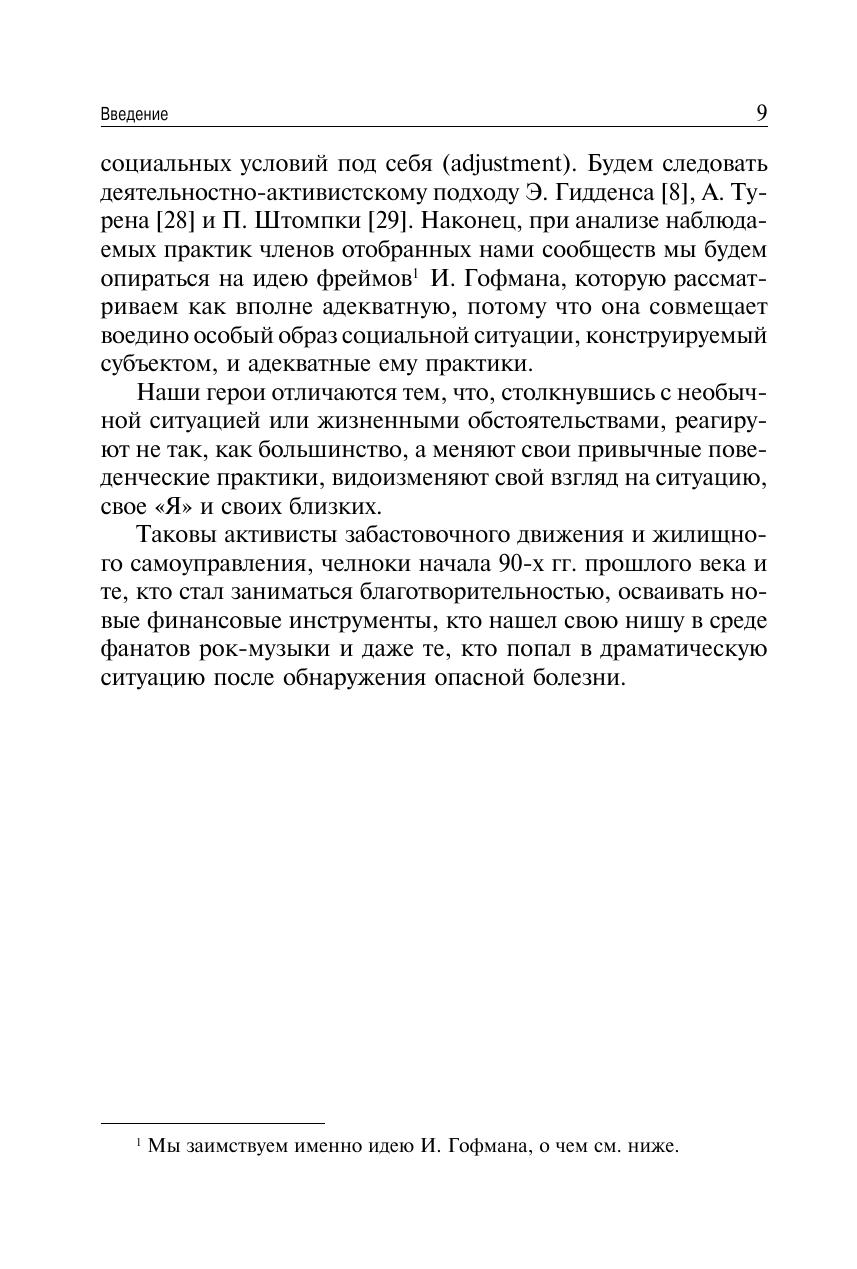 На основе результатов коллективного исследовательского проекта предложены описание и интерпретация восьми наблюдавшихся в разных регионах России случаев поведения людей в проблемной ситуации: новых фермеров, жильцов самоуправляемых домов, «челноков» начала 1990-х гг., ипотечных заемщиков, молодых фанатов рок-музыки, предпринимателей- благотворителей, забастовщиков и ВИЧ-инфицированных пациентов. Эти случаи поведения обычных людей, оказавшихся в ситуации, требующей выбора, интерпретируются в логике ряда теоретических подходов: в теориях адаптивного поведения, ломки привычной идентичности, деятельностно-активистского подхода, в логике феноменологического анализа повседневных практик и субъективных «конструкций» жизненной ситуации. Подробно освещаются научные аспекты и ход реализации проекта: теоретические пред- посылки, их уточнение в процессе исследования, методология и процедуры получения исходных данных, логика интерпретации полевых материалов, ар- гументируются итоговые выводы. Для научных работников, руководителей и сотрудников аппарата управления, учреждений социальной сферы. Может использоваться в учебном процессе при подготовке студентов по направлению (специальности) «Социология», другим социально-гуманитарным направлениям, требующим углубленной социологической подготовки. Представляет интерес для широкого круга читателей, желающих понять современное российское общество.