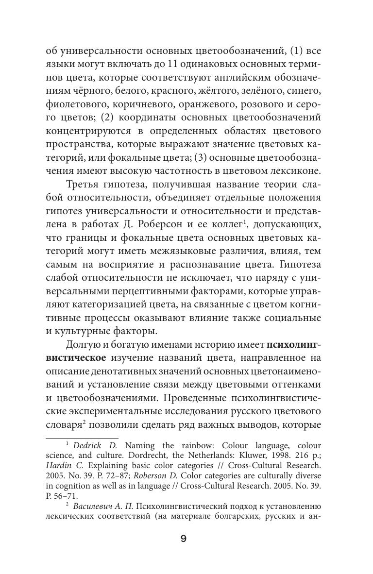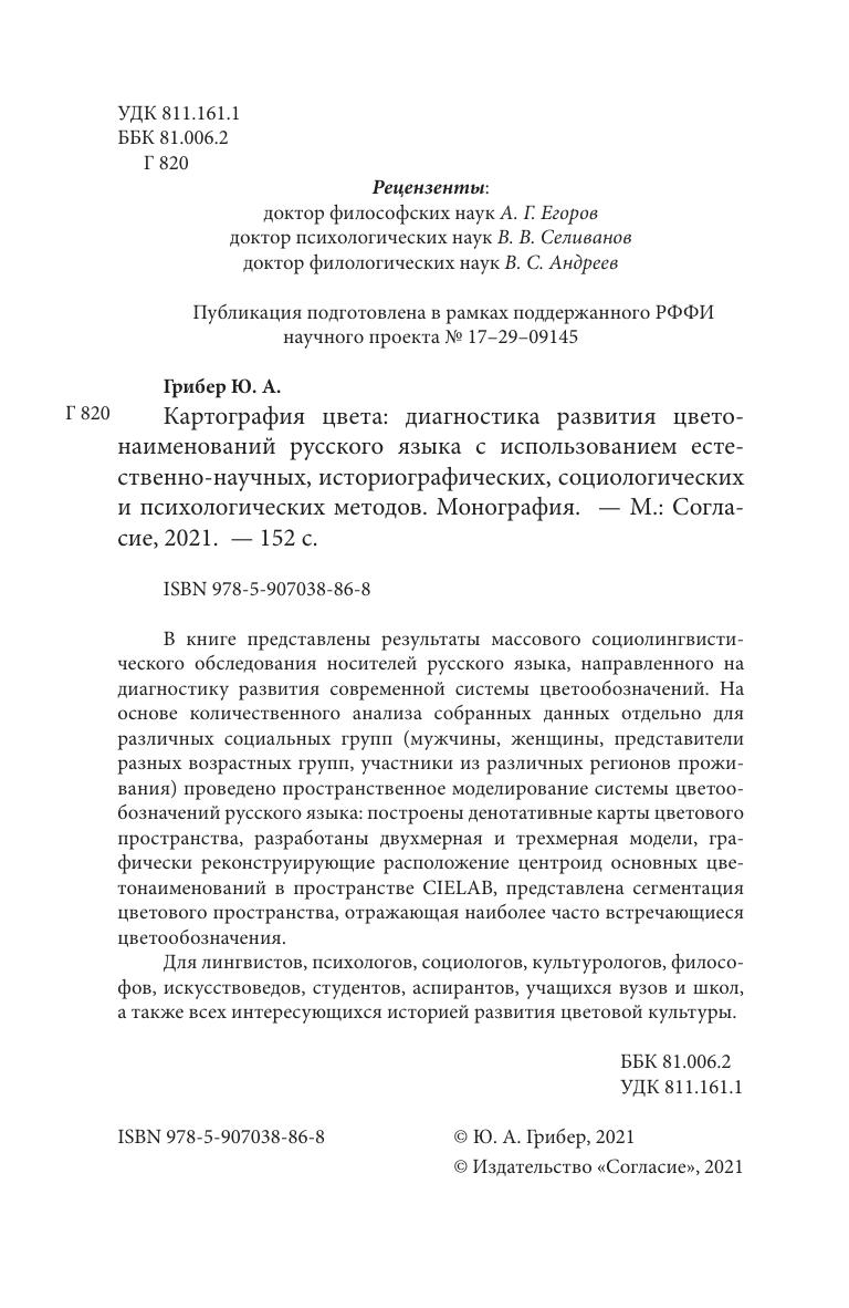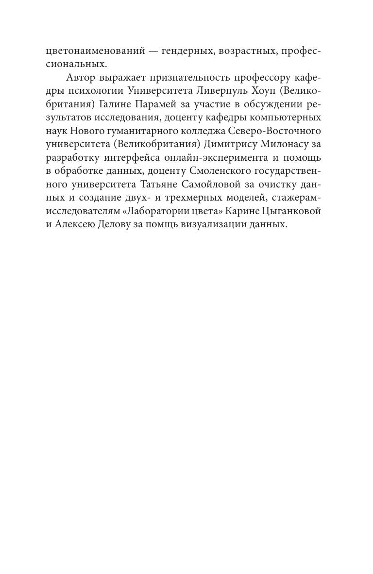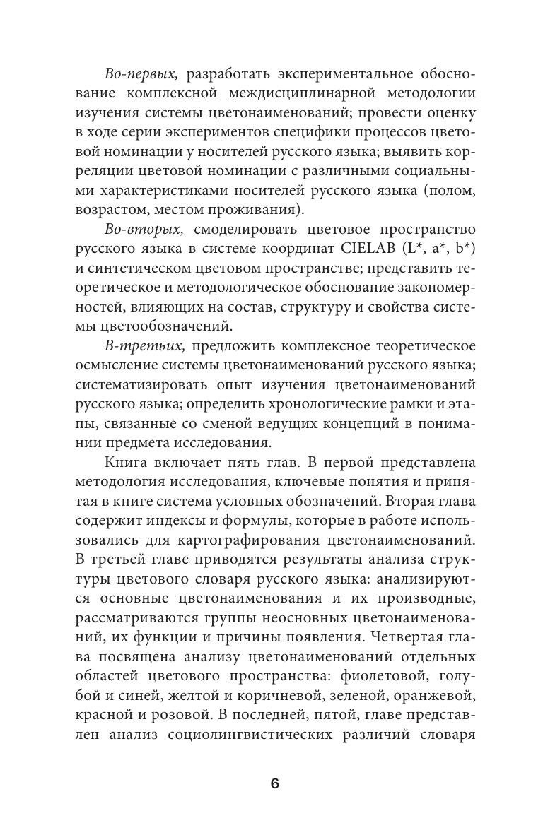 В книге представлены результаты массового социолингвистического обследования носителей русского языка, направленного на диагностику развития современной системы цветообозначений. На основе количественного анализа собранных данных отдельно для различных социальных групп (мужчины, женщины, представители разных возрастных групп, участники из различных регионов проживания) проведено пространственное моделирование системы цветообозначений русского языка: построены денотативные карты цветового пространства, разработаны двухмерная и трехмерная модели, графически реконструирующие расположение центроид основных цветонаименований в пространстве CIELAB, представлена сегментация цветового пространства, отражающая наиболее часто встречающиеся цветообозначения. Для лингвистов, психологов, социологов, культурологов, философов, искусствоведов, студентов, аспирантов, учащихся вузов и школ, а также всех интересующихся историей развития цветовой культуры.