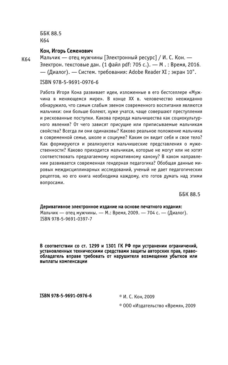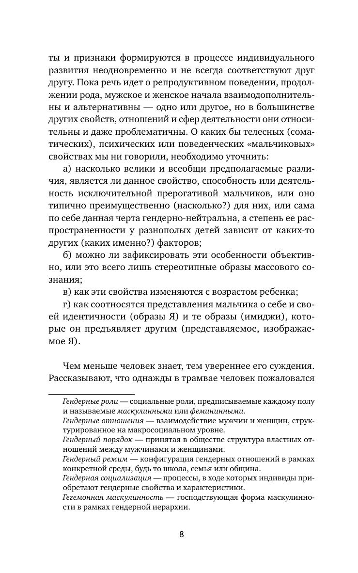 Работа Игоря Кона развивает идеи, изложенные в его бестселлере «Мужчина в меняющемся мире». В конце ХХ в. человечество неожиданно обнаружило, что самым слабым звеном современного воспитания являются мальчики: они больше болеют, хуже учатся, чаще совершают преступления и рискованные поступки. Какова природа мальчишества как социокультурного явления? От чего зависят присущие или приписываемые мальчикам свойства? Всегда ли они одинаковы? Каково реальное положение мальчика в современной семье, школе и социуме? Каким он видит себя и свое тело? Как формируются и реализуются мальчишеские представления о мужественности? Каково приходится мальчикам, которые не могут или не хотят соответствовать предлагаемому нормативному канону? В каком направлении развивается современная гендерная педагогика? Обобщая данные мировых междисциплинарных исследований, ученый не дает педагогических рецептов, но его книга необходима каждому, кто готов думать над этими вопросами.
