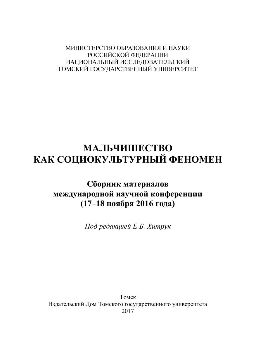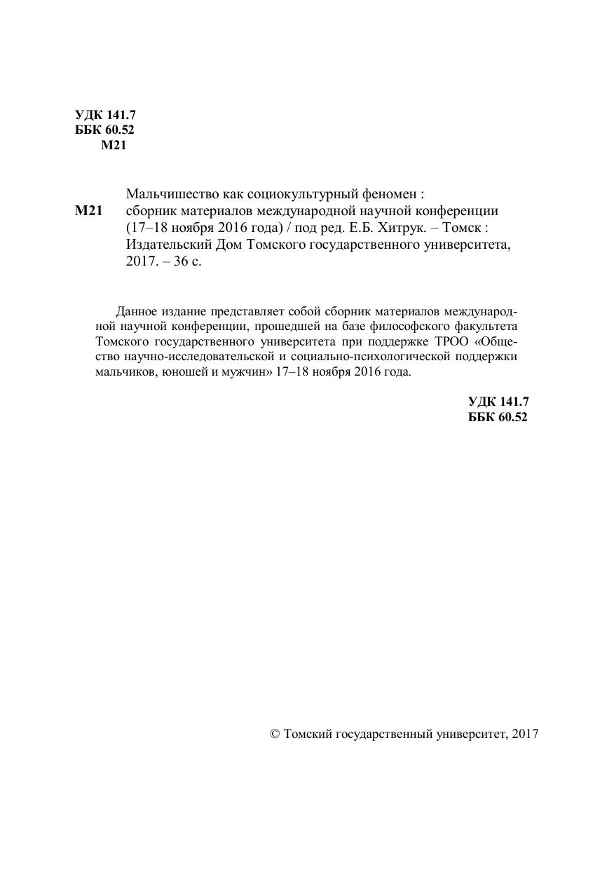 Данное издание представляет собой сборник материалов международной научной конференции, прошедшей на базе философского факультета Томского государственного университета при поддержке ТРОО «Общество научно-исследовательской и социально-психологической поддержки мальчиков, юношей и мужчин» 17–18 ноября 2016 года.