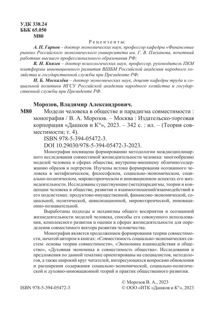 Монография посвящена формированию методологии междисциплинарного исследования совместимой жизнедеятельности человека: многообразию моделей человека в сферах общества; внутренне-внешнему обличию/содержанию образов и портретов. Изучены истоки формирования осознанного человека в метафизическом, философском, социально-экономическом, социально-политическом, мировоззренческом и инновационном аспектах его жизнедеятельности. Исследованы существующие (мета)парадигмы, теории и концепции человека в обществе, развития и взаимоотношений/взаимодействий в его подсистемах: продуктово-имущественной, финансово-экономической, социальной, политической, цивилизационной, мировоззренческой, инновационно-познавательной.