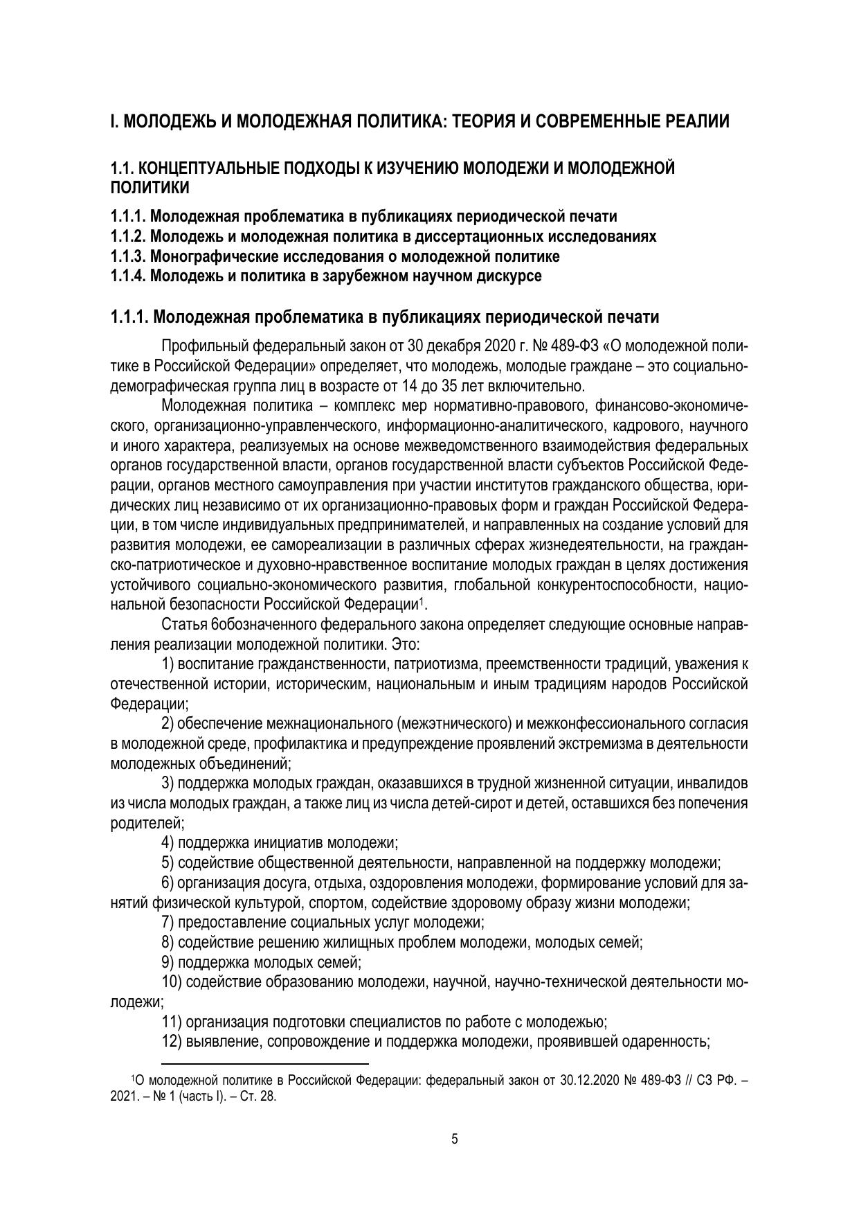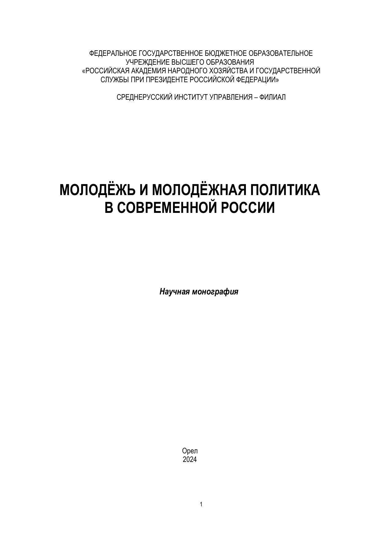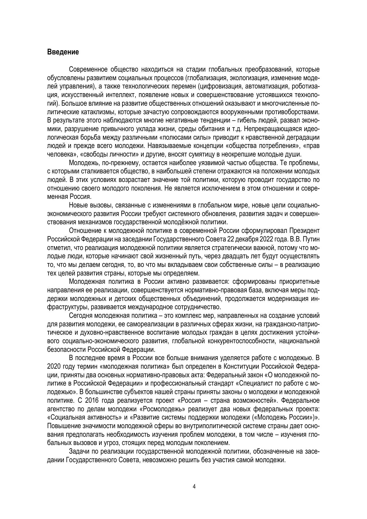 В монографическом издании систематизированы результаты исторических, социологических, политологических и других социогуманитарных исследований в сфере реализации государственной молодежной политики в Российской Федерации в условиях современных вызовов. В монографии рассматривается место молодежи в структуре современного российского общества, ее ценностные ориентации, мотивационные установки и поведенческие практики, основные концептуальные подходы к изучению молодежи и молодежной политики, а также роль молодежи в социальном предпринимательстве. Отражены современные подходы к формированию государственной молодежной политики, обозначены стратегические приоритеты государственной молодежной политики в Российской Федерации, раскрывается опыт зарубежных стран в практике реализации молодежной политики на современном этапе, анализируется механизм подготовки кадров для сферы молодежной политики. В исследовании представлен анализ основных моделей осуществления молодежной политики в современном мире. Монография адресована научным работникам, преподавателям, аспирантам и студентам вузов, специалистам по работе с молодежью, социальным работникам, социологам, молодежным лидерам, а также всем, кто интересуется современной молодежной проблематикой.