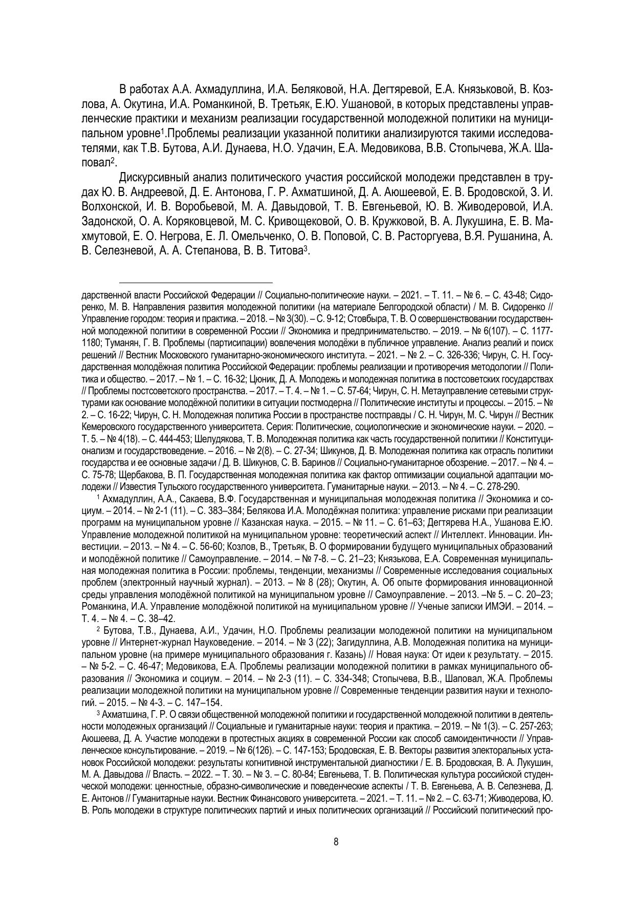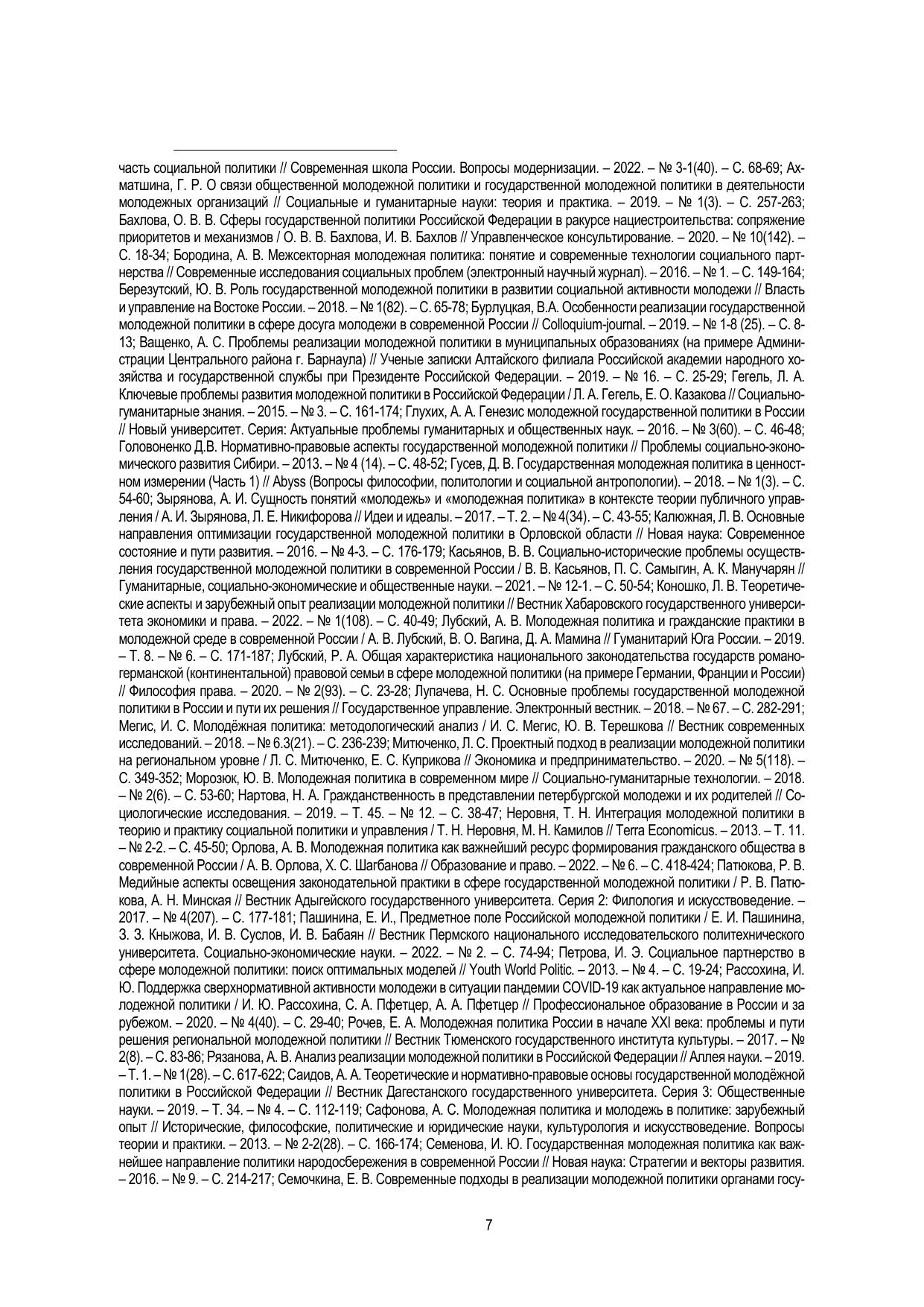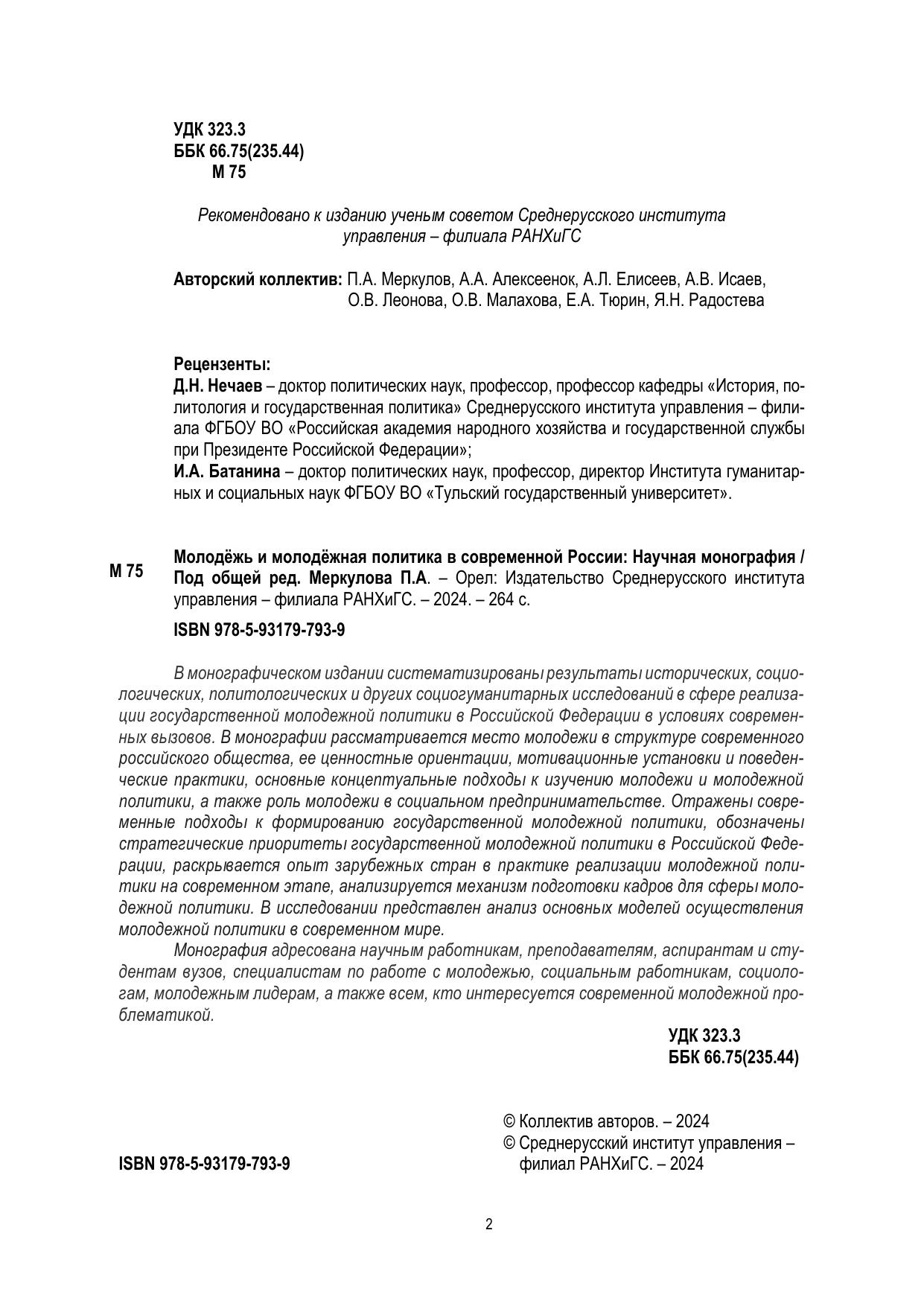В монографическом издании систематизированы результаты исторических, социологических, политологических и других социогуманитарных исследований в сфере реализации государственной молодежной политики в Российской Федерации в условиях современных вызовов. В монографии рассматривается место молодежи в структуре современного российского общества, ее ценностные ориентации, мотивационные установки и поведенческие практики, основные концептуальные подходы к изучению молодежи и молодежной политики, а также роль молодежи в социальном предпринимательстве. Отражены современные подходы к формированию государственной молодежной политики, обозначены стратегические приоритеты государственной молодежной политики в Российской Федерации, раскрывается опыт зарубежных стран в практике реализации молодежной политики на современном этапе, анализируется механизм подготовки кадров для сферы молодежной политики. В исследовании представлен анализ основных моделей осуществления молодежной политики в современном мире. Монография адресована научным работникам, преподавателям, аспирантам и студентам вузов, специалистам по работе с молодежью, социальным работникам, социологам, молодежным лидерам, а также всем, кто интересуется современной молодежной проблематикой.