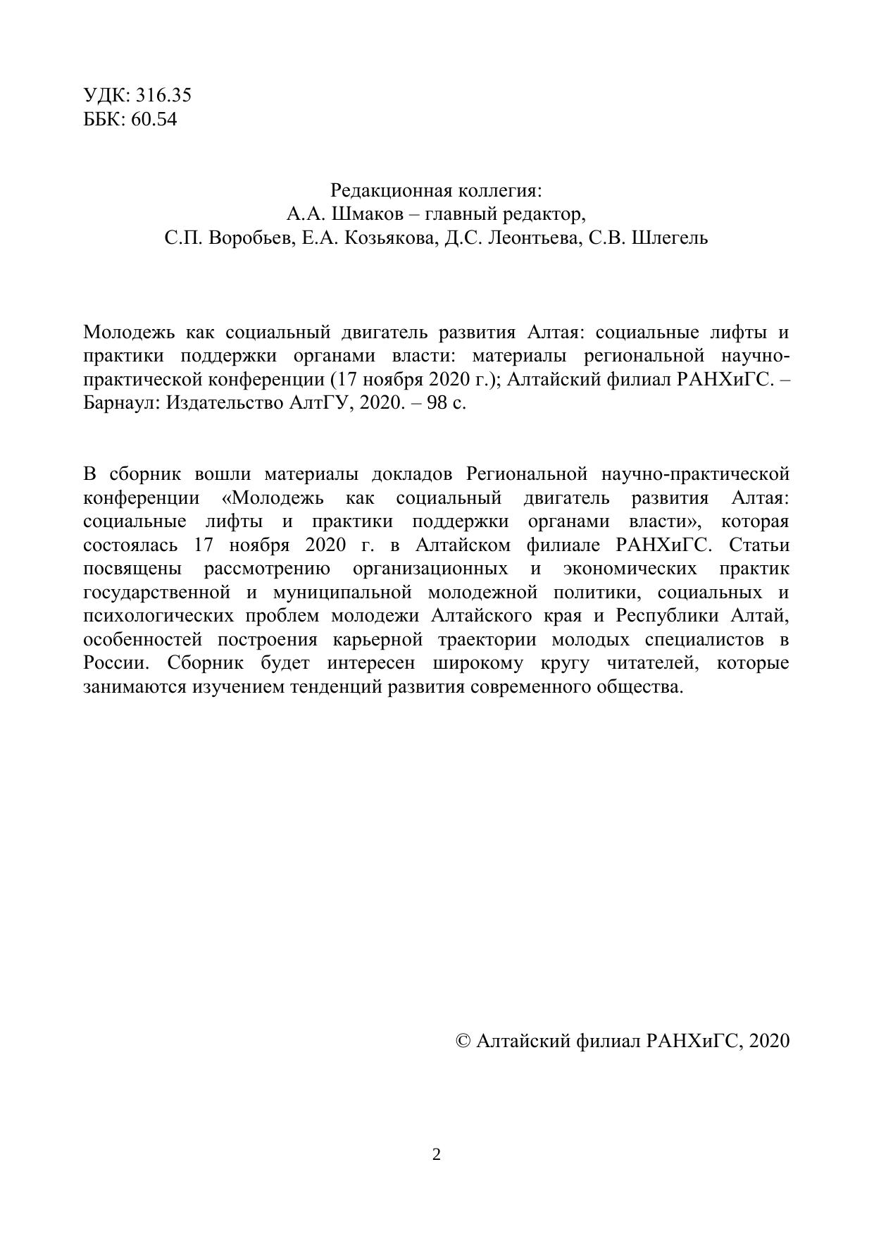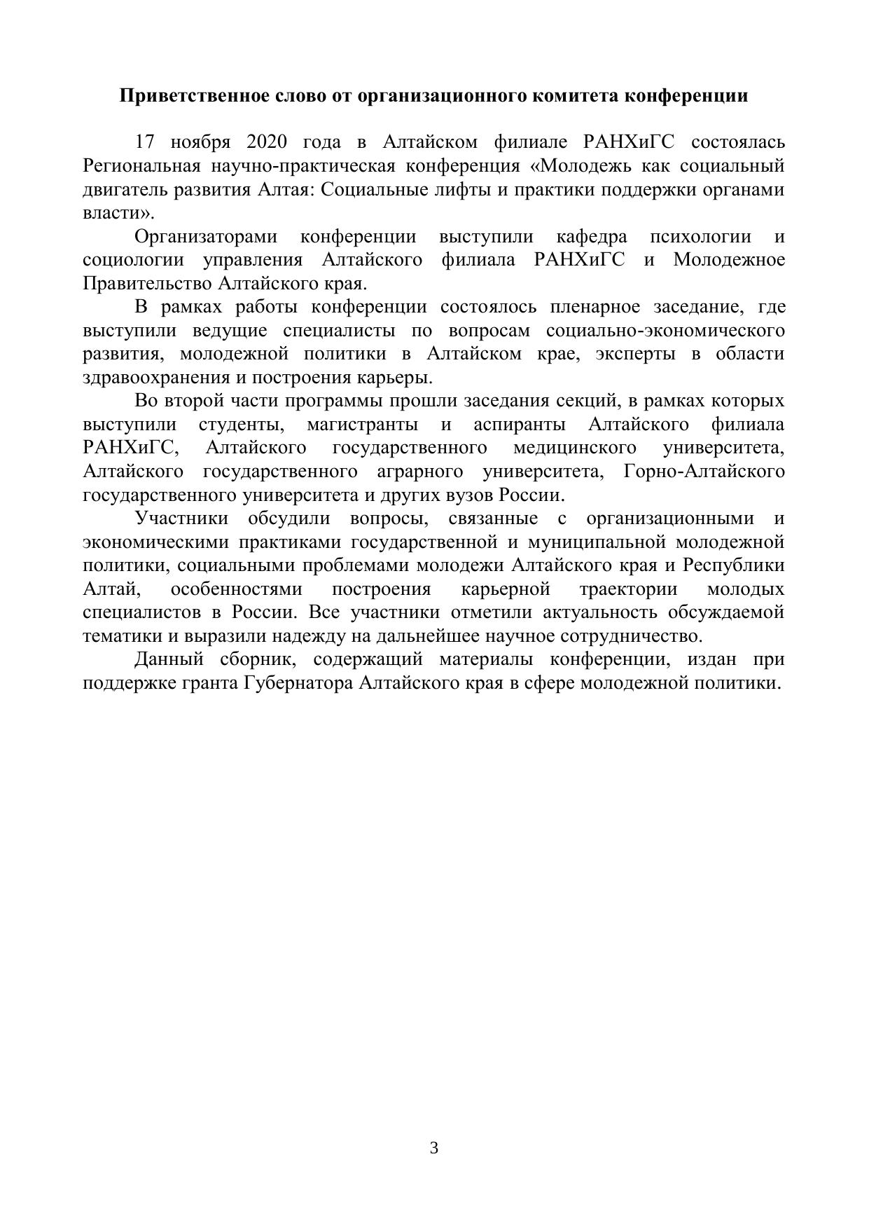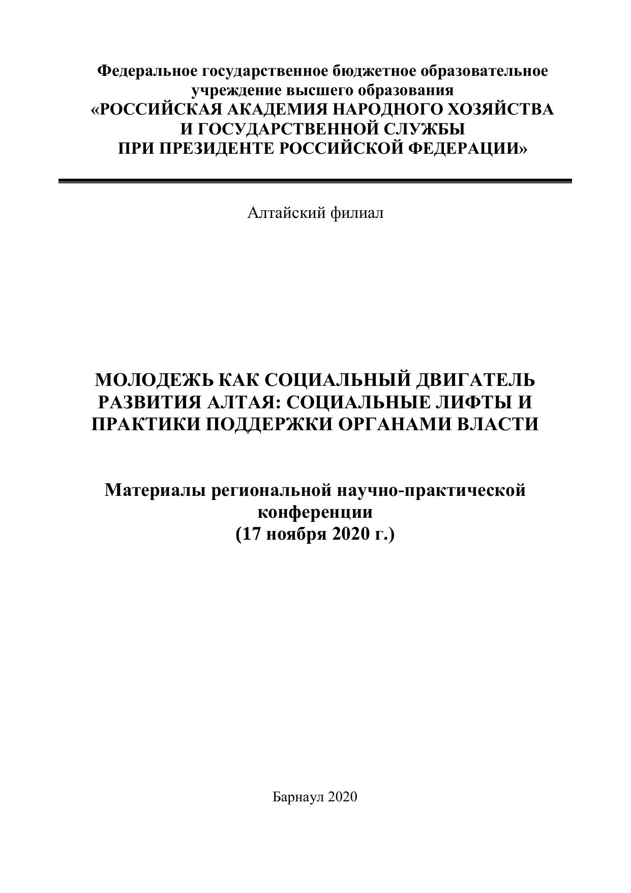 Молодежь как социальный двигатель развития Алтая: социальные лифты и практики поддержки органами власти: материалы региональной научно-практической конференции (17 ноября 2020 г.)