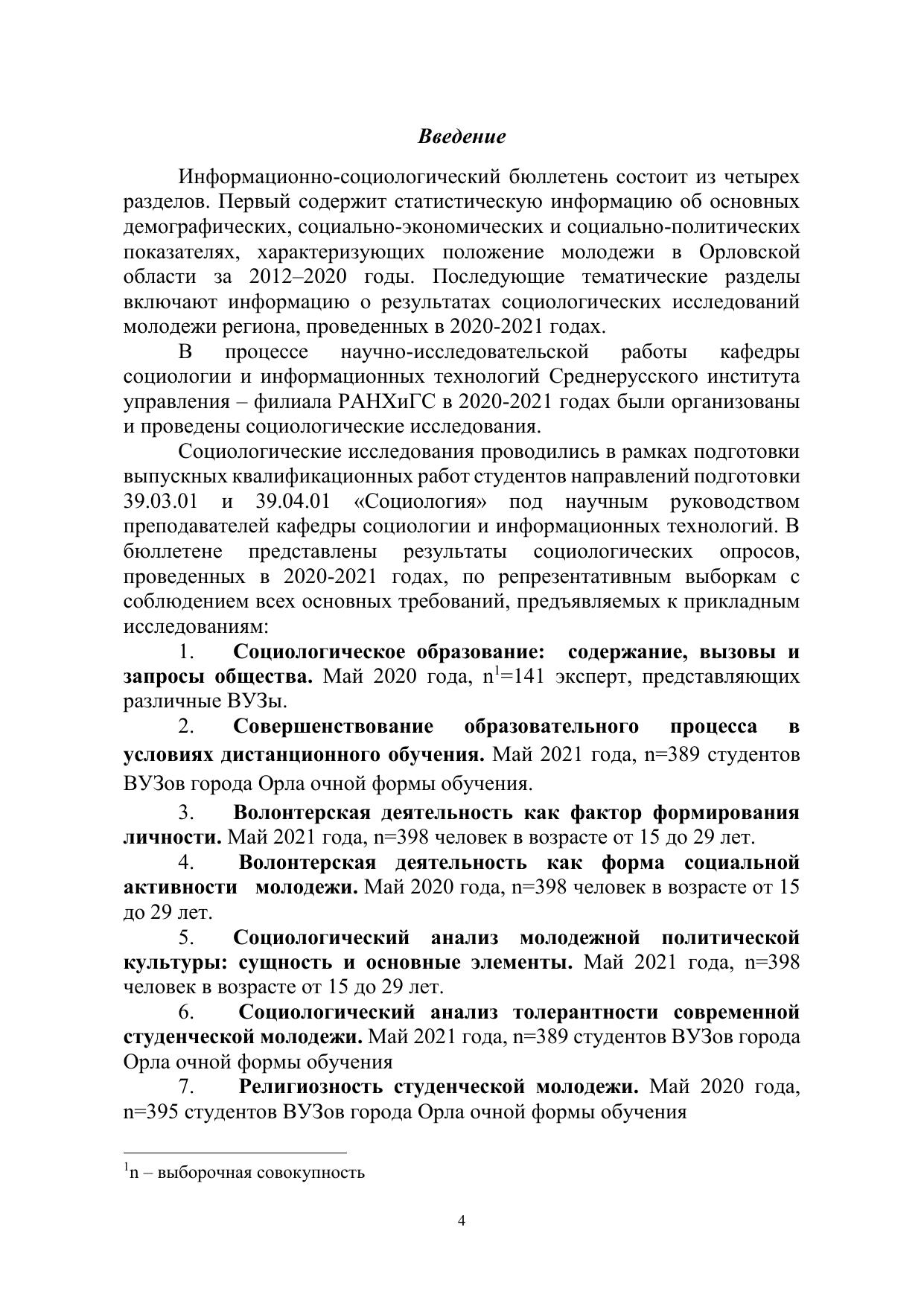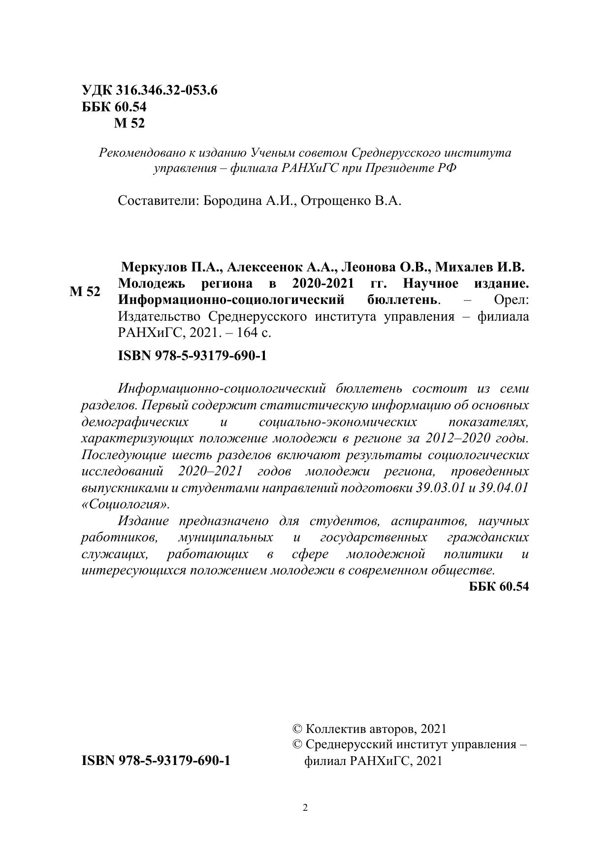 Информационно-социологический бюллетень состоит из семи разделов. Первый содержит статистическую информацию об основных демографических и социально-экономических показателях, характеризующих положение молодежи в регионе за 2012–2020 годы. Последующие шесть разделов включают результаты социологических исследований 2020–2021 годов молодежи региона, проведенных выпускниками и студентами направлений подготовки 39.03.01 и 39.04.01 «Социология». Издание предназначено для студентов, аспирантов, научных работников, муниципальных и государственных гражданских служащих, работающих в сфере молодежной политики и интересующихся положением молодежи в современном обществе.