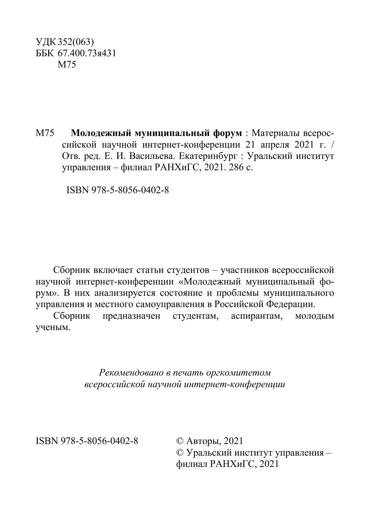 Сборник включает статьи студентов – участников всероссийской научной интернет-конференции «Молодежный муниципальный форум». В них анализируется состояние и проблемы муниципального управления и местного самоуправления в Российской Федерации. Сборник предназначен студентам, аспирантам, молодым ученым.