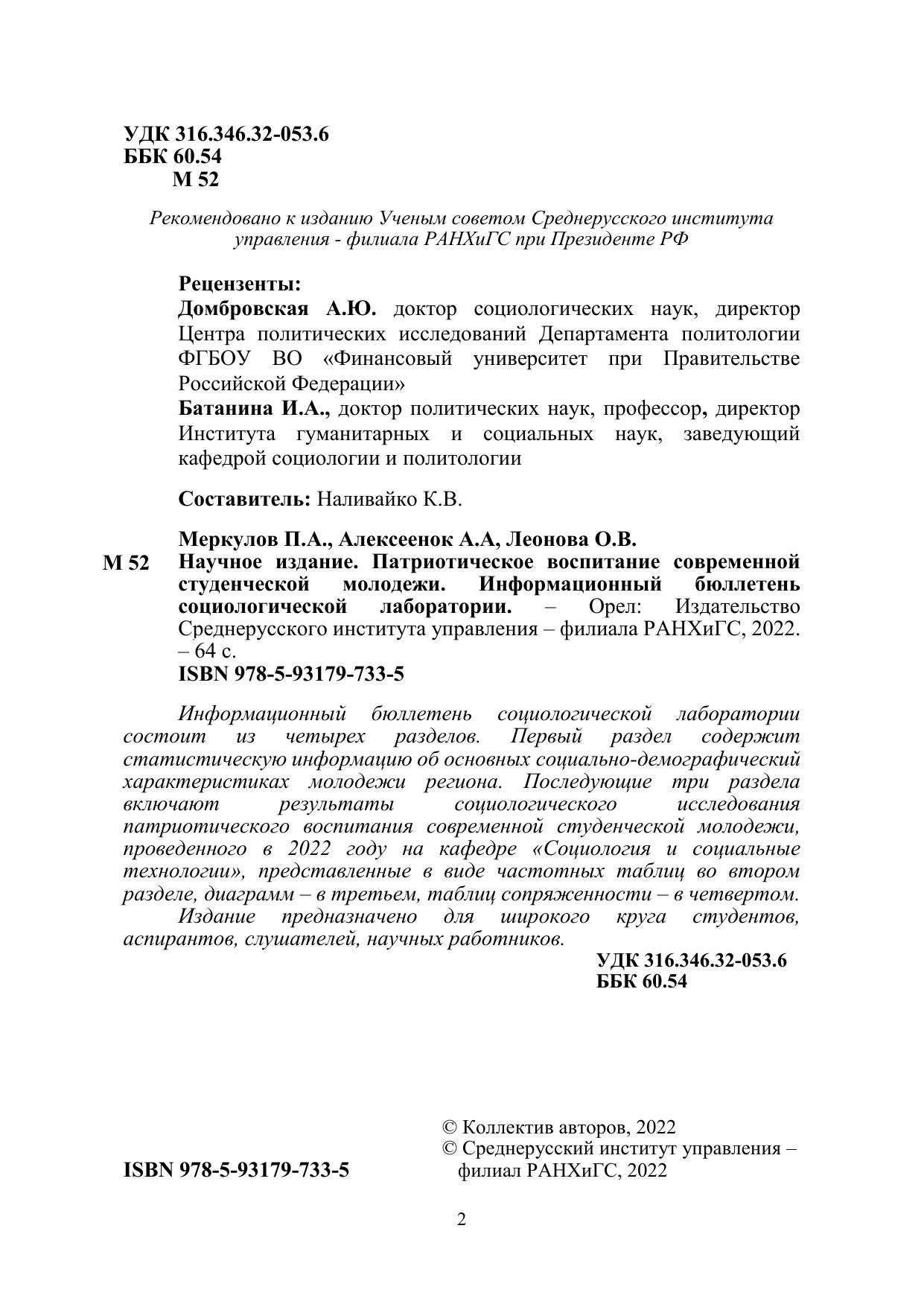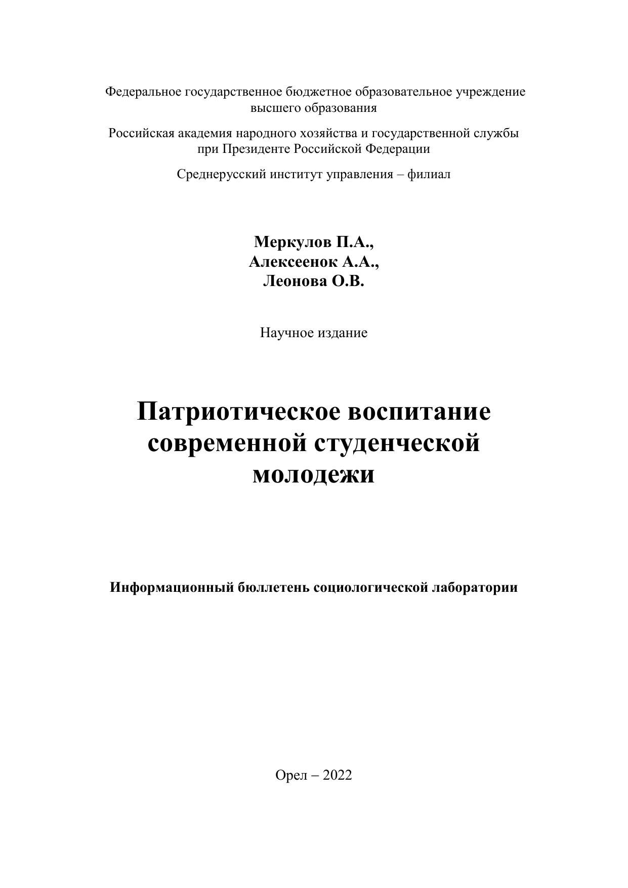 Научное издание. Патриотическое воспитание современной студенческой молодежи. Информационный бюллетень социологической лаборатории