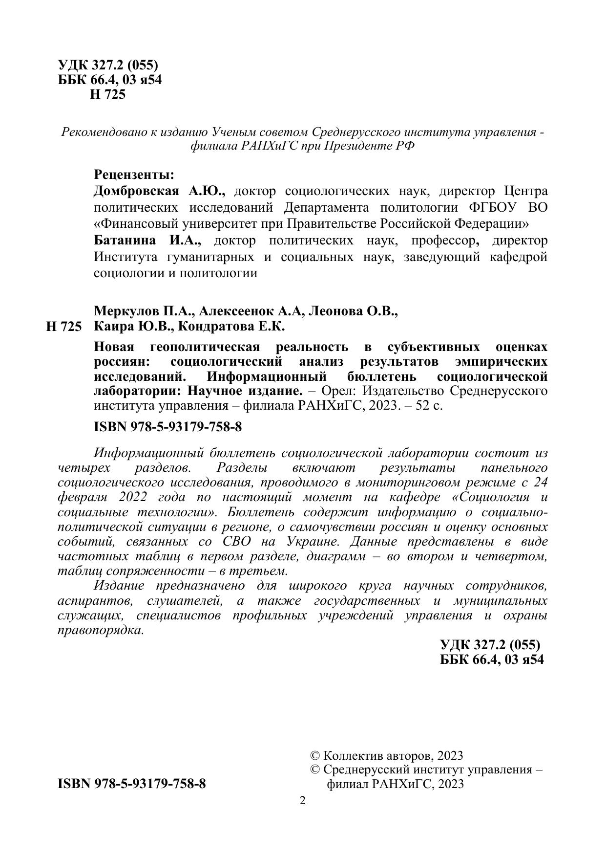 Новая геополитическая реальность в субъективных оценках россиян: социологический анализ результатов эмпирических исследований. Информационный бюллетень социологической лаборатории