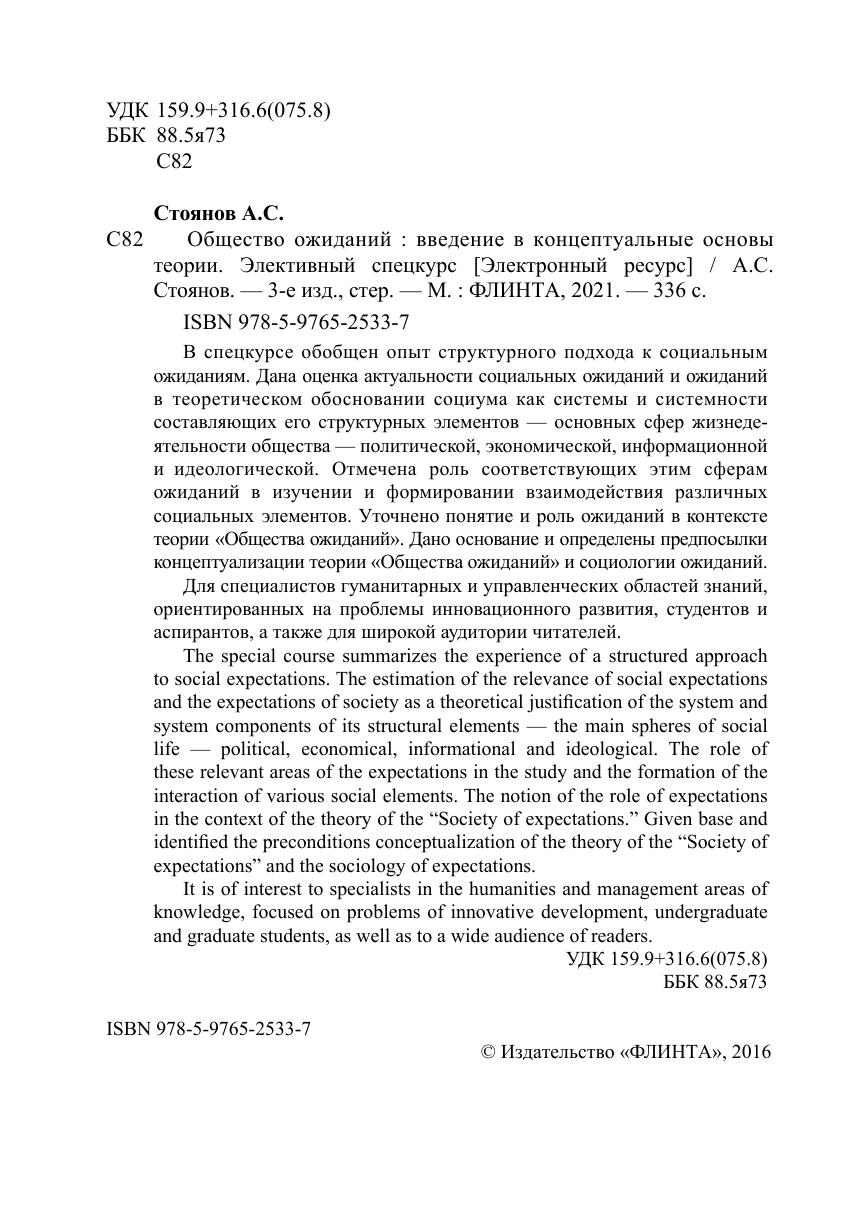 В спецкурсе обобщен опыт структурного подхода к социальным ожиданиям. Дана оценка актуальности социальных ожиданий и ожиданий в теоретическом обосновании социума как системы и системности составляющих его структурных элементов – основных сфер жизнедеятельности общества – политической, экономической, информационной и идеологической. Отмечена роль соответствующих этим сферам ожиданий в изучении и формировании взаимодействия различных социальных элементов. Уточнено понятие и роль ожиданий в контексте теории «Общества ожиданий». Дано основание и определены предпосылки концептуализации теории «Общества ожиданий» и социологии ожиданий.