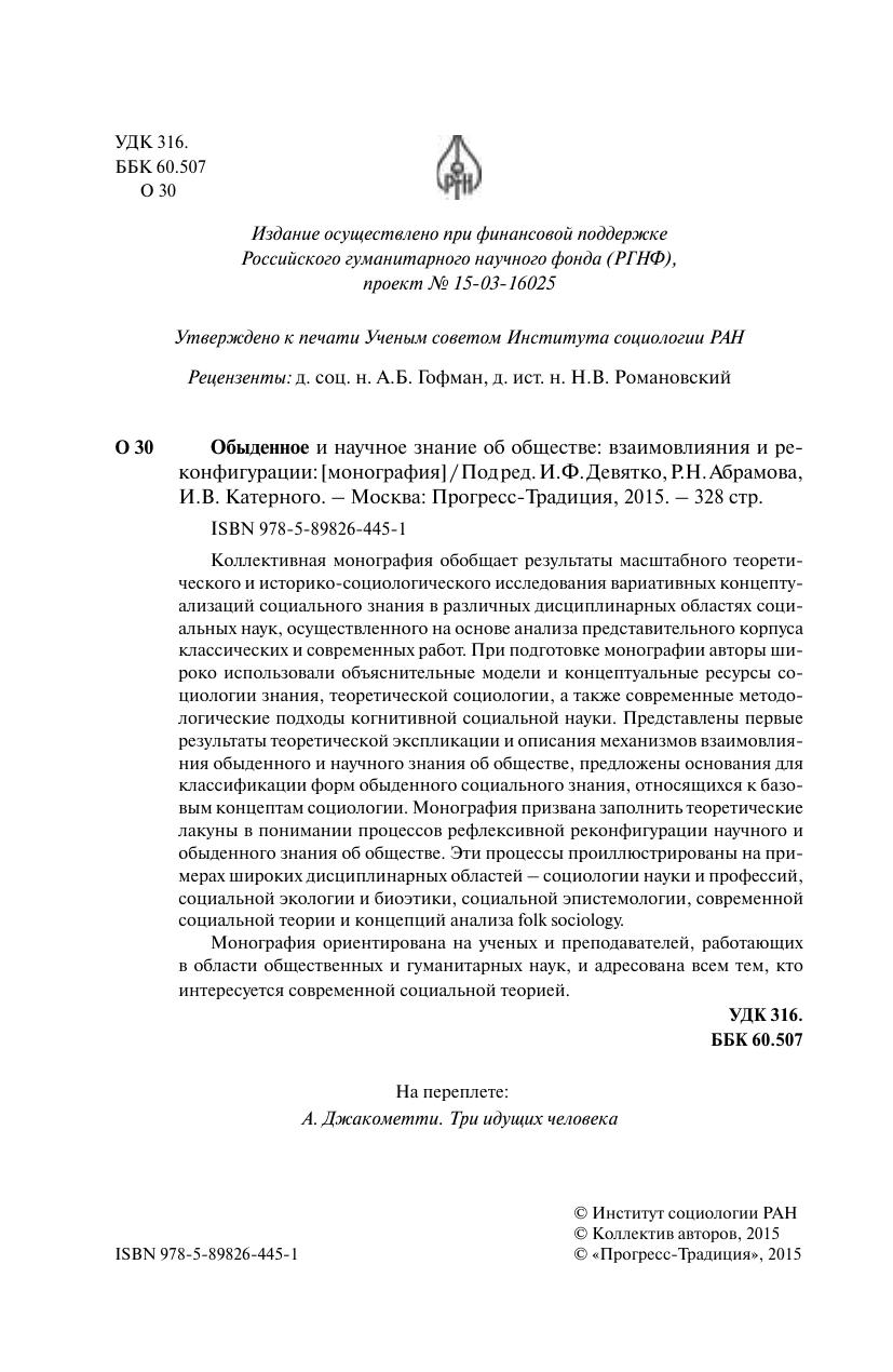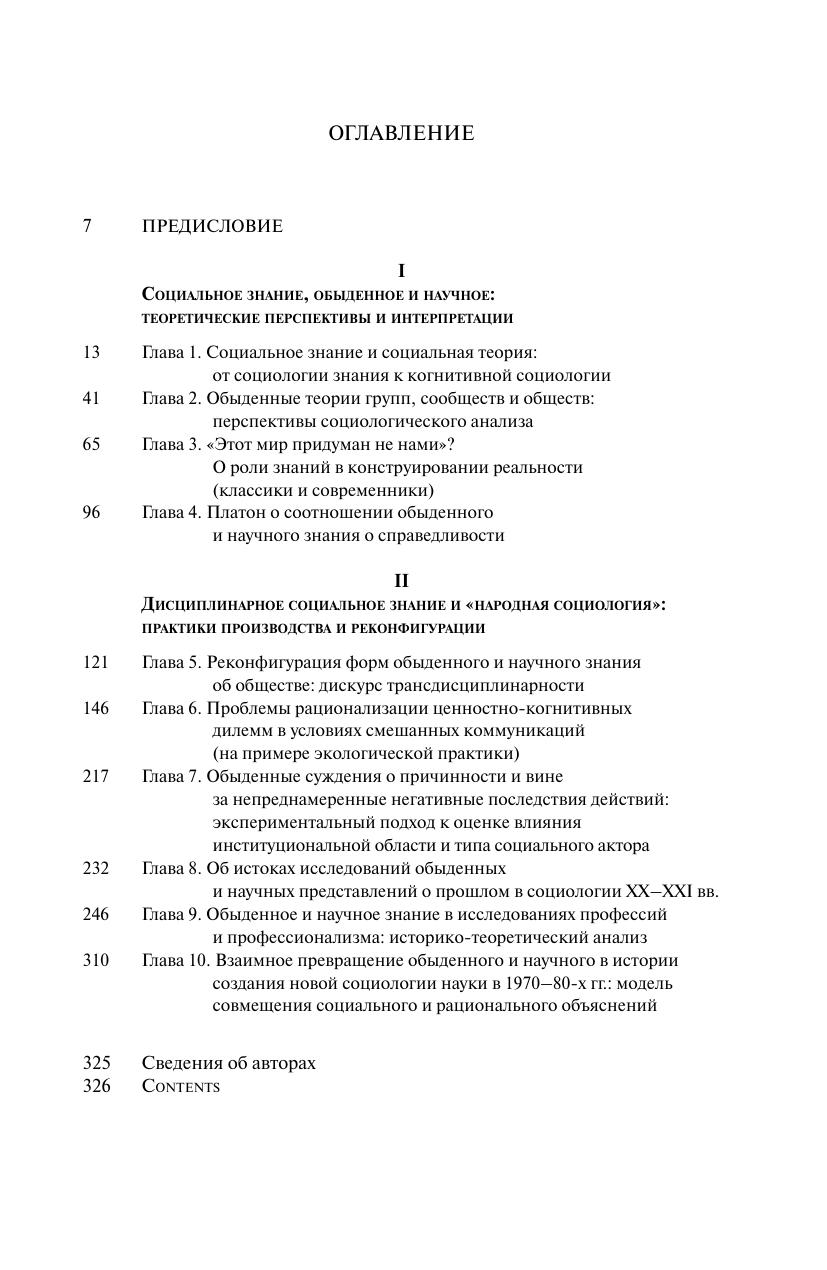 Коллективная монография обобщает результаты масштабного теоретического и историко-социологического исследования вариативных концептуализаций социального знания в различных дисциплинарных областях социальных наук, осуществленного на основе анализа представительного корпуса классических и современных работ. При подготовке монографии авторы широко использовали объяснительные модели и концептуальные ресурсы социологии знания, теоретической социологии, а также современные методологические подходы когнитивной социальной науки. Представлены первые результаты теоретической экспликации и описания механизмов взаимовлияния обыденного и научного знания об обществе, предложены основания для классификации форм обыденного социального знания, относящихся к базовым концептам социологии. Монография призвана заполнить теоретические лакуны в понимании процессов рефлексивной реконфигурации научного и обыденного знания об обществе. Эти процессы проиллюстрированы на примерах широких дисциплинарных областей – социологии науки и профессий, социальной экологии и биоэтики, социальной эпистемологии, современной социальной теории и концепций анализа folk sociology.