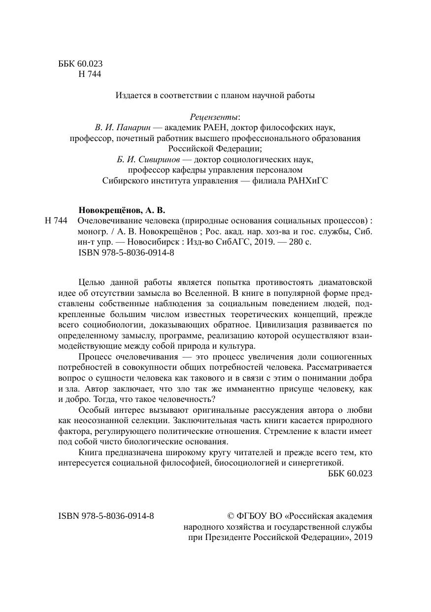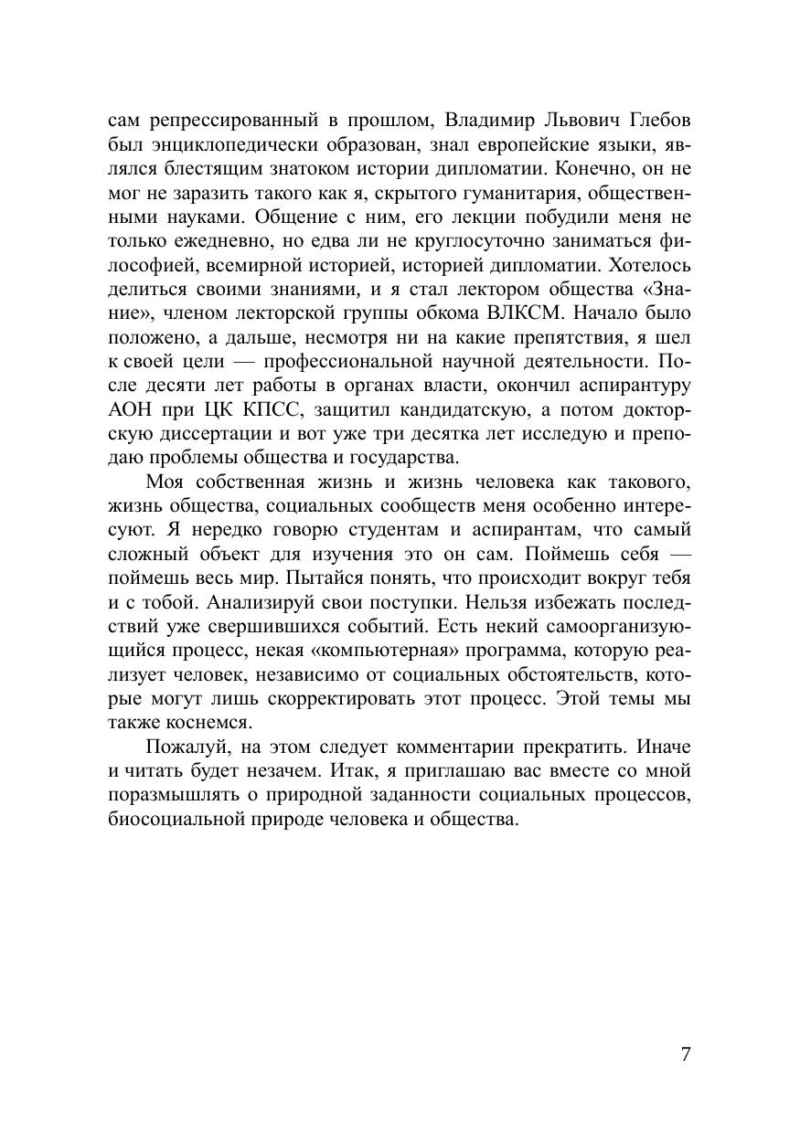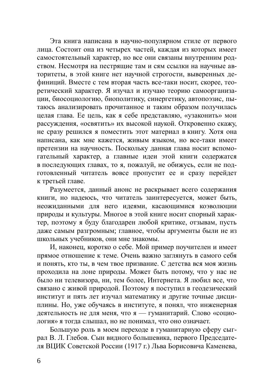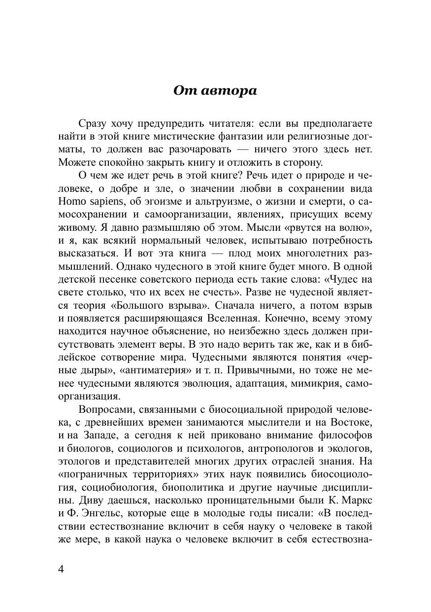 Целью данной работы является попытка противо стоять диаматовской иде е об отсутствии замысла во Вселенной . В книге в популярной форме пре дставл ены собственные наблюдения за социальным поведением людей, по дкрепленные большим числом известных теоретических конце п ций, прежде всего социобиологии, доказыва ющих обратное. Цивилизация развивается по определенному замыслу, программе, реализацию которой осуществляют вза имоде й ствующие между собой п рирода и к ультура. Процесс очеловечивания это процесс увеличения доли социогенных потребностей в совокупности общих потребностей человека. Рассматривается вопрос о сущности человека как так о вого и в связи с этим о понимании добра и зла. Автор заключает, что зло так же имманентно присущ е человеку как и добро. Тогда что такое человечность? Особый интерес вызывают ор игинальные рассуждения автора о любви как неосознанной селекции. Заключительная часть книги касается приро д ного фактора, регулирующего пол и тические отношения. Стремление к власти имеет под собой ч и сто биологические основания. Книга предназначена широкому кругу читателей и прежде всего тем кто интересуется социальной философией, биосоциологией и синергетикой.