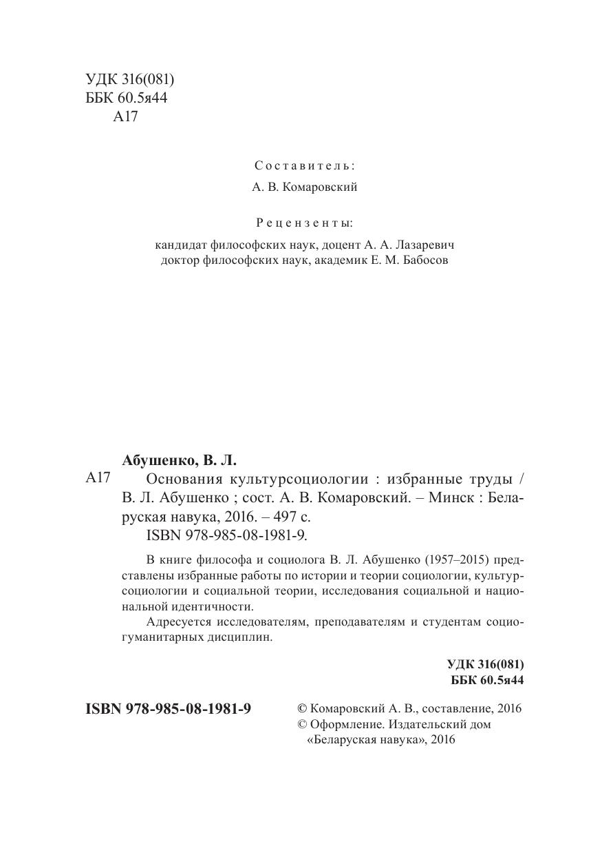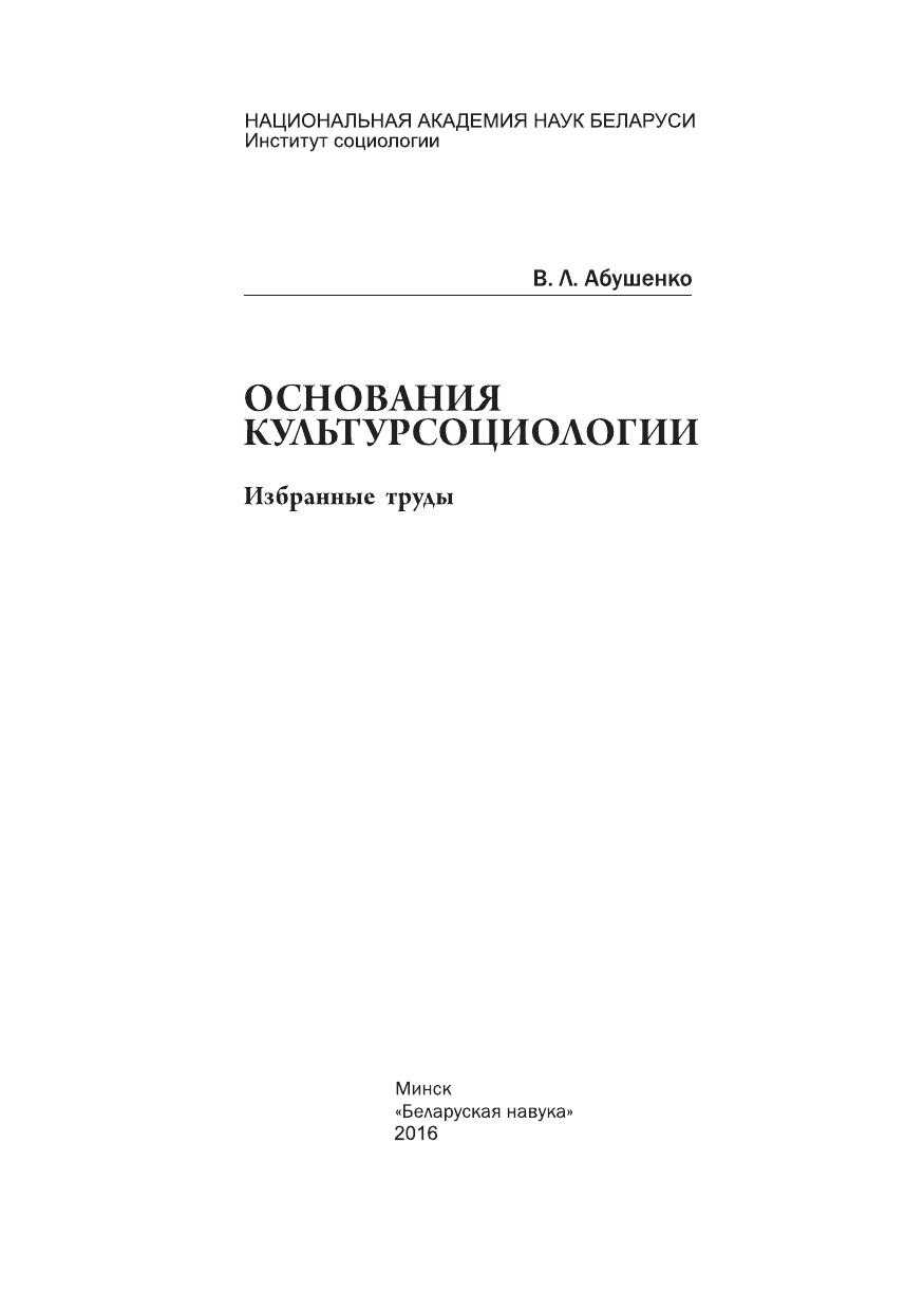 В книге философа и социолога В. Л. Абушенко (1957–2015) представлены избранные работы по истории и теории социологии, культур-социологии и социальной теории, исследования социальной и национальной идентичности. Адресуется исследователям, преподавателям и студентам социогуманитарных дисциплин.