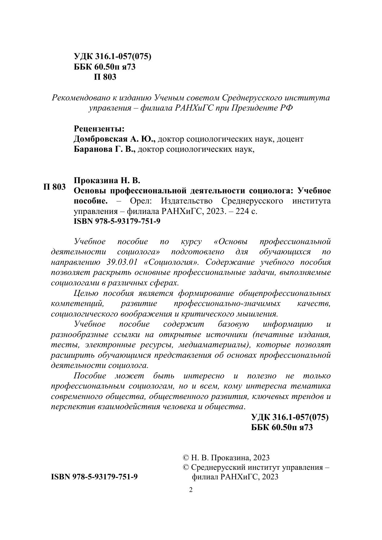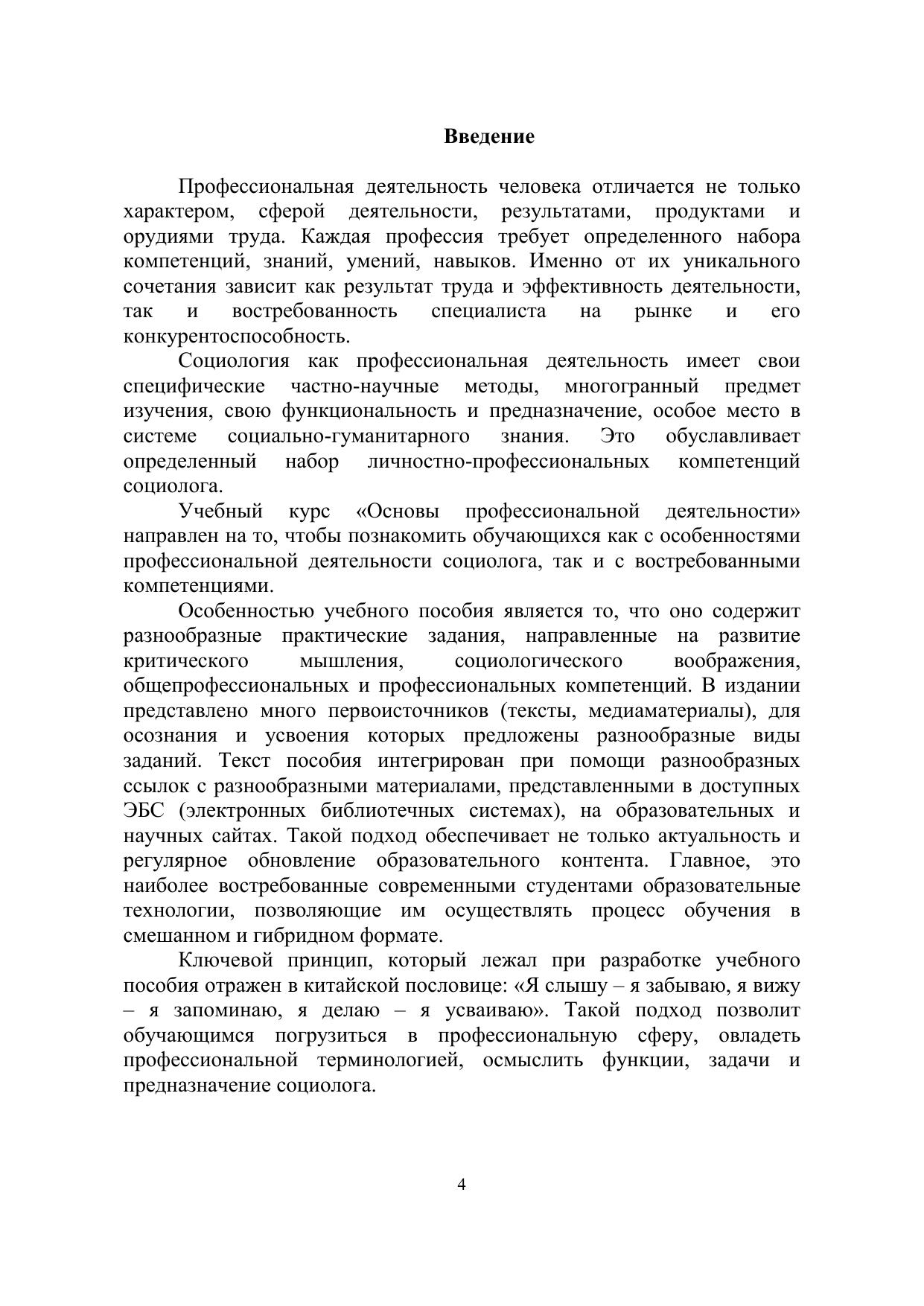 Учебное пособие по курсу «Основы профессиональной деятельности социолога» подготовлено для обучающихся по направлению 39.03.01 «Социология». Содержание учебного пособия позволяет раскрыть основные профессиональные задачи, выполняемые социологами в различных сферах. Целью пособия является формирование общепрофессиональных компетенций, развитие профессионально-значимых качеств, социологического воображения и критического мышления. Учебное пособие содержит базовую информацию и разнообразные ссылки на открытые источники (печатные издания, тесты, электронные ресурсы, медиаматериалы), которые позволят расширить обучающимся представления об основах профессиональной деятельности социолога. Пособие может быть интересно и полезно не только профессиональным социологам, но и всем, кому интересна тематика современного общества, общественного развития, ключевых трендов и перспектив взаимодействия человека и общества.