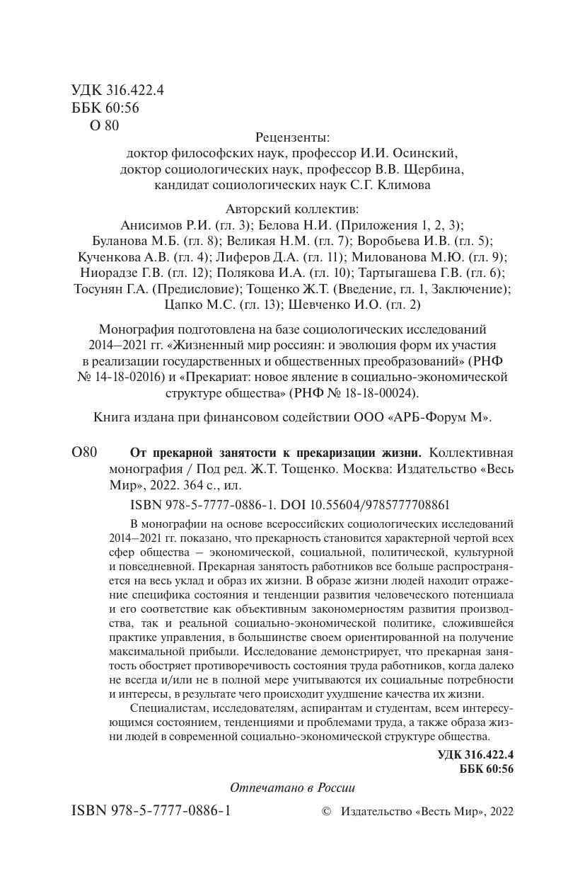 В монографии на основе всероссийских социологических исследований 2014–2021 гг. показано, что прекарность становится характерной чертой всех сфер общества – экономической, социальной, политической, культурной и повседневной. Прекарная занятость работников все больше распространяется на весь уклад и образ их жизни. В образе жизни людей находит отражение специфика состояния и тенденции развития человеческого потенциала и его соответствие как объективным закономерностям развития производства, так и реальной социально-экономической политике, сложившейся практике управления, в большинстве своем ориентированной на получение максимальной прибыли. Исследование демонстрирует, что прекарная занятость обостряет противоречивость состояния труда работников, когда далеко не всегда и/или не в полной мере учитываются их социальные потребности и интересы, в результате чего происходит ухудшение качества их жизни. Специалистам, исследователям, аспирантам и студентам, всем интересующимся состоянием, тенденциями и проблемами труда, а также образа жизни людей в современной социально-экономической структуре общества.