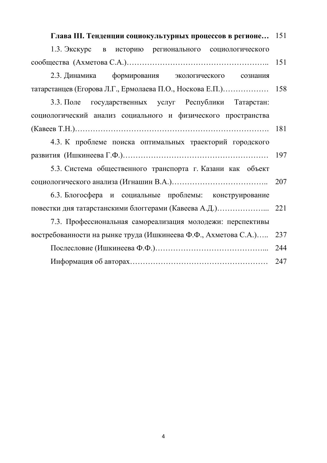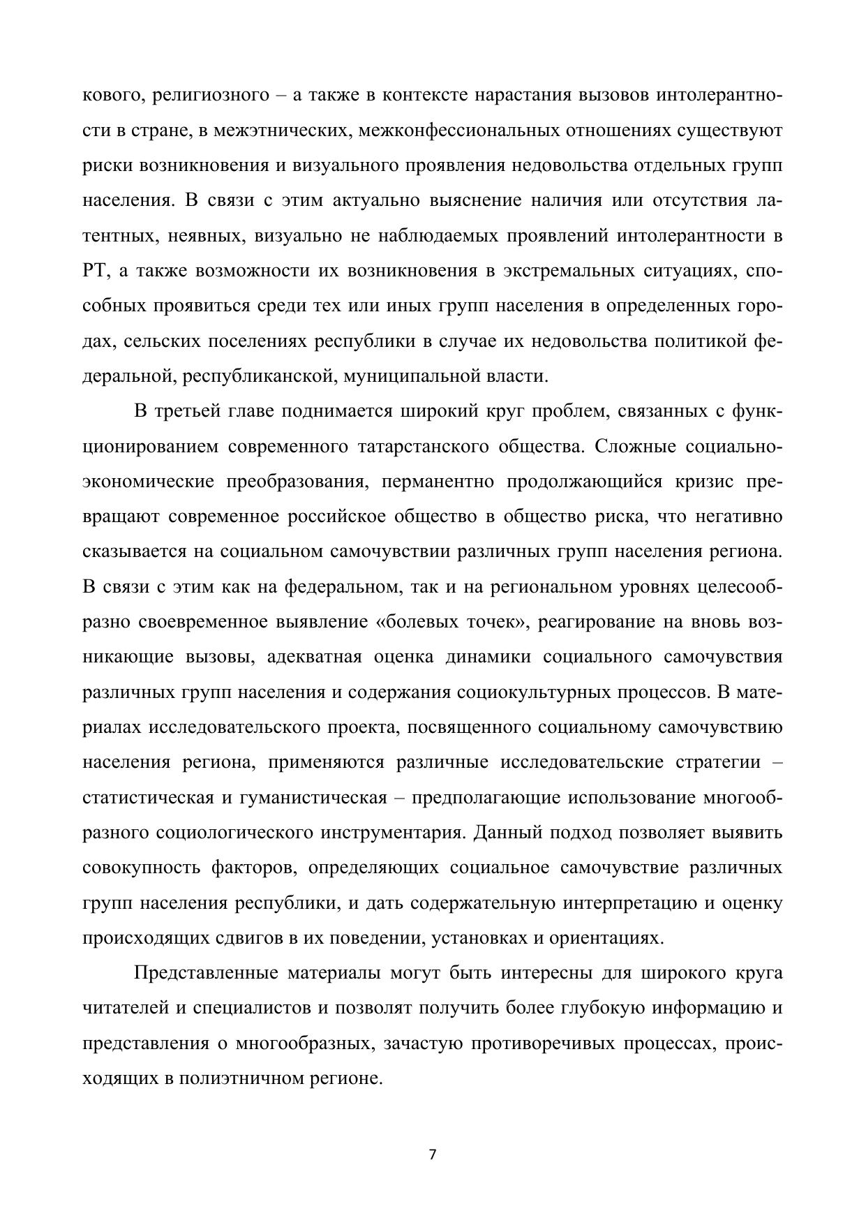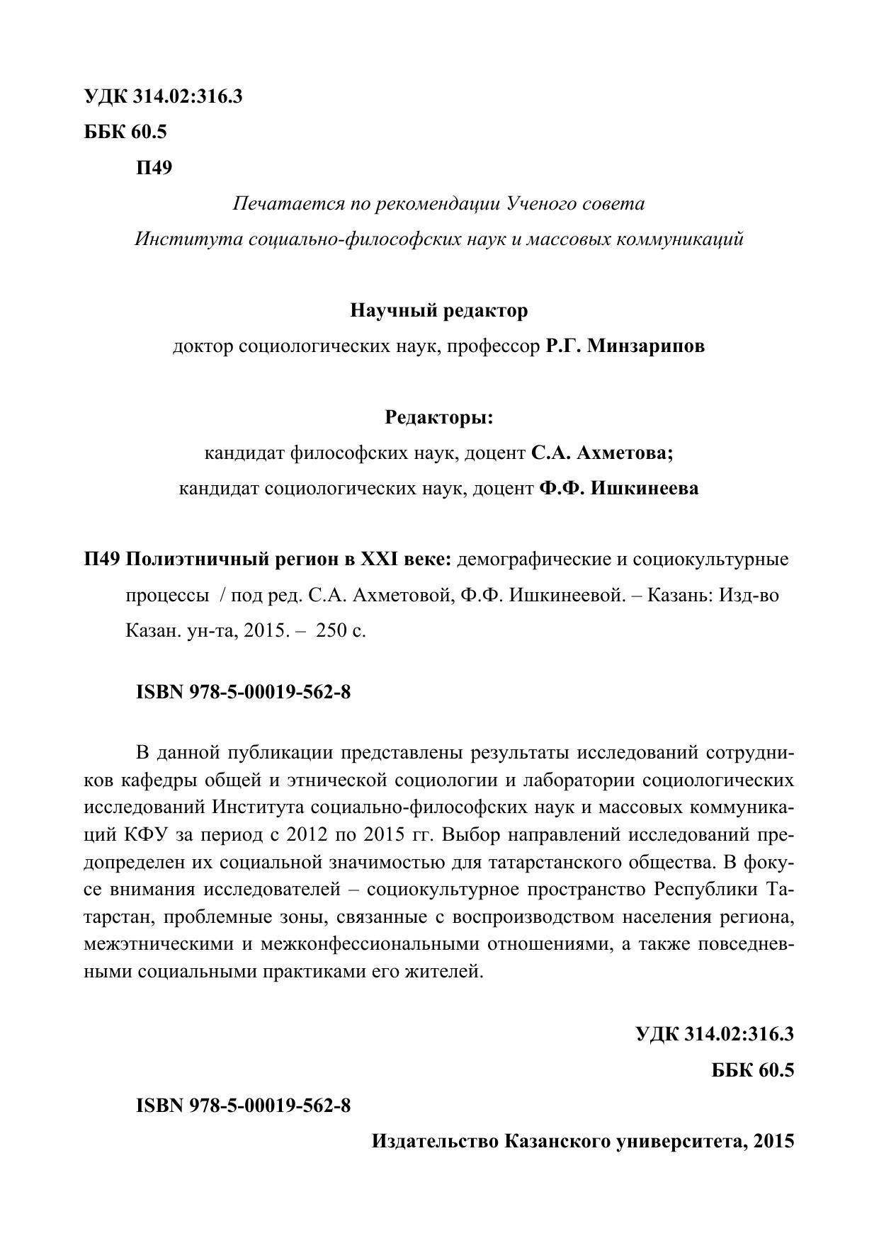 В данной публикации представлены результаты исследований сотрудников кафедры общей и этнической социологии и лаборатории социологических исследований Института социально-философских наук и массовых коммуникаций КФУ за период с 2012 по 2015 гг. Выбор направлений исследований предопределен их социальной значимостью для татарстанского общества. В фокусе внимания исследователей – социокультурное пространство Республики Татарстан, проблемные зоны, связанные с воспроизводством населения региона, межэтническими и межконфессиональными отношениями, а также повседневными социальными практиками его жителей.