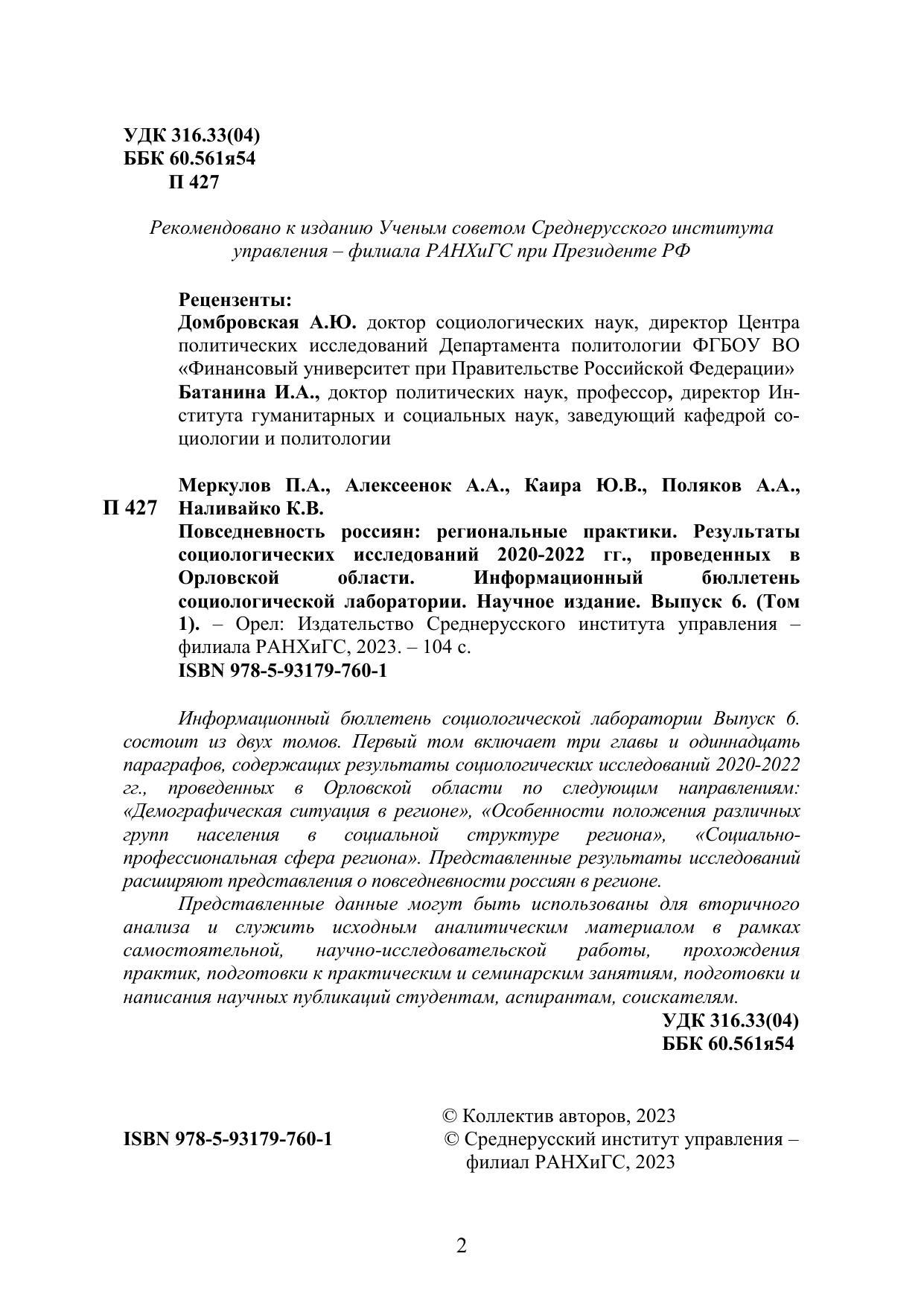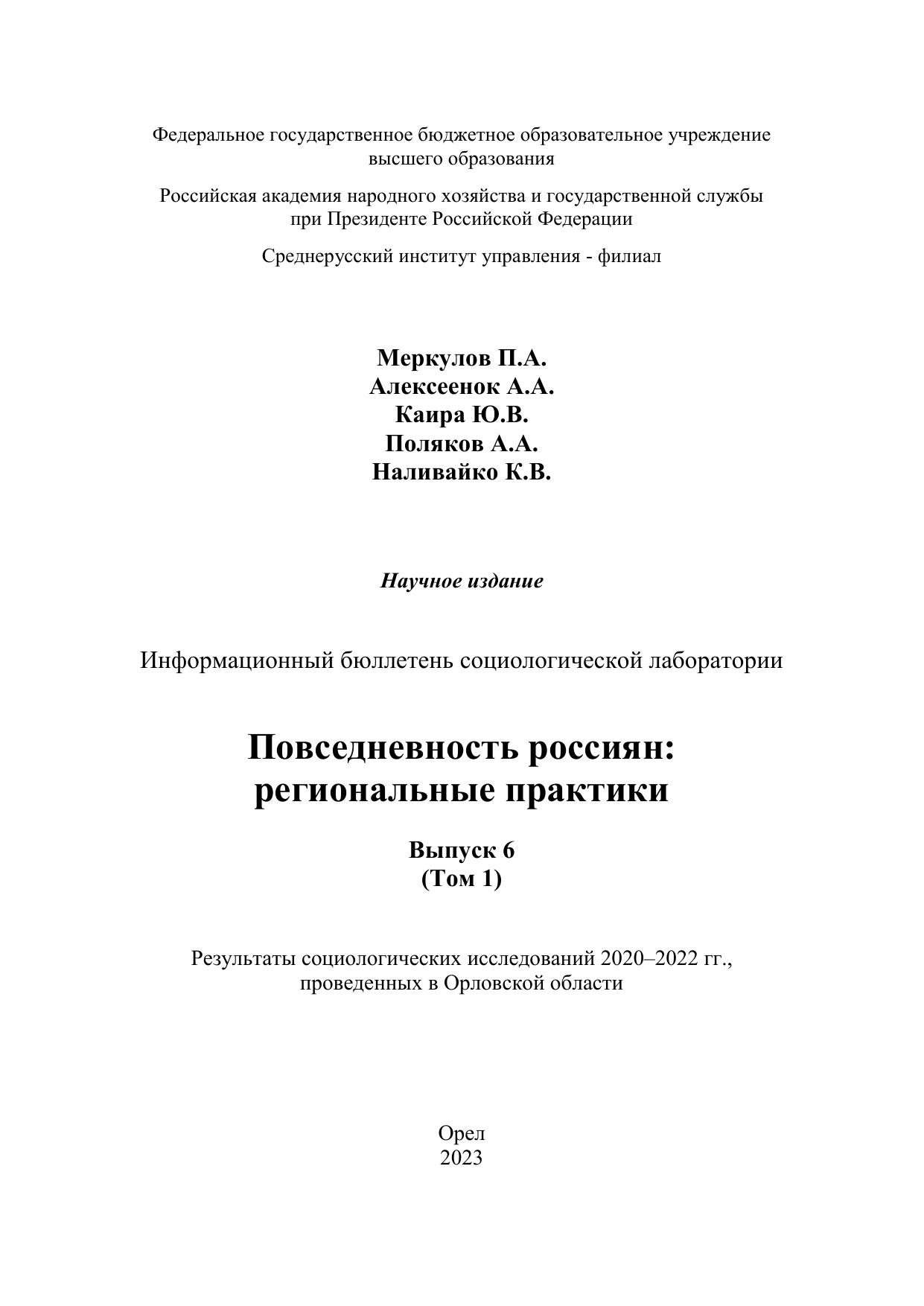 Повседневность россиян: региональные практики. Результаты социологических исследований 2020-2022 гг., проведенных в Орловской области. Информационный бюллетень социологической лаборатории. Выпуск 6. (Том1)