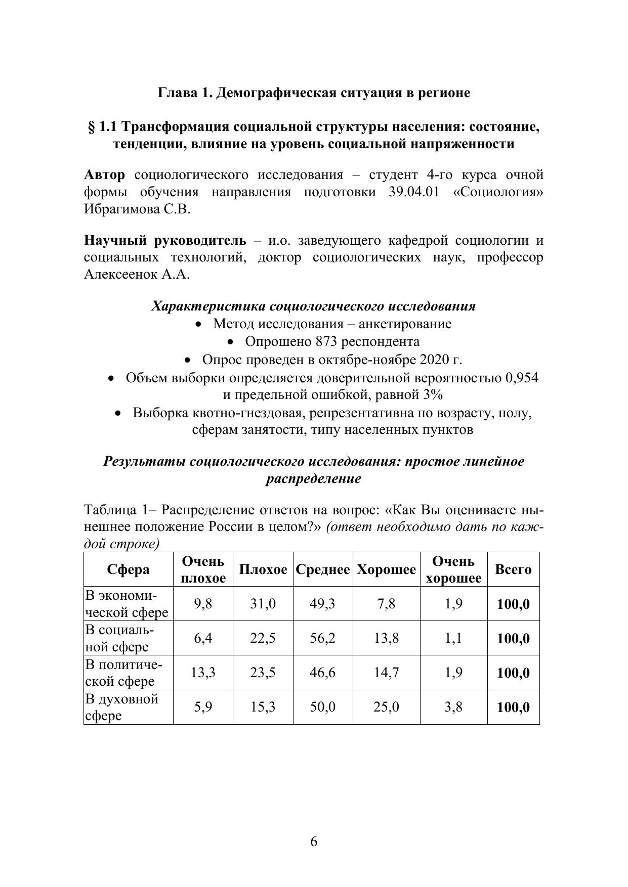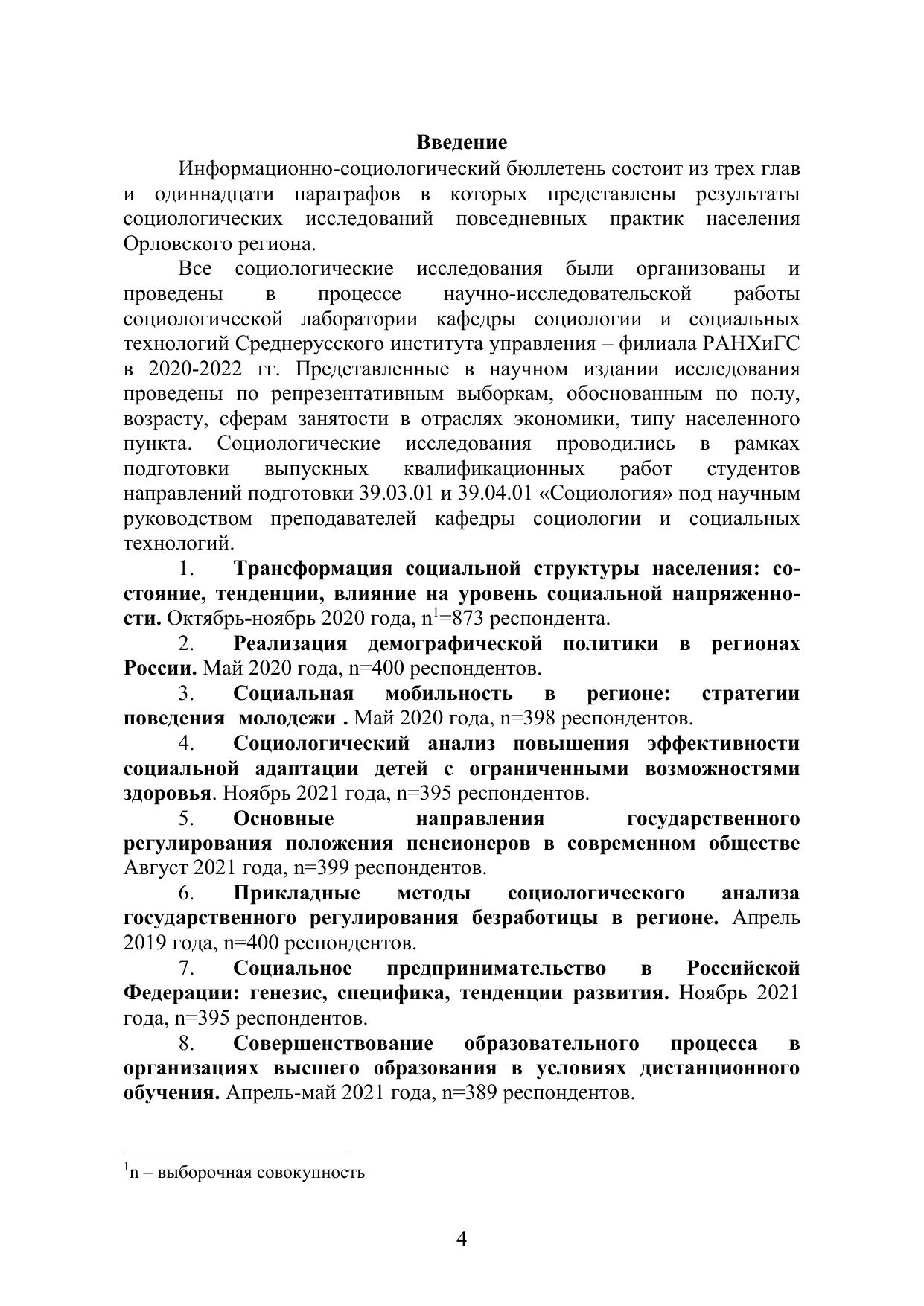 Информационный бюллетень социологической лаборатории Выпуск 6. состоит из двух томов. Первый том включает три главы и одиннадцать параграфов, содержащих результаты социологических исследований 2020-2022 гг., проведенных в Орловской области по следующим направлениям: «Демографическая ситуация в регионе», «Особенности положения различных групп населения в социальной структуре региона», «Социальнопрофессиональная сфера региона». Представленные результаты исследований расширяют представления о повседневности россиян в регионе. Представленные данные могут быть использованы для вторичного анализа и служить исходным аналитическим материалом в рамках самостоятельной, научно-исследовательской работы, прохождения практик, подготовки к практическим и семинарским занятиям, подготовки и написания научных публикаций студентам, аспирантам, соискателям.