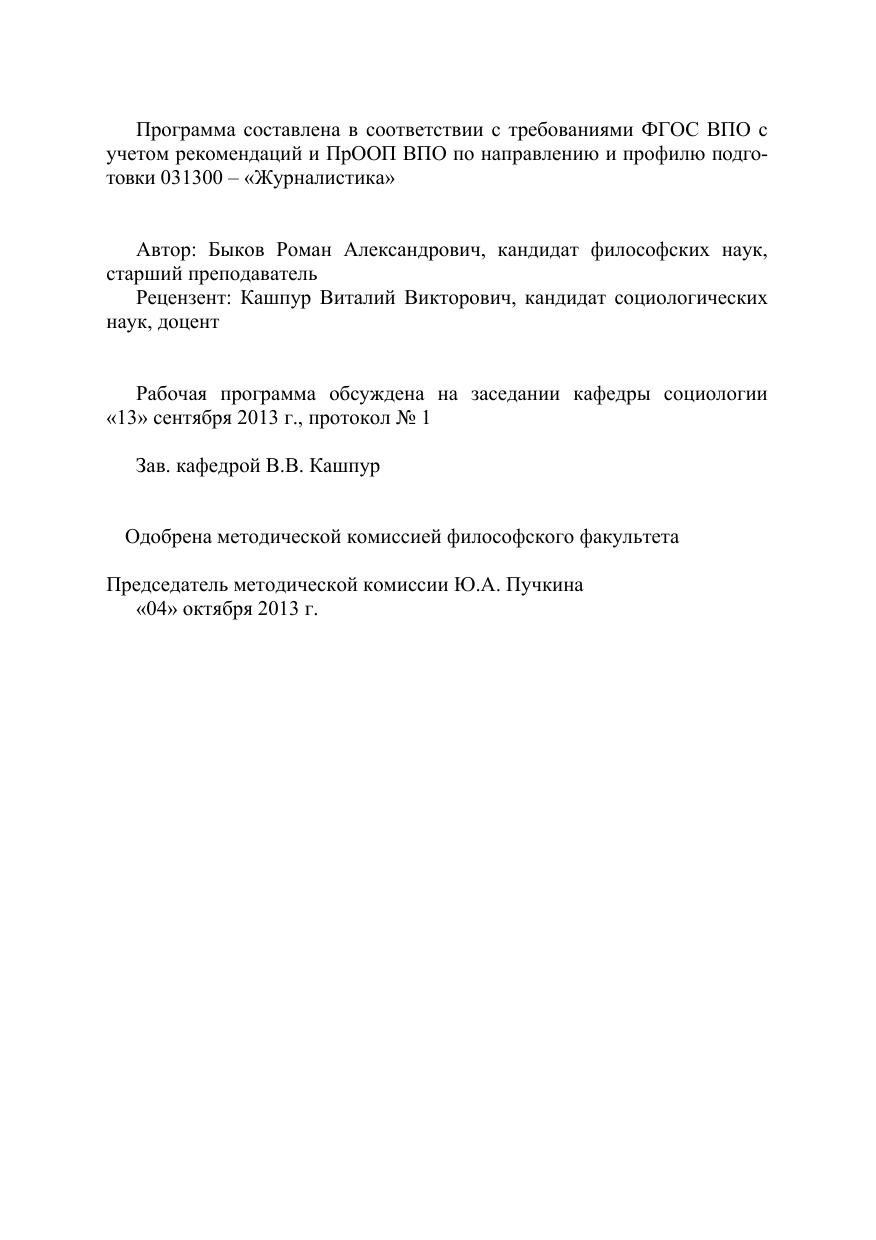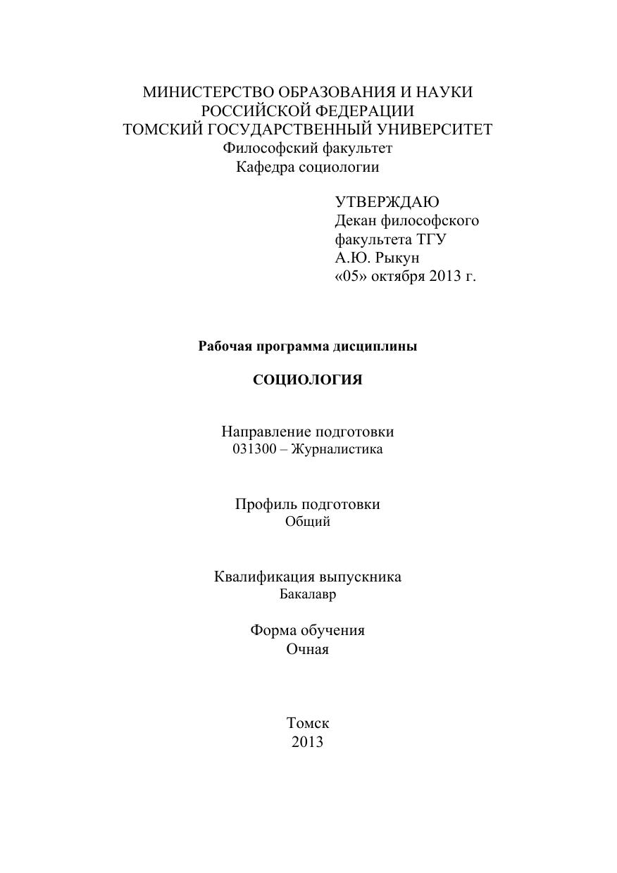 Рабочая программа дисциплины «Социология». Направление подготовки: 031300 – Журналистика