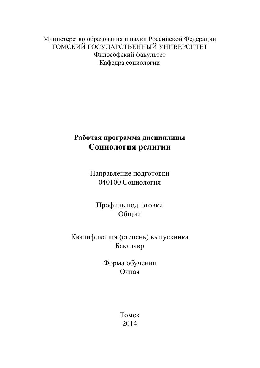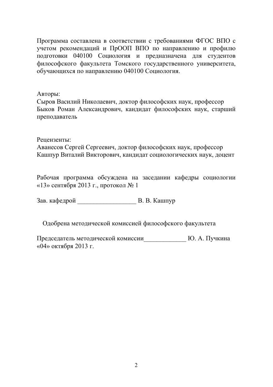 Программа составлена в соответствии с требованиями ФГОС ВПО с учетом рекомендаций и ПрООП ВПО по направлению и профилю подготовки 040100 Социология и предназначена для студентов философского факультета Томского государственного университета, обучающихся по направлению 040100 Социология.