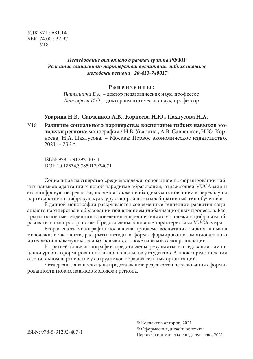 В данной монографии раскрываются современные тенденции развития социального партнерства в образовании под влиянием глобализационных процессов. Раскрыты основные тенденции в поведении и предпочтениях молодежи в цифровом образовательном пространстве. Представлены основные характеристики VUCА-мира.
