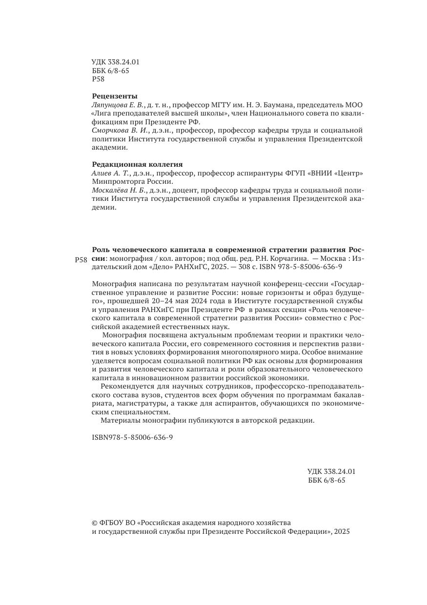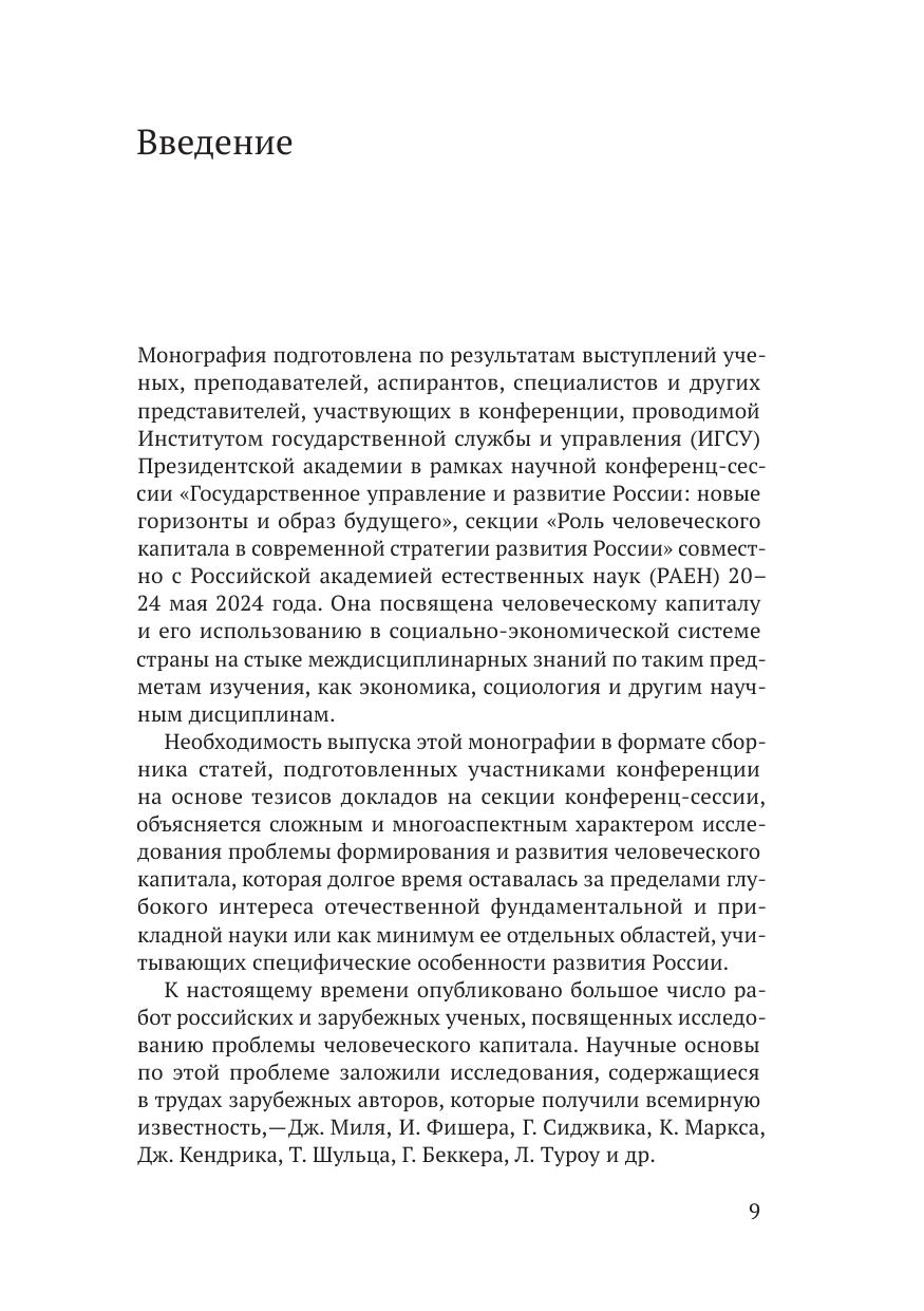 Монография написана по результатам научной конференц-сессии «Государственное управление и развитие России: новые горизонты и образ будущего», прошедшей 20–24 мая 2024 года в Институте государственной службы и управления РАНХиГС при Президенте РФ в рамках секции «Роль человеческого капитала в современной стратегии развития России» совместно с Российской академией естественных наук. Монография посвящена актуальным проблемам теории и практики человеческого капитала России, его современного состояния и перспектив развития в новых условиях формирования многополярного мира. Особое внимание уделяется вопросам социальной политики РФ как основы для формирования и развития человеческого капитала и роли образовательного человеческого капитала в инновационном развитии российской экономики. Рекомендуется для научных сотрудников, профессорско-преподавательского состава вузов, студентов всех форм обучения по программам бакалавриата, магистратуры, а также для аспирантов, обучающихся по экономическим специальностям. Материалы монографии публикуются в авторской редакции.