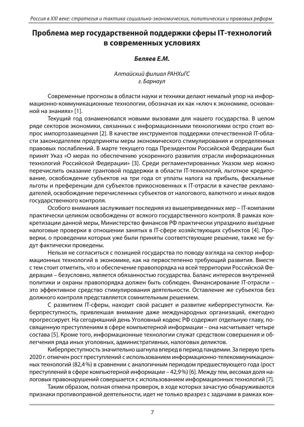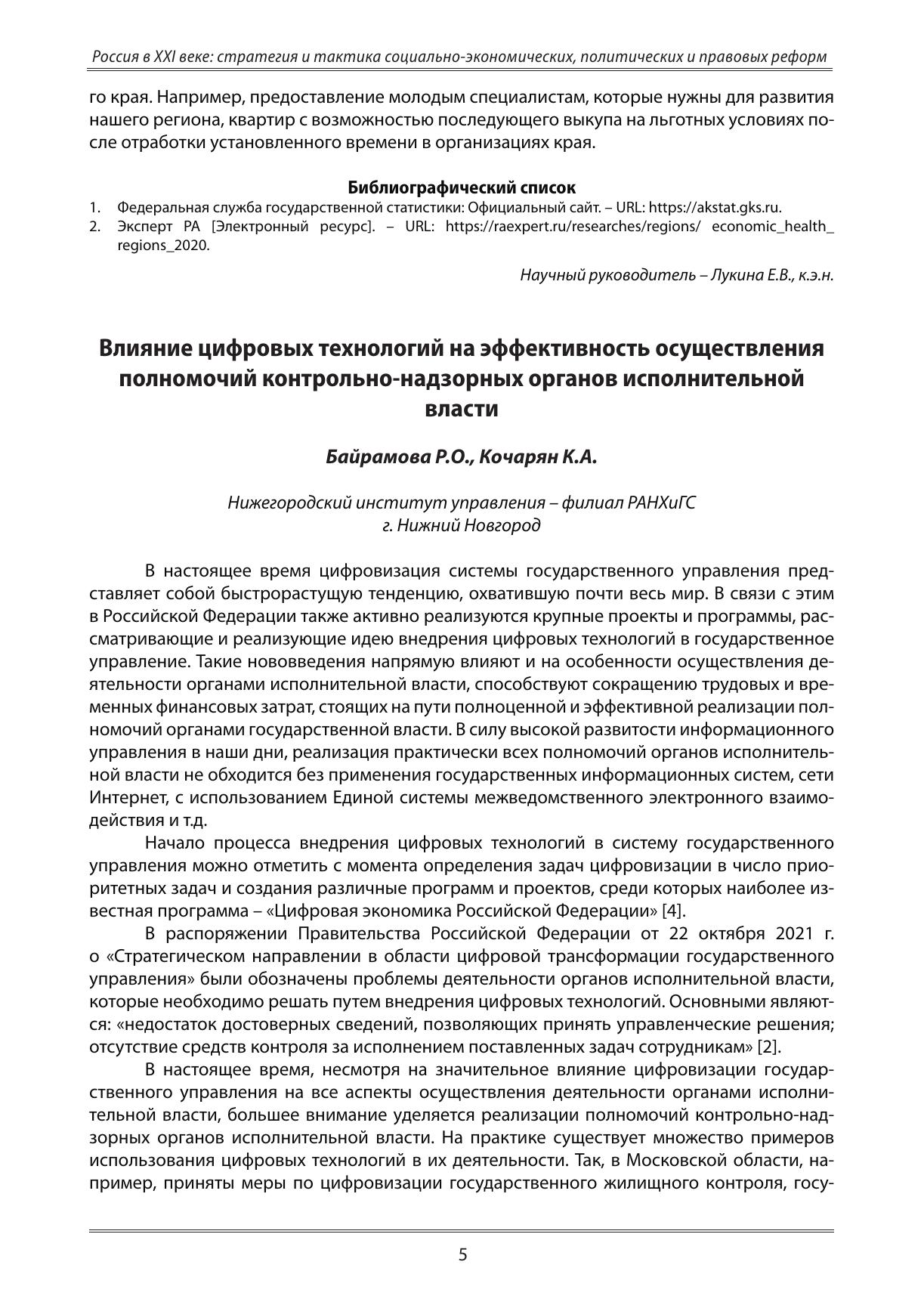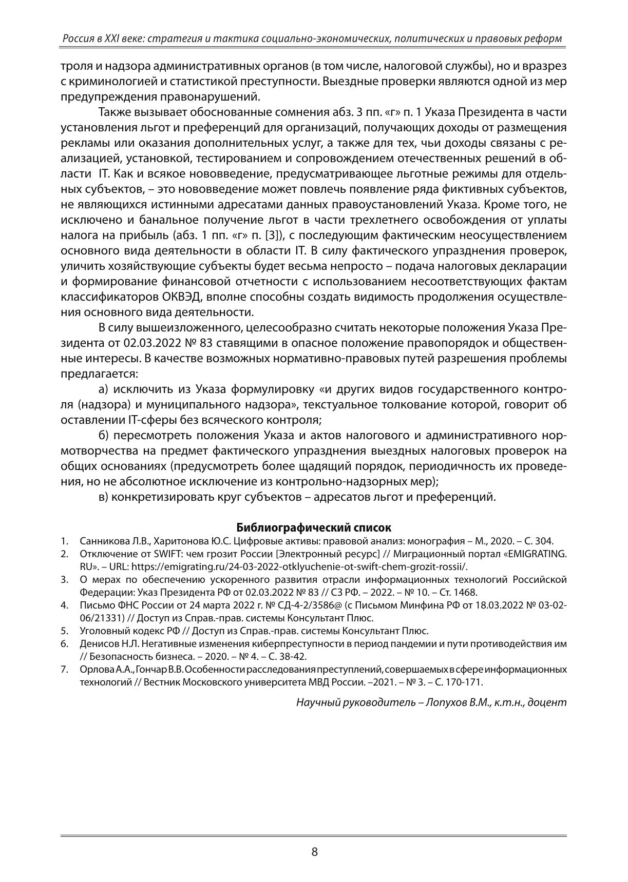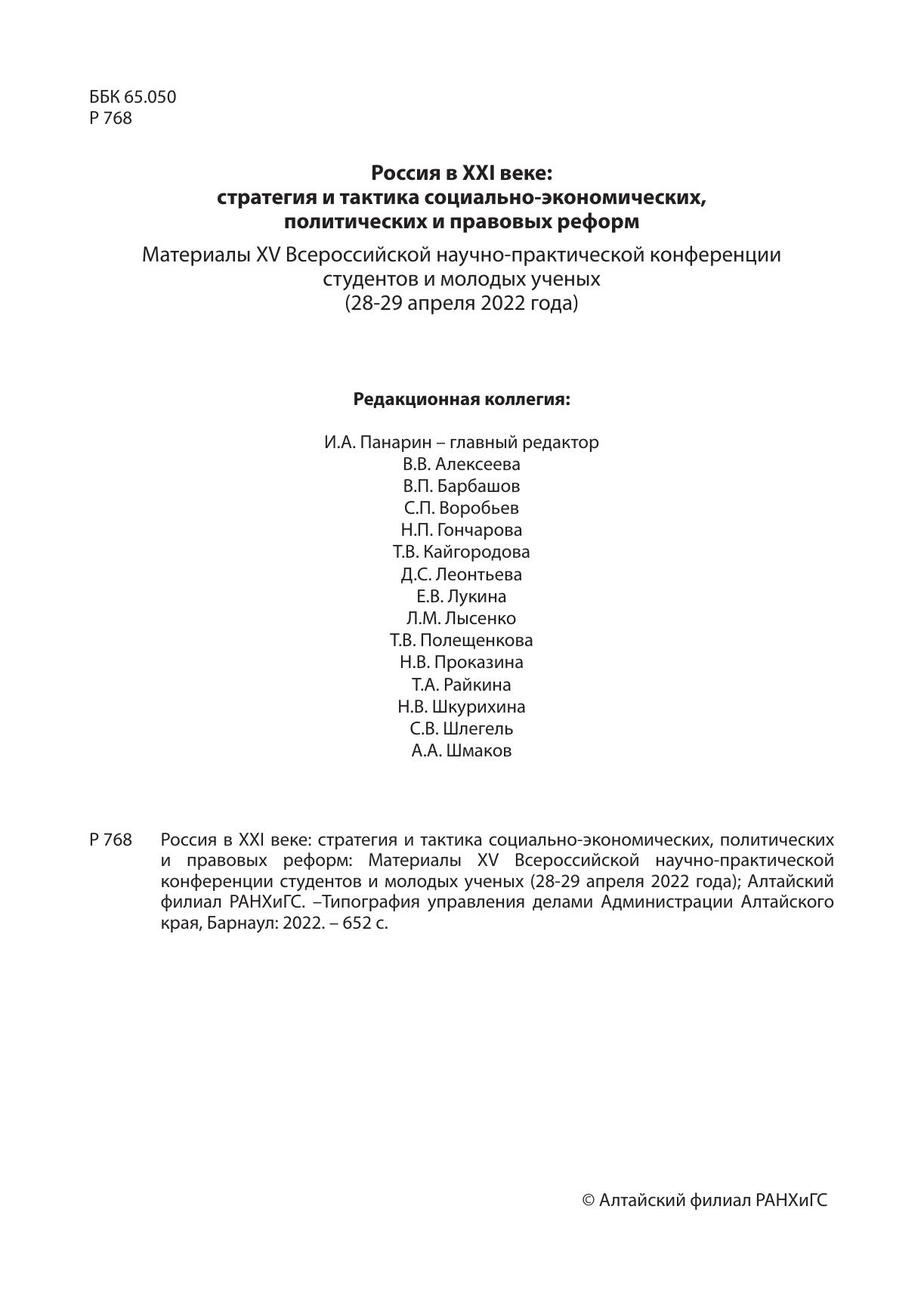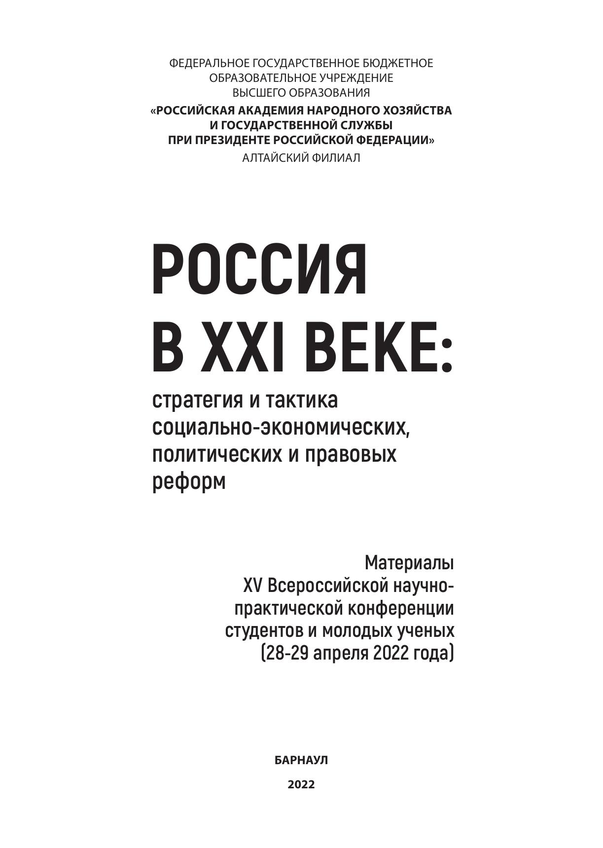 Россия в XXI веке: стратегия и тактика социально-экономических, политических и правовых реформ: Материалы XV Всероссийской научно-практической конференции студентов и молодых ученых (28-29 апреля 2022 года)