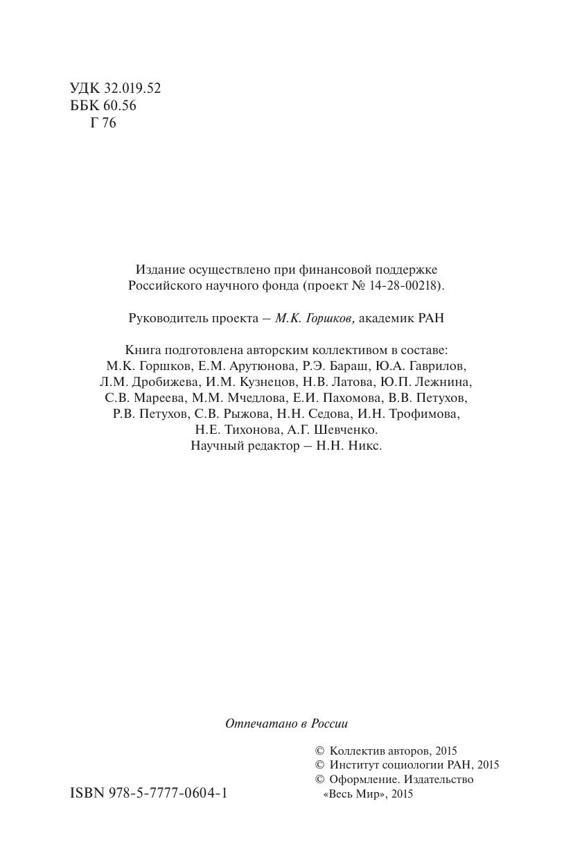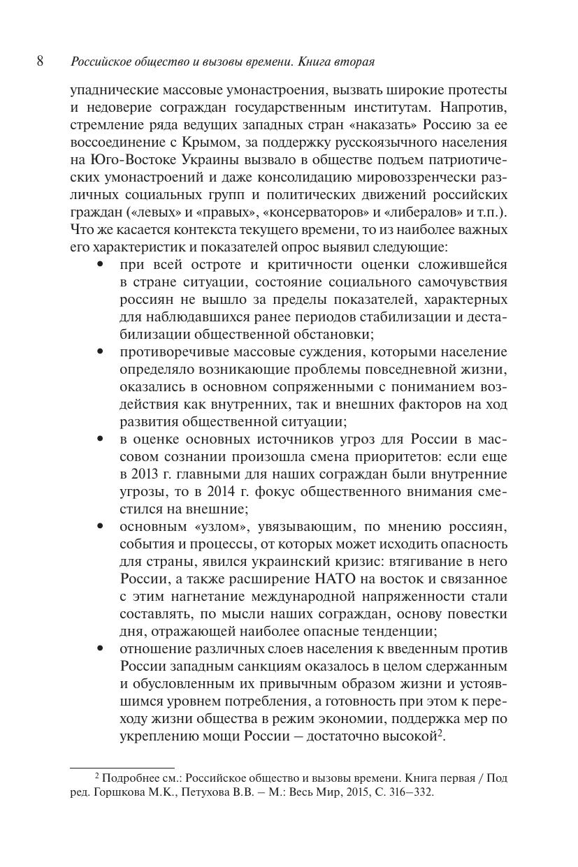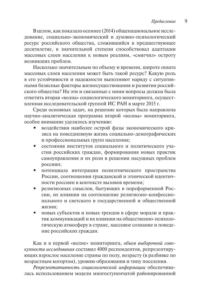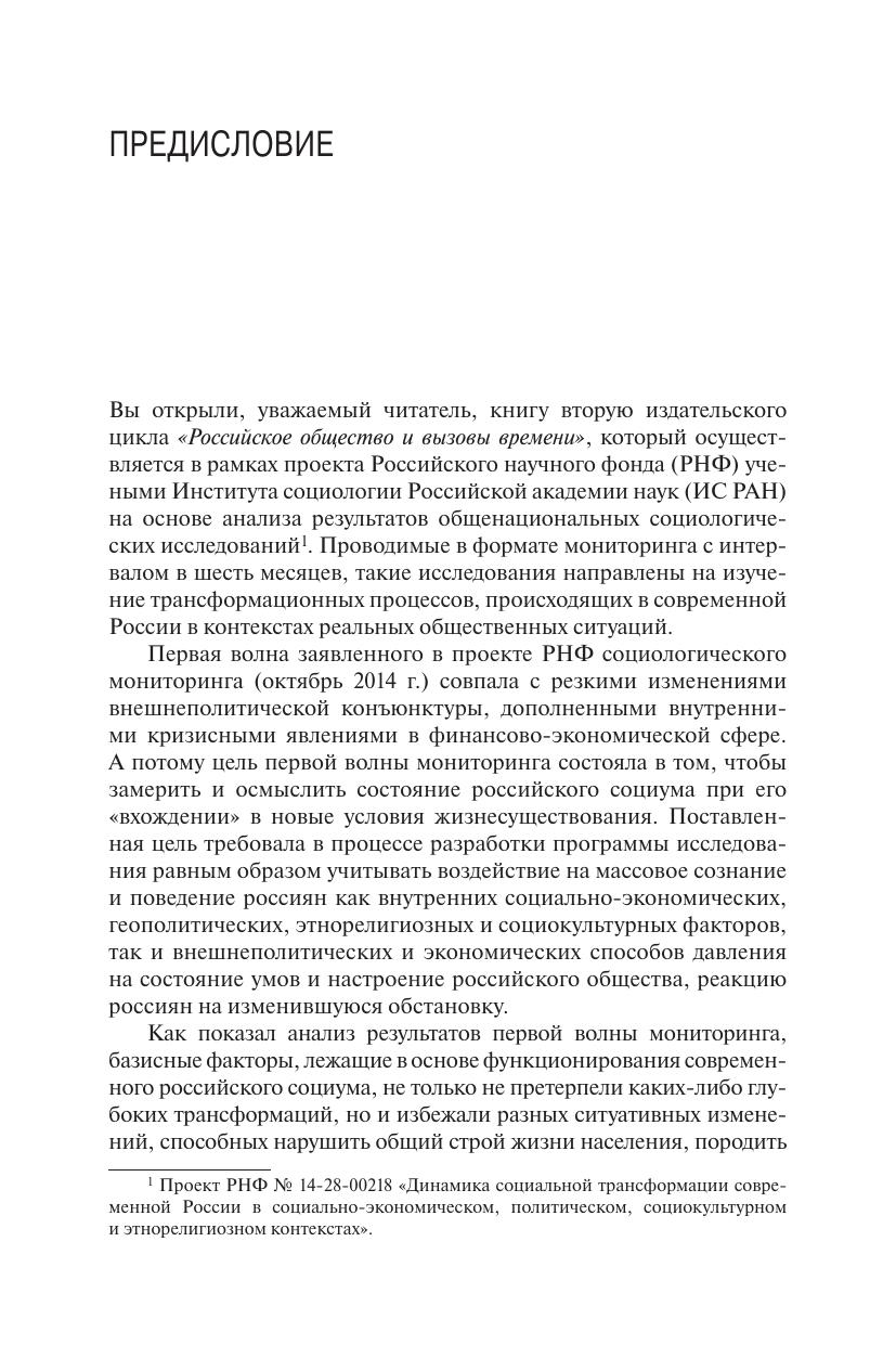 В книге представлен многоаспектный анализ второй «волны» общенационального социологического мониторинга состояния и динамики российского общества в контексте вызовов и угроз, обусловленных как воздействием внешнеполитических событий и процессов, так и влиянием экономического кризиса на повседневную жизнь российских граждан. Рассматриваются особенности социально-психологического состояния общества, установок экономического поведения, духовнонравственные и этнорелигиозные ориентации россиян в кризисных условиях, выделяются ситуативные и базисные факторы, определяющие общий настрой российского социума на переломном этапе его исторического развития. В целях сопоставительного анализа используются данные многочисленных общенациональных социологических исследований, проведенных в предшествующие годы российских реформ.