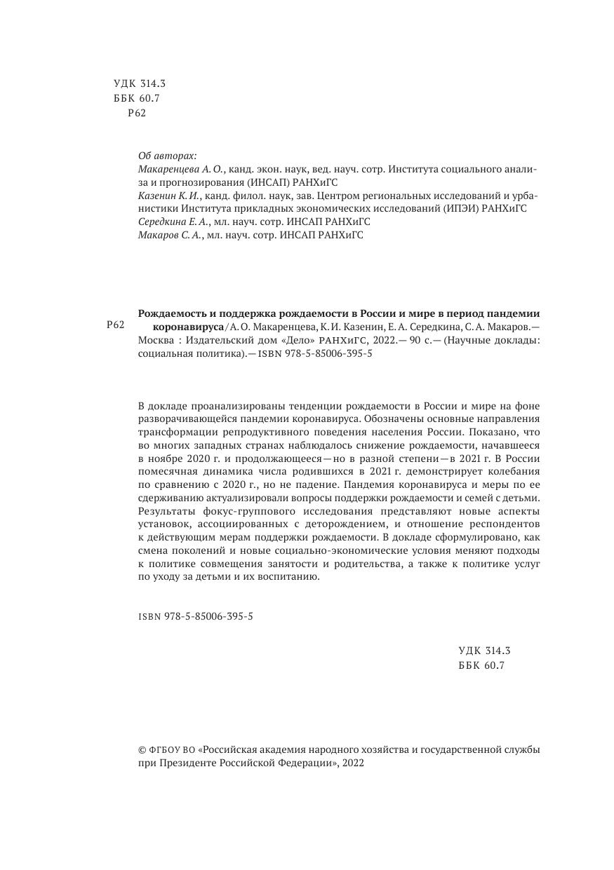 В докладе проанализированы тенденции рождаемости в России и мире на фоне разворачивающейся пандемии коронавируса. Обозначены основные направления трансформации репродуктивного поведения населения России. Показано, что во многих западных странах наблюдалось снижение рождаемости, начавшееся в ноябре 2020 г. и продолжающееся — но в разной степени — в 2021 г. В России помесячная динамика числа родившихся в 2021 г. демонстрирует колебания по сравнению с 2020 г., но не падение. Пандемия коронавируса и меры по ее сдерживанию актуализировали вопросы поддержки рождаемости и семей с детьми. Результаты фокус-группового исследования представляют новые аспекты установок, ассоциированных с деторождением, и отношение респондентов к действующим мерам поддержки рождаемости. В докладе сформулировано, как смена поколений и новые социально-экономические условия меняют подходы к политике совмещения занятости и родительства, а также к политике услуг по уходу за детьми и их воспитанию.