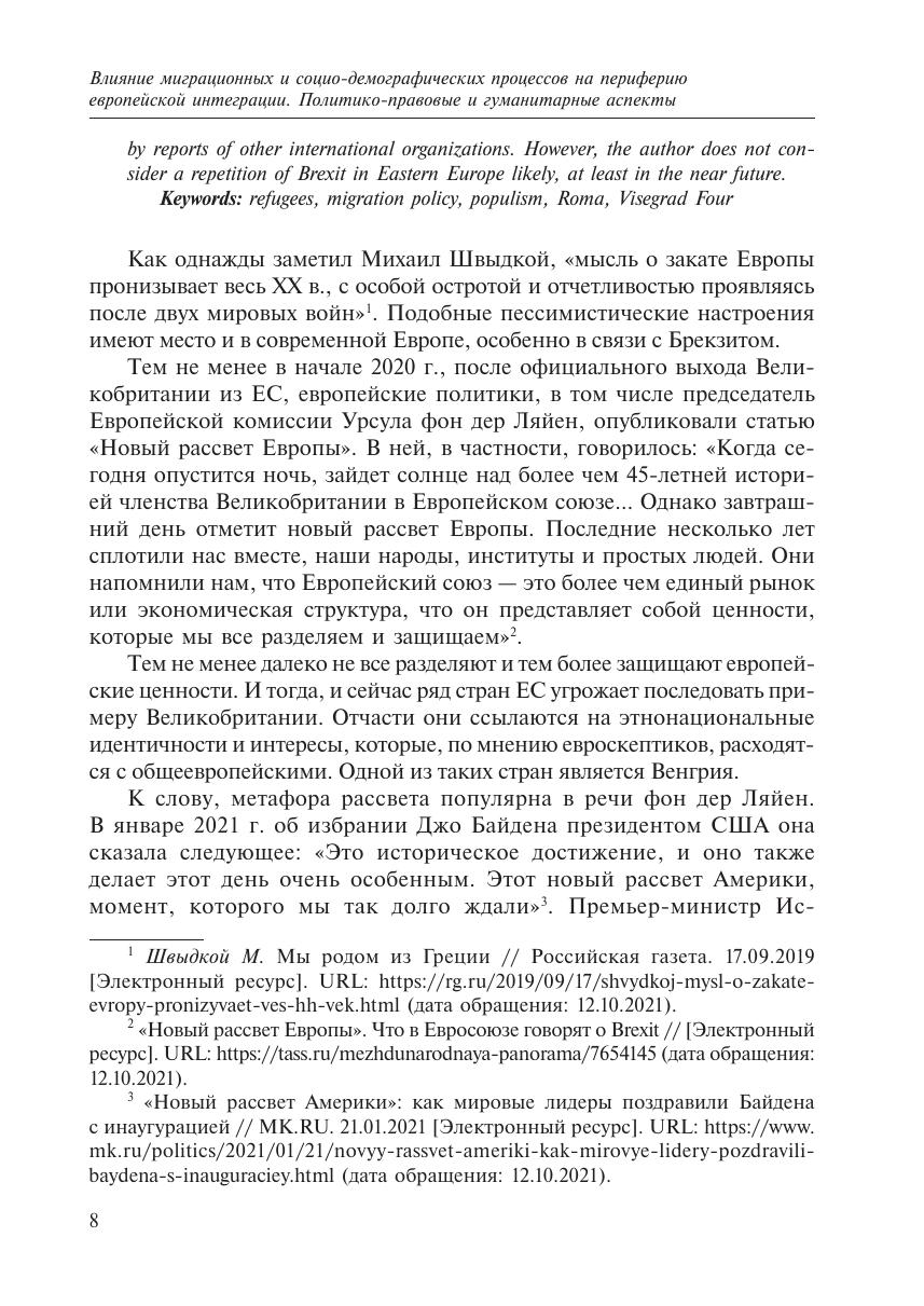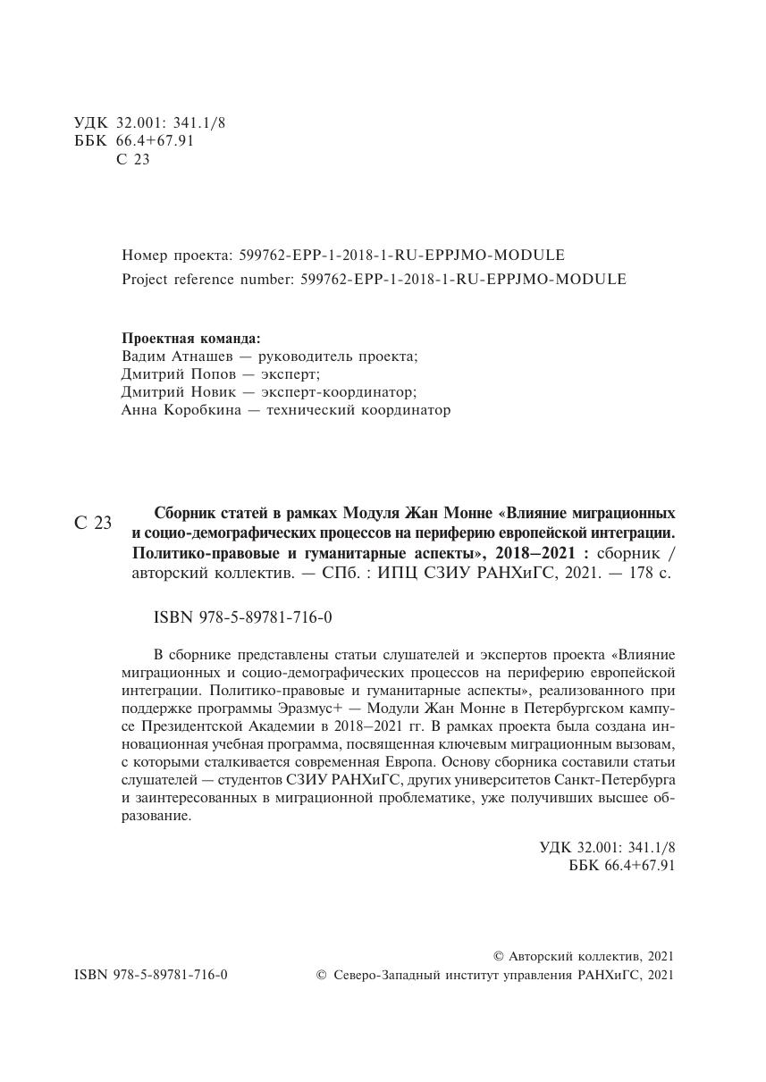 Сборник статей в рамках Модуля Жан Монне «Влияние миграционных и социо-демографических процессов на периферию европейской интеграции. Политико-правовые и гуманитарные аспекты», 2018–2021: сборник