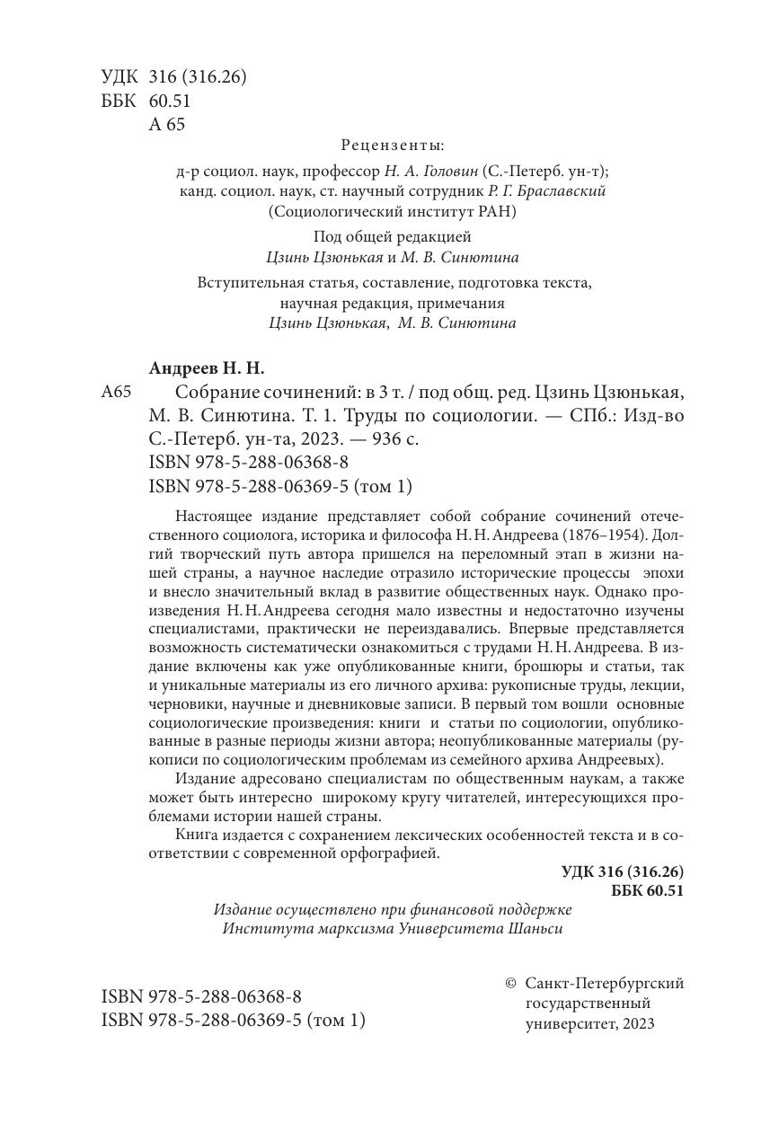 Настоящее издание представляет собой собрание сочинений отечественного социолога, историка и философа Н.Н. Андреева (1876-1954). Долгий творческий путь автора пришелся на переломный этап в жизни нашей страны, а научное наследие отразило исторические процессы эпохи и внесло значительный вклад в развитие общественных наук. Однако произведения Н.Н. Андреева сегодня мало известны и недостаточно изучены специалистами, практически не переиздавались. Впервые представляется возможность систематически ознакомиться с трудами Н.Н. Андреева. В издание включены как уже опубликованные книги, брошюры и статьи, так и уникальные материалы из его личного архива: рукописные труды, лекции, черновики, научные и дневниковые записи. В первый том вошли основные социологические произведения: книги и статьи по социологии, опубликованные в разные периоды жизни автора; неопубликованные материалы ( рукописи по социологическим проблемам из семейного архива Андреевых).Издание адресовано специалистам по общественным наукам, а также может быть интересно широкому кругу читателей, интересующихся проблемами истории нашей страны. Книга издается с сохранением лексических особенностей текста и в соответствии с современной орфографией.