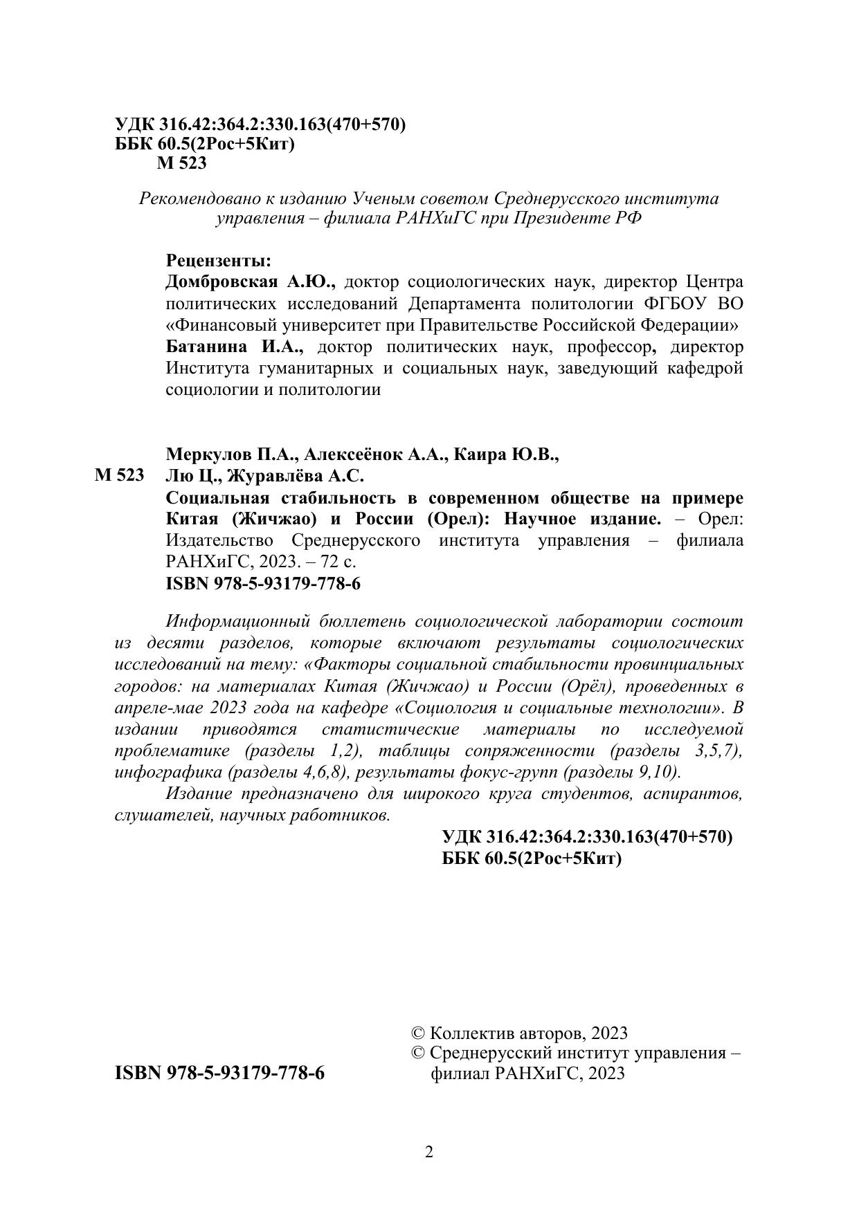 Информационный бюллетень социологической лаборатории состоит из десяти разделов, которые включают результаты социологических исследований на тему: «Факторы социальной стабильности провинциальных городов: на материалах Китая (Жичжао) и России (Орёл), проведенных в апреле-мае 2023 года на кафедре «Социология и социальные технологии». В издании приводятся статистические материалы по исследуемой проблематике (разделы 1,2), таблицы сопряженности (разделы 3,5,7), инфографика (разделы 4,6,8), результаты фокус-групп (разделы 9,10). Издание предназначено для широкого круга студентов, аспирантов, слушателей, научных работников.