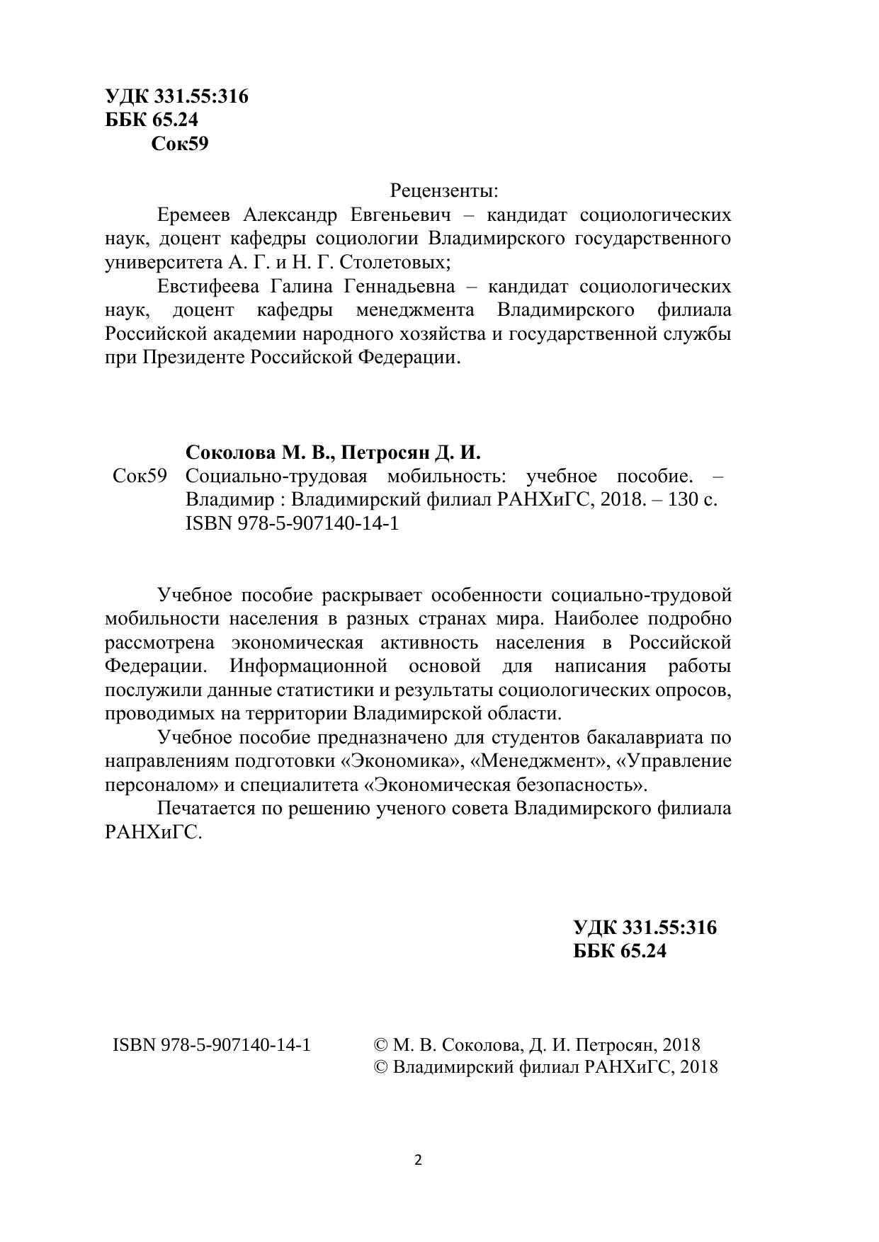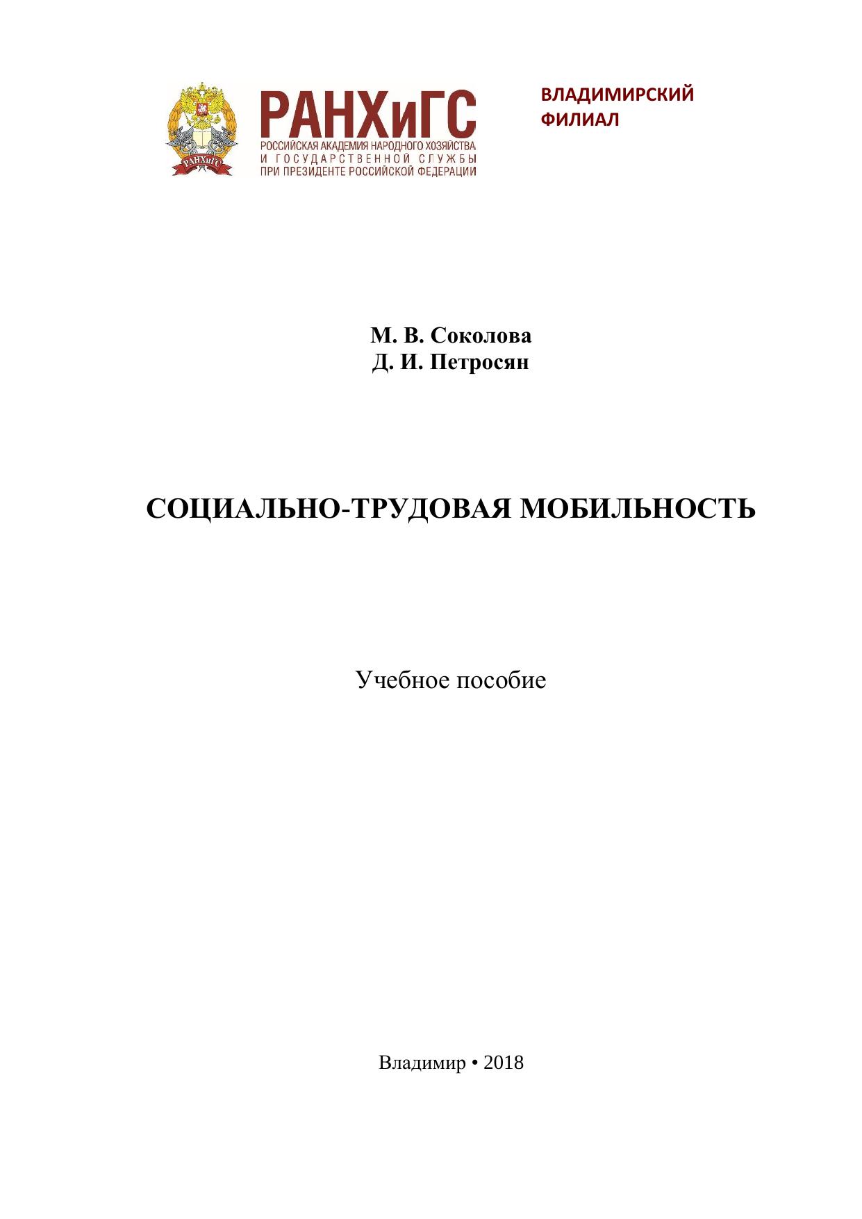 Учебное пособие раскрывает особенности социально-трудовой мобильности населения в разных странах мира. Наиболее подробно рассмотрена экономическая активность населения в Российской Федерации. Информационной основой для написания работы послужили данные статистики и результаты социологических опросов, проводимых на территории Владимирской области. Учебное пособие предназначено для студентов бакалавриата по направлениям подготовки «Экономика», «Менеджмент», «Управление персоналом» и специалитета «Экономическая безопасность». Печатается по решению ученого совета Владимирского филиала РАНХиГС.