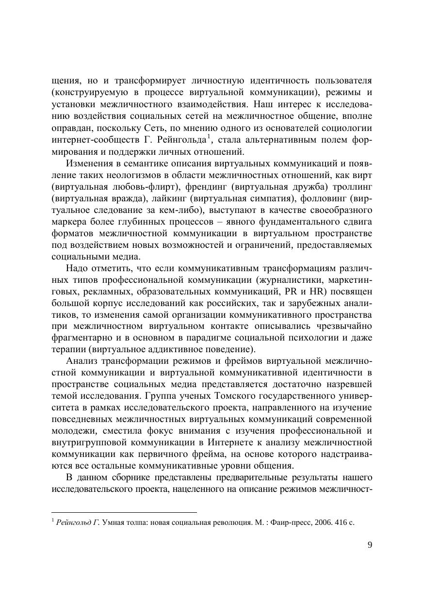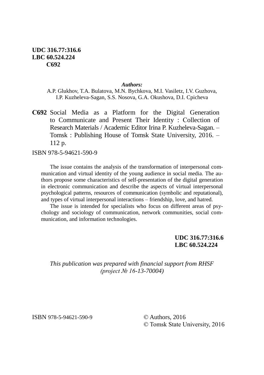 Сборник материалов исследования посвящен анализу трансформации сферы межличностных отношений и виртуальной идентичности молодёжной аудитории в пространстве социальных медиа. Авторы раскрывают особенности самопрезентации цифрового поколения в рамках электронных коммуникаций, описывают специфику виртуальных межличностных психологических установок, ресурсов общения (символических и репутационных), типов виртуального межличностного взаимодействия – знакомства, дружбы, любви, вражды. Для научных и практикующих работников, интересующихся вопросами психологии и социологии общения, сетевых сообществ, социальных коммуникаций, информационных технологий.
