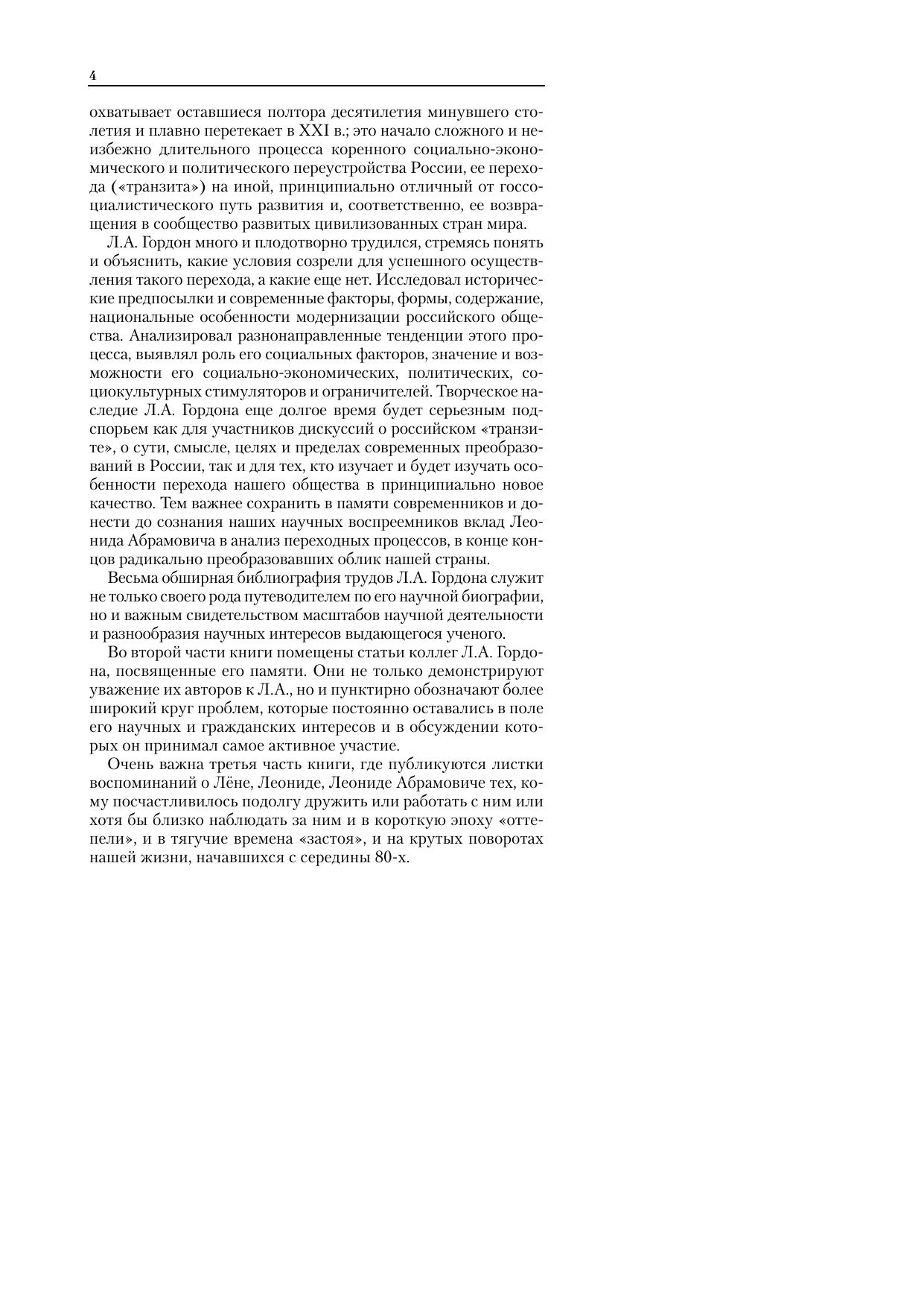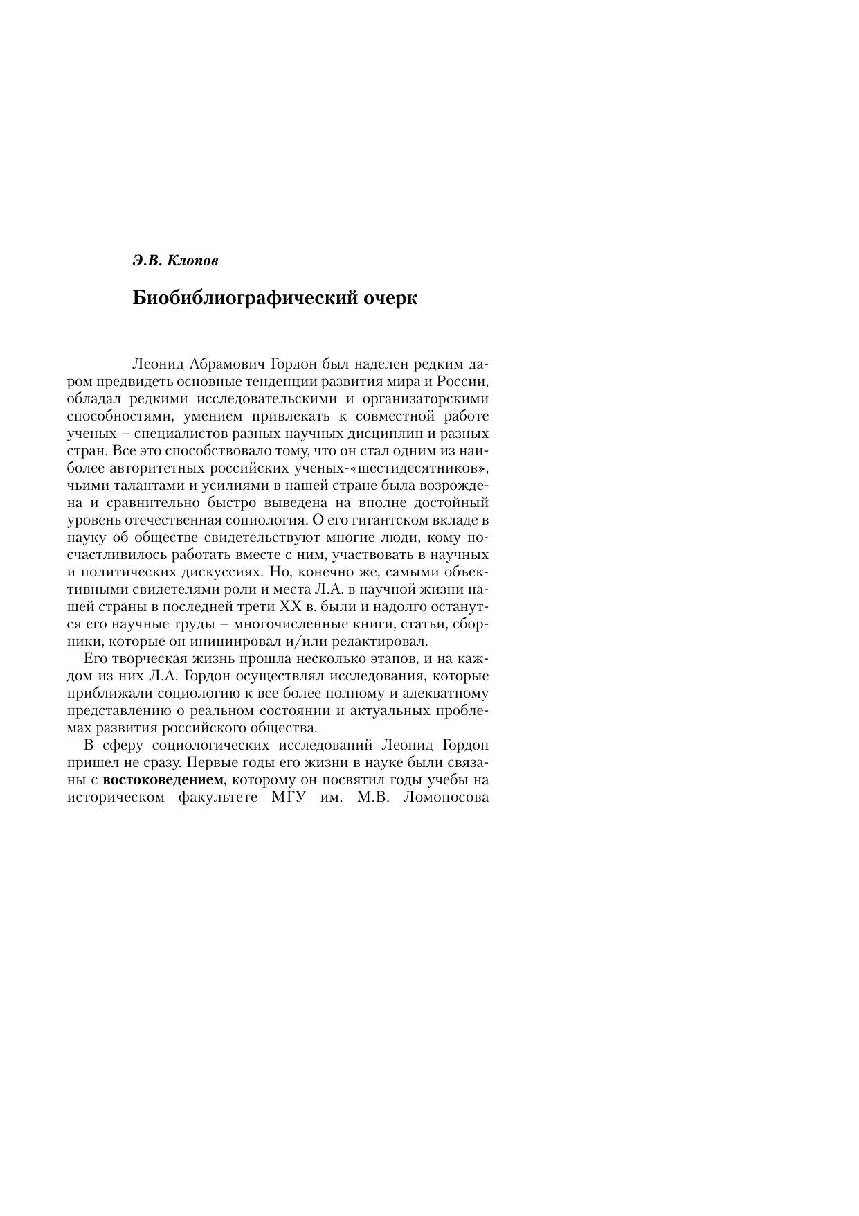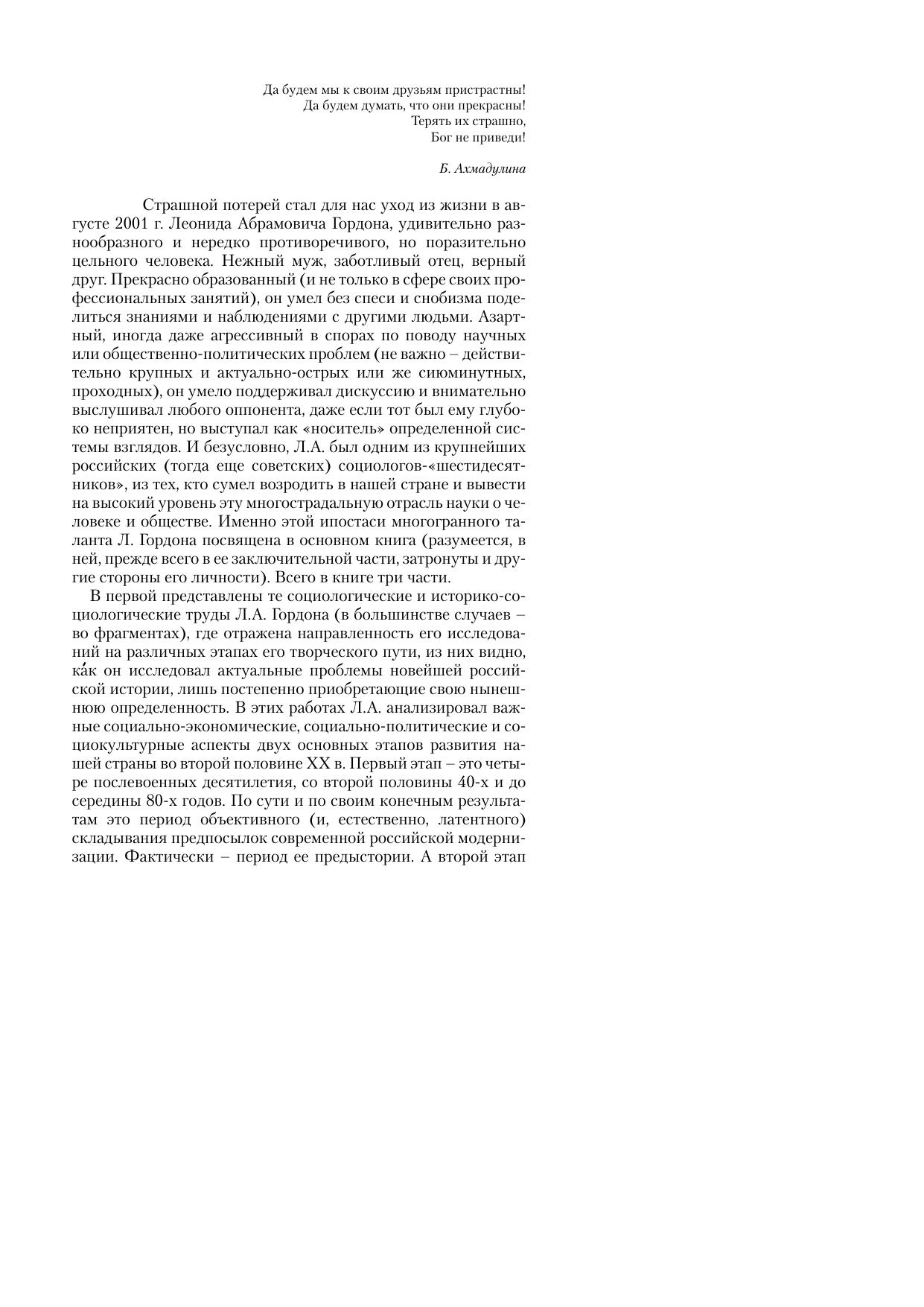 Данный сборник посвящен памяти Леонида Абрамовича Гордона - одного из крупнейших русских (тогда еще советских) социологов-"шестидесятников". Книга состоит из трех частей: в первой - историко-социологические труды Л.А.Гордона, отражающие направление его исследований на разных этапах творчества; во второй - статьи коллег Л.А.Гордона; и, наконец, в третьей - листки воспоминаний тех, кому посчастливилось дружить или работать с ним. Читатель найдет здесь и библиографию трудов Л.А.Гордона.