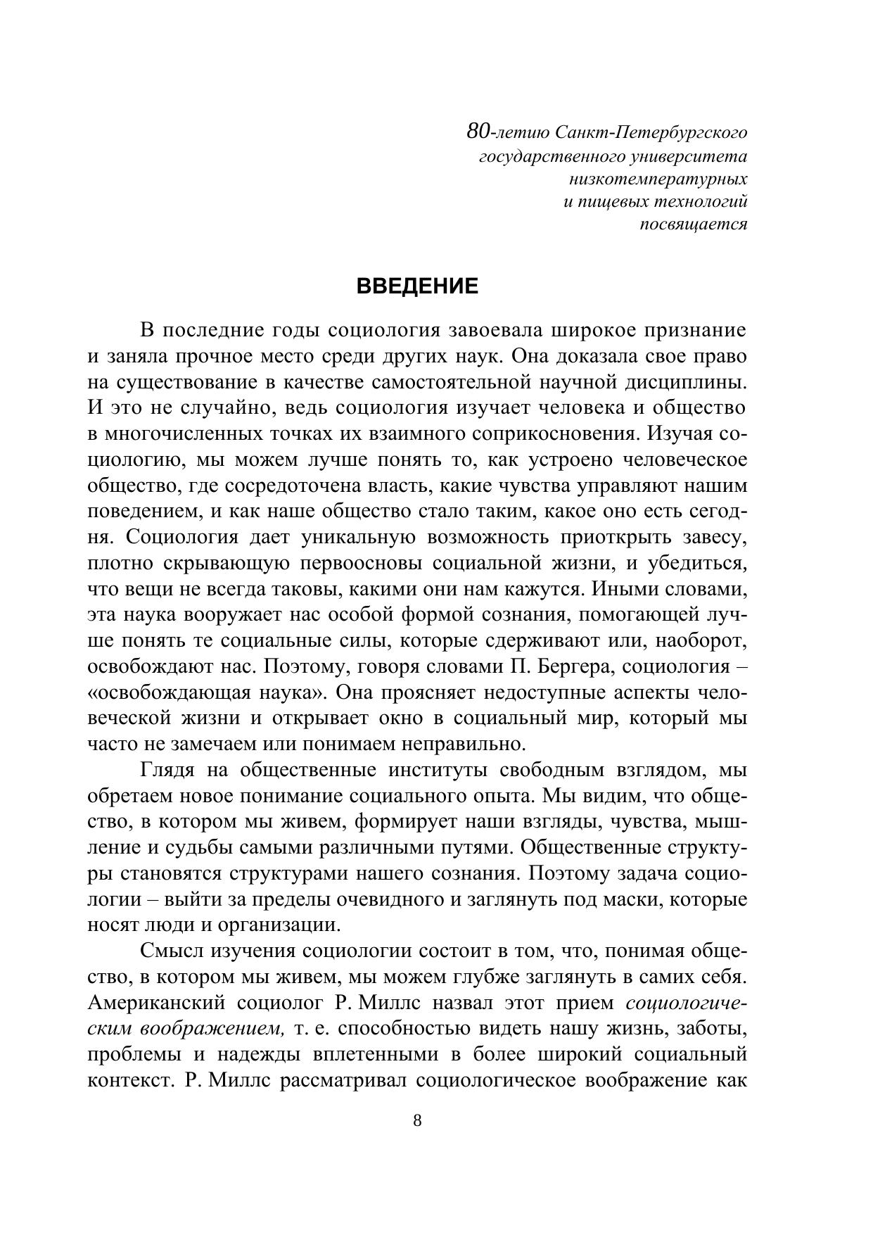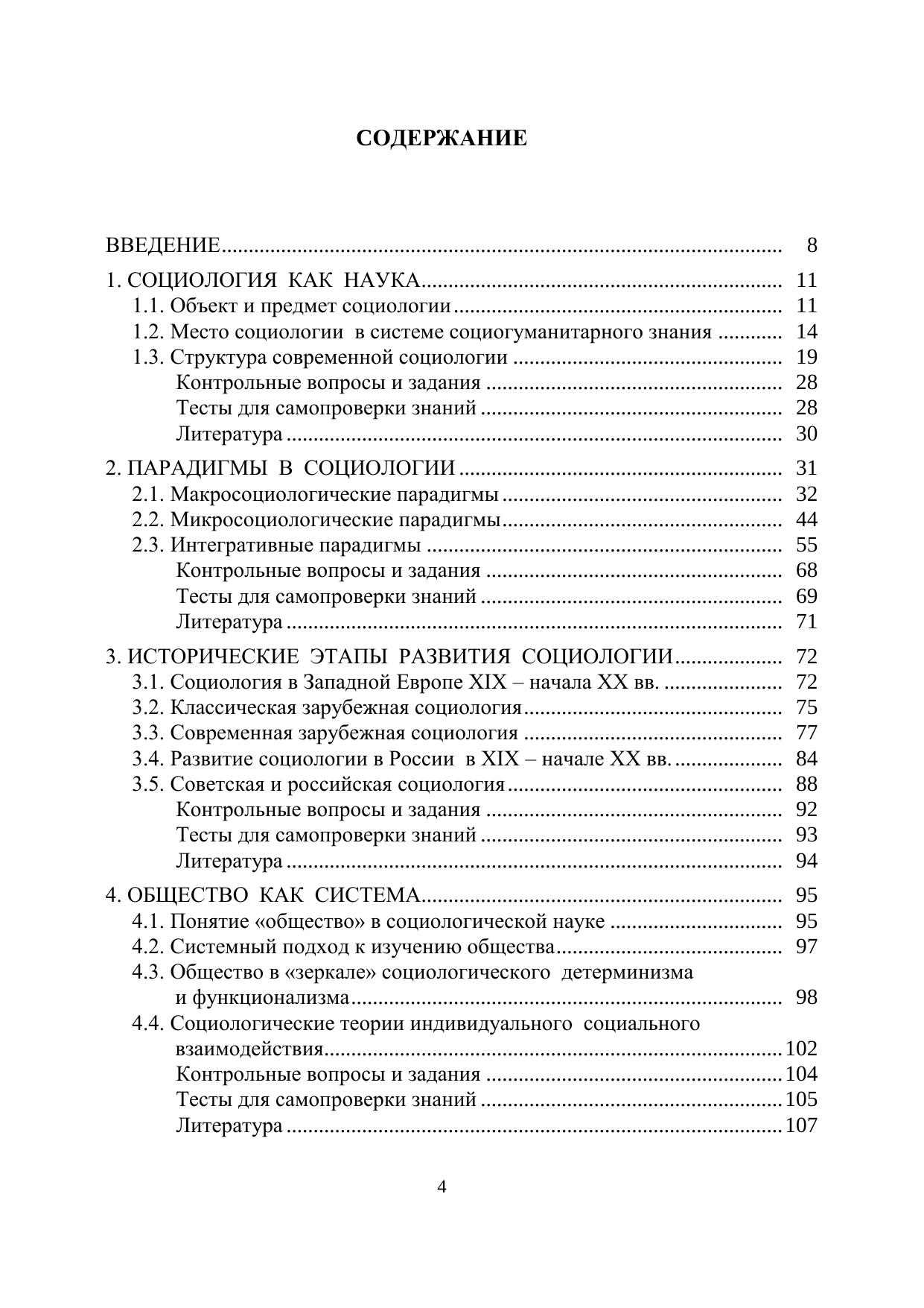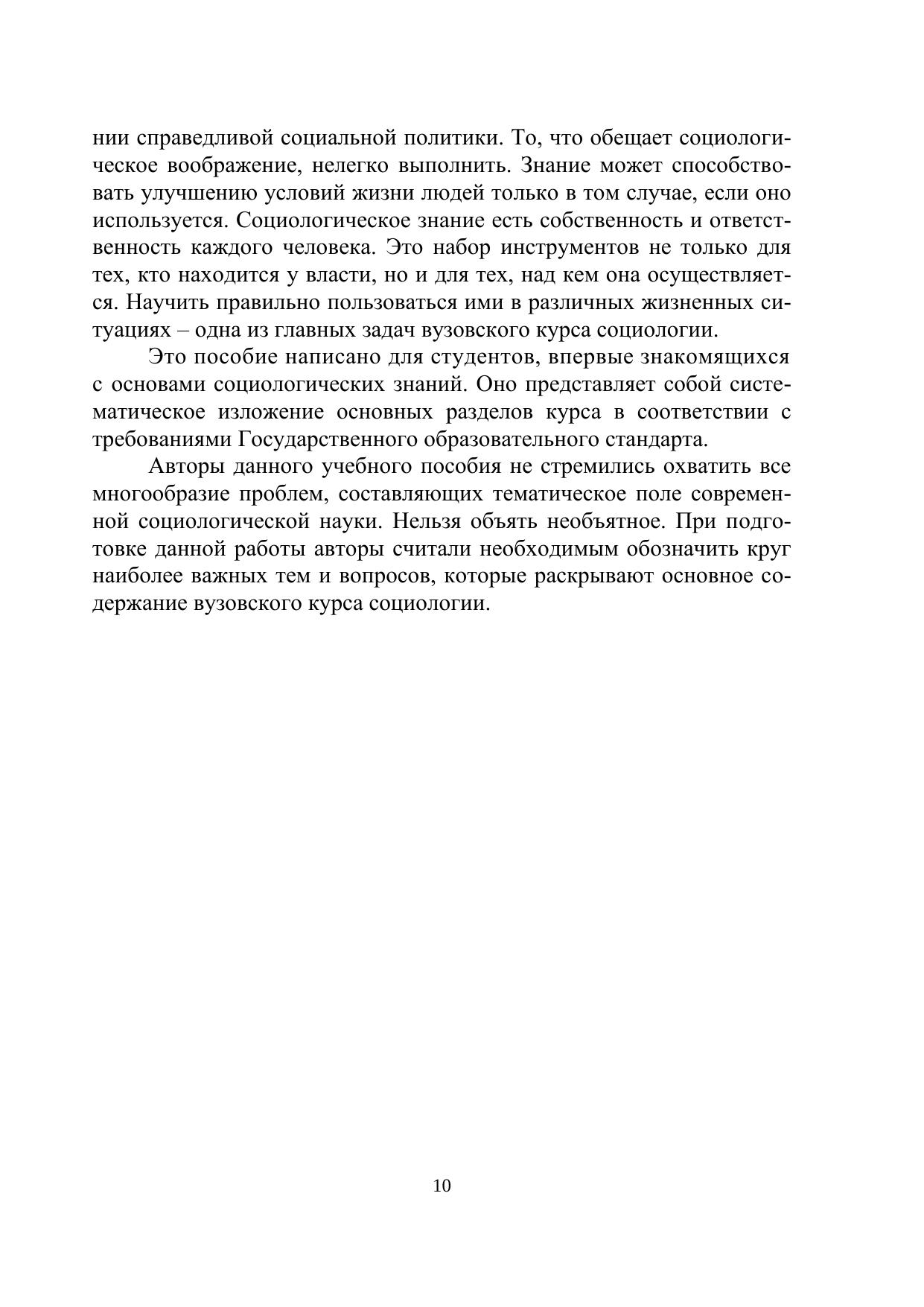 Учебное пособие подготовлено в соответствии с Государственным образовательным стандартом высшего профессионального образования второго поколения и с учетом достижений современной социологической науки. В нем раскрываются основные понятия и категории социологии, сферы их применения, тенденции и перспективы развития новых социологических концепций. В конце каждого раздела приведены контрольные вопросы, задания и тесты для самопроверки знаний студентов, списки литературы для самостоятельного изучения. Учебное пособие снабжено кратким словарем наиболее часто используемых терминов. В нем также помещены сведения о наиболее выдающихся ученых, внесших вклад в развитие социологии.