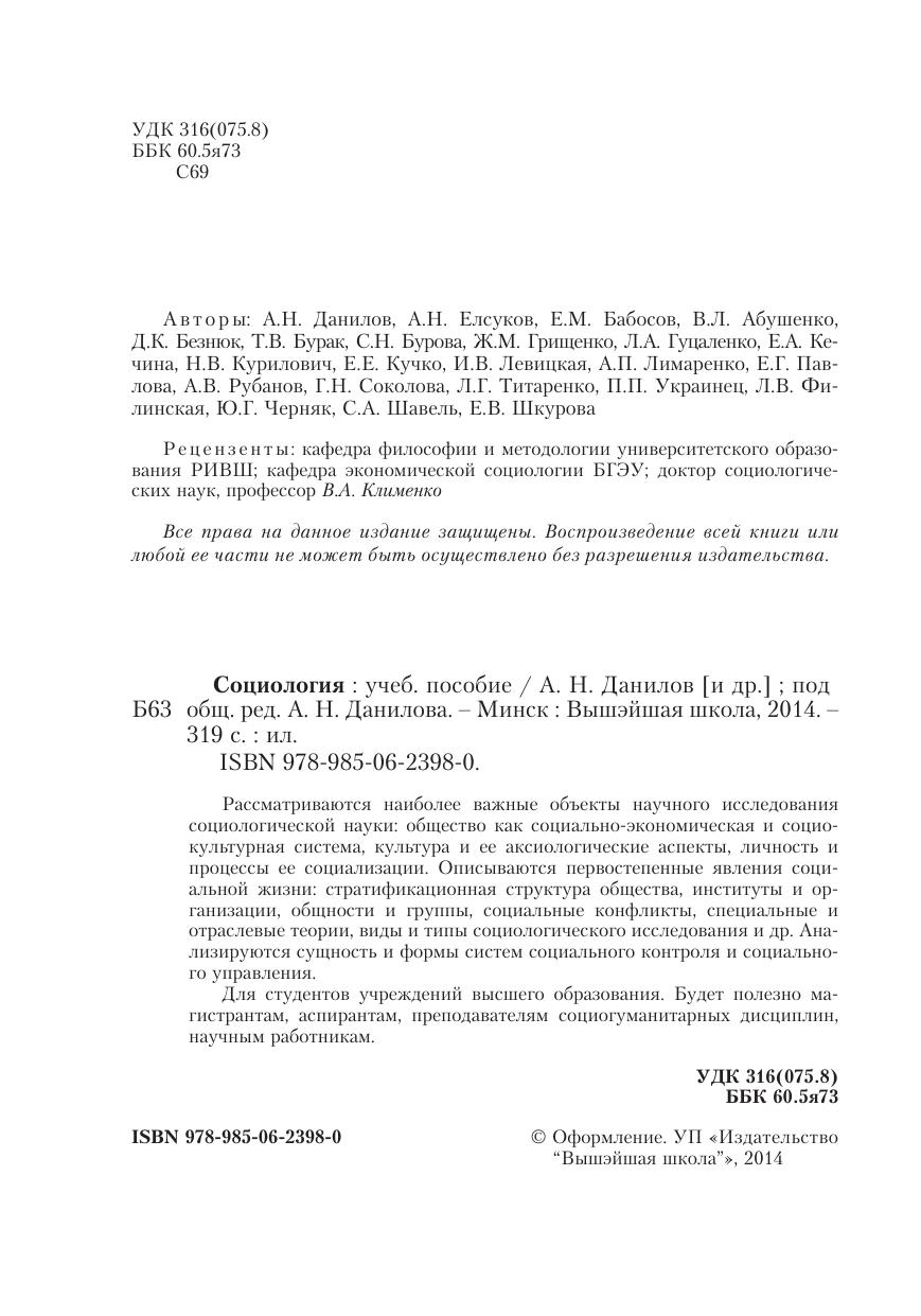 Рассматриваются наиболее важные объекты научного исследования социологической науки: общество как социально-экономическая и социокультурная система, культура и ее аксиологические аспекты, личность и процессы ее социализации. Описываются первостепенные явления социальной жизни: стратификационная структура общества, институты и организации, общности и группы, социальные конфликты, специальные и отраслевые теории, виды и типы социологического исследования и др. Анализируются сущность и формы систем социального контроля и социального управления. Для студентов вузов. Будет полезно магистрантам, аспирантам, преподавателям социогуманитарных дисциплин, научным работникам.
