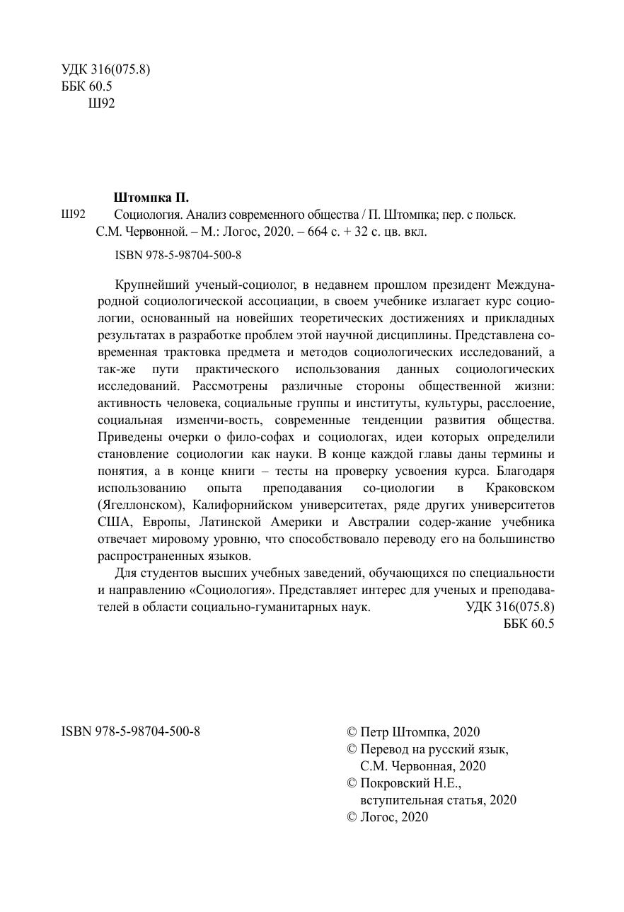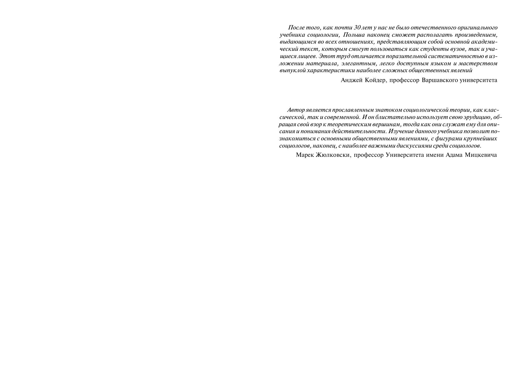 Крупнейший ученый-социолог, в недавнем прошлом президент Международной социологической ассоциации, в своем учебнике излагает курс социологии, основанный на новейших теоретических достижениях и прикладных результатах в разработке проблем этой научной дисциплины. Представлена современная трактовка предмета и методов социологических исследований, а также пути практического использования данных социологических исследований. Рассмотрены различные стороны общественной жизни: активность человека, социальные группы и институты, культуры, расслоение, социальная изменчи-вость, современные тенденции развития общества. Приведены очерки о фило-софах и социологах, идеи которых определили становление социологии как науки. В конце каждой главы даны термины и понятия, а в конце книги – тесты на проверку усвоения курса. Благодаря использованию опыта преподавания со-циологии в Краковском (Ягеллонском), Калифорнийском университетах, ряде других университетов США, Европы, Латинской Америки и Австралии содер-жание учебника отвечает мировому уровню, что способствовало переводу его на большинство распространенных языков. Для студентов высших учебных заведений, обучающихся по специальности и направлению «Социология». Представляет интерес для ученых и преподавателей в области социально-гуманитарных наук.
