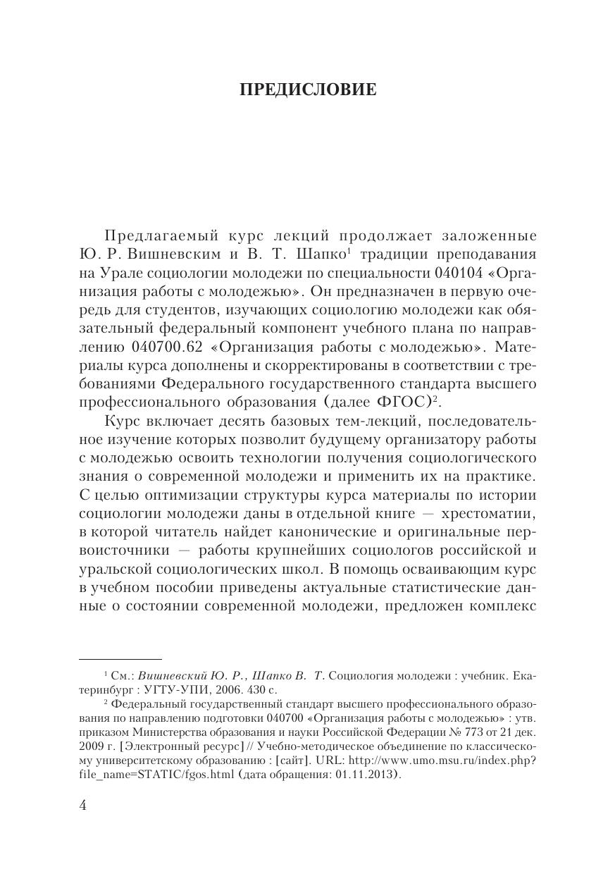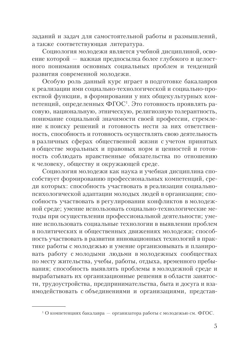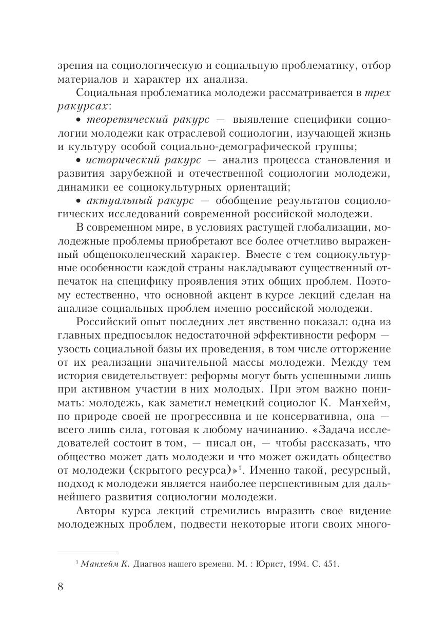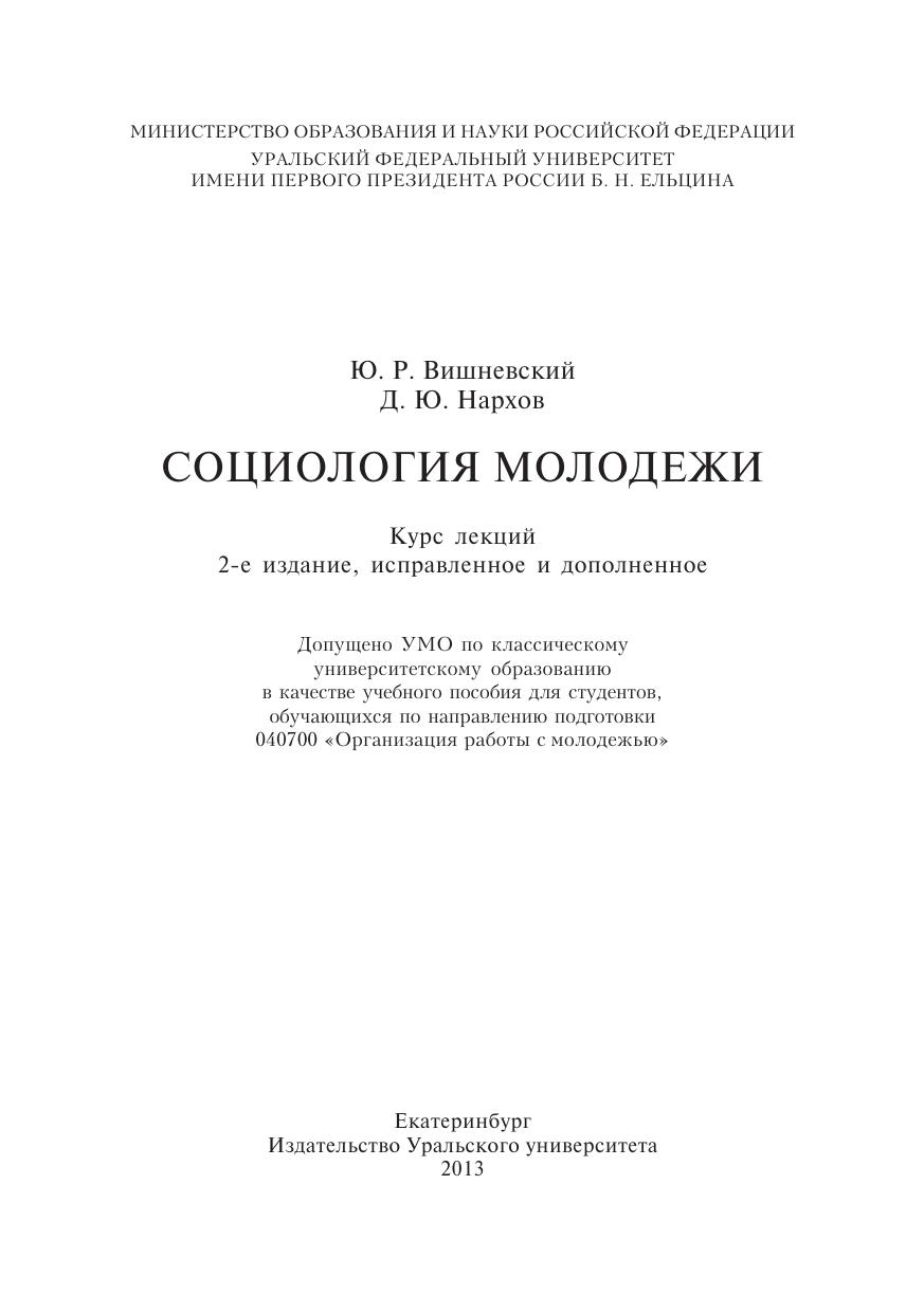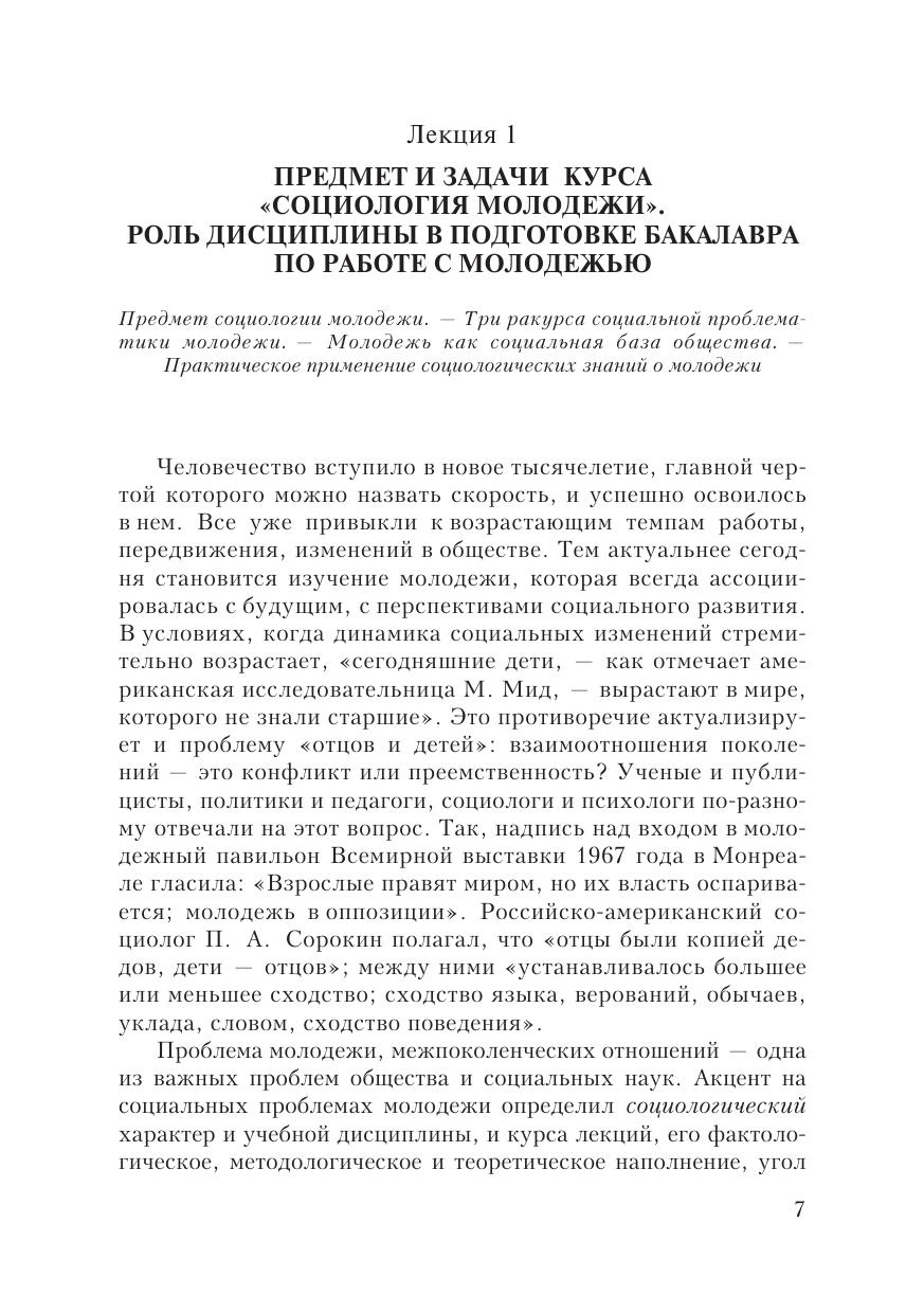 Курс лекций ориентирован на освоение социологии молодежи в качестве базовой дисциплины. Раскрываются структура и специфика молодежи с точки зрения деятельностного, социологического и социокультурного подходов; даются результаты анализа социального самочувствия молодежи и ее ценностных ориентаций; приводятся основные сведения о социологическом обеспечении государственной молодежной политики. Для студентов, обучающихся по направлению бакалавриата «Организация работы с молодежью», а также для специалистов общественных организаций и управленцев, работающих в сфере социальной и государственной молодежной политики.