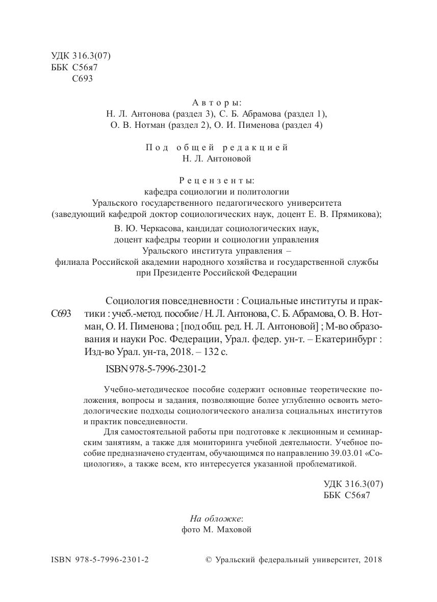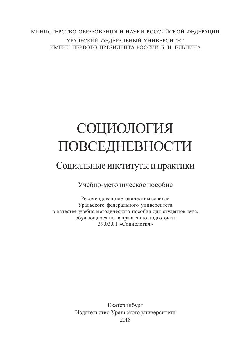 Учебно-методическое пособие содержит основные теоретические положения, вопросы и задания, позволяющие более углубленно освоить методологические подходы социологического анализа социальных институтов и практик повседневности. Для самостоятельной работы при подготовке к лекционным и семинарским занятиям, а также для мониторинга учебной деятельности. Учебное пособие предназначено студентам, обучающимся по направлению 39.03.01 «Социология», а также всем, кто интересуется указанной проблематикой.