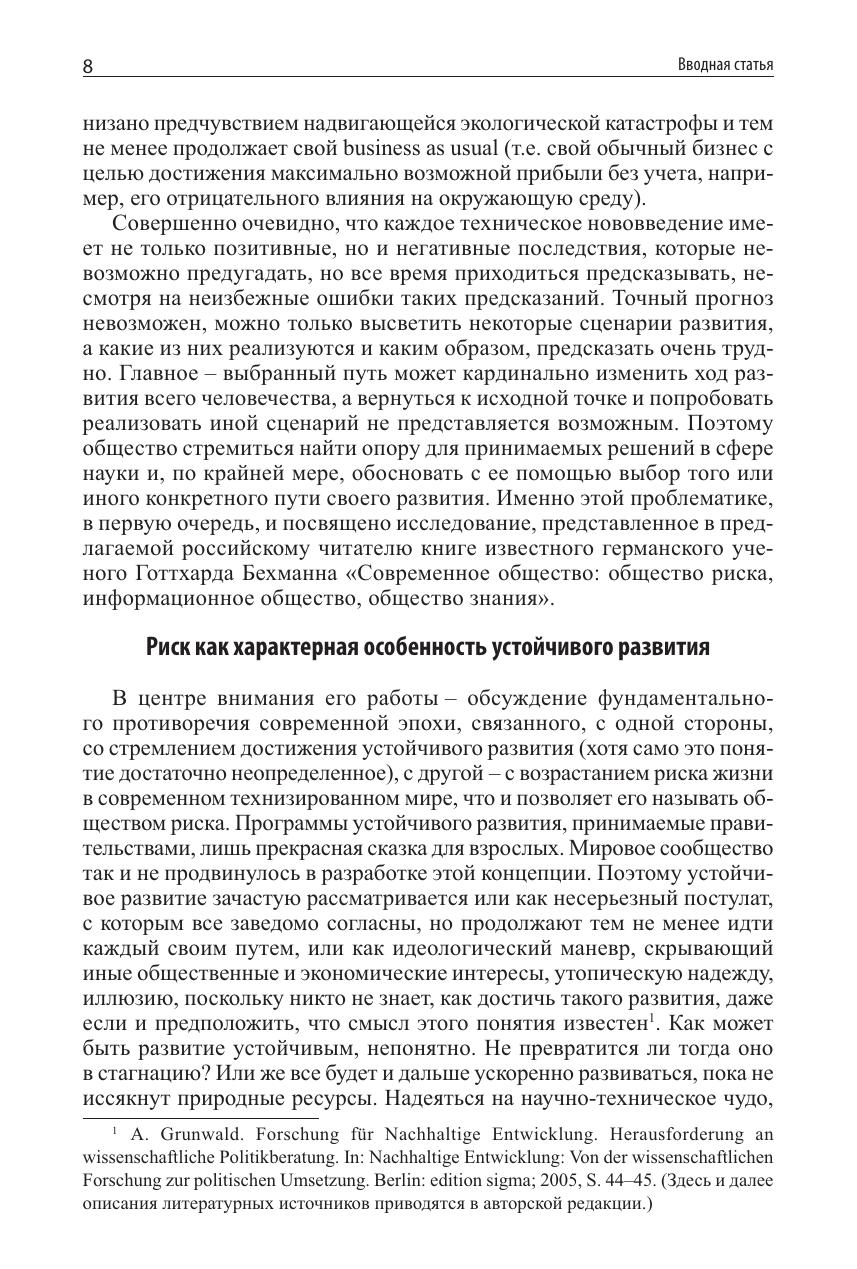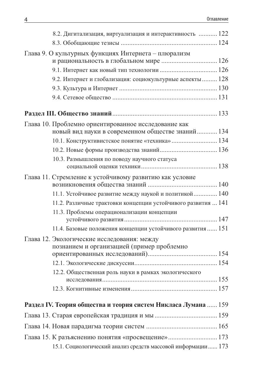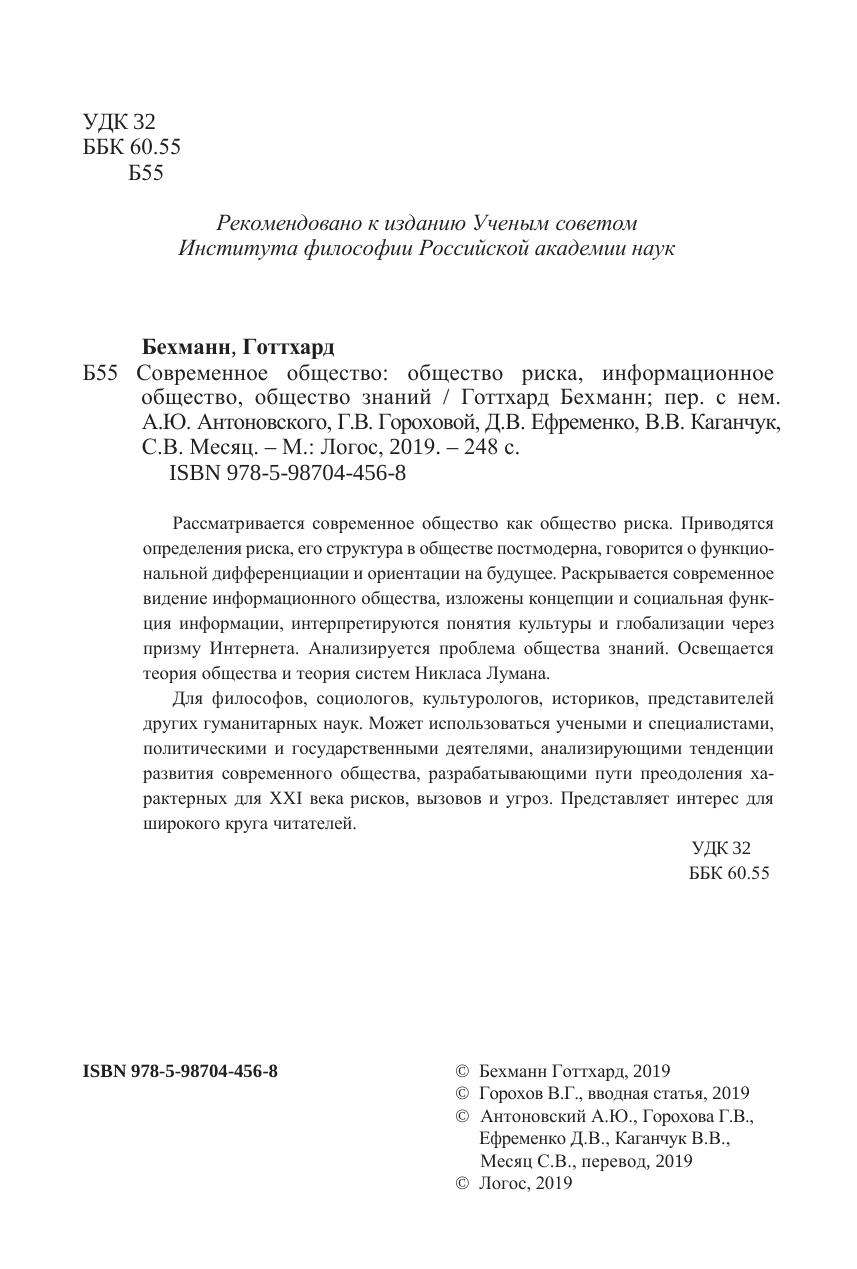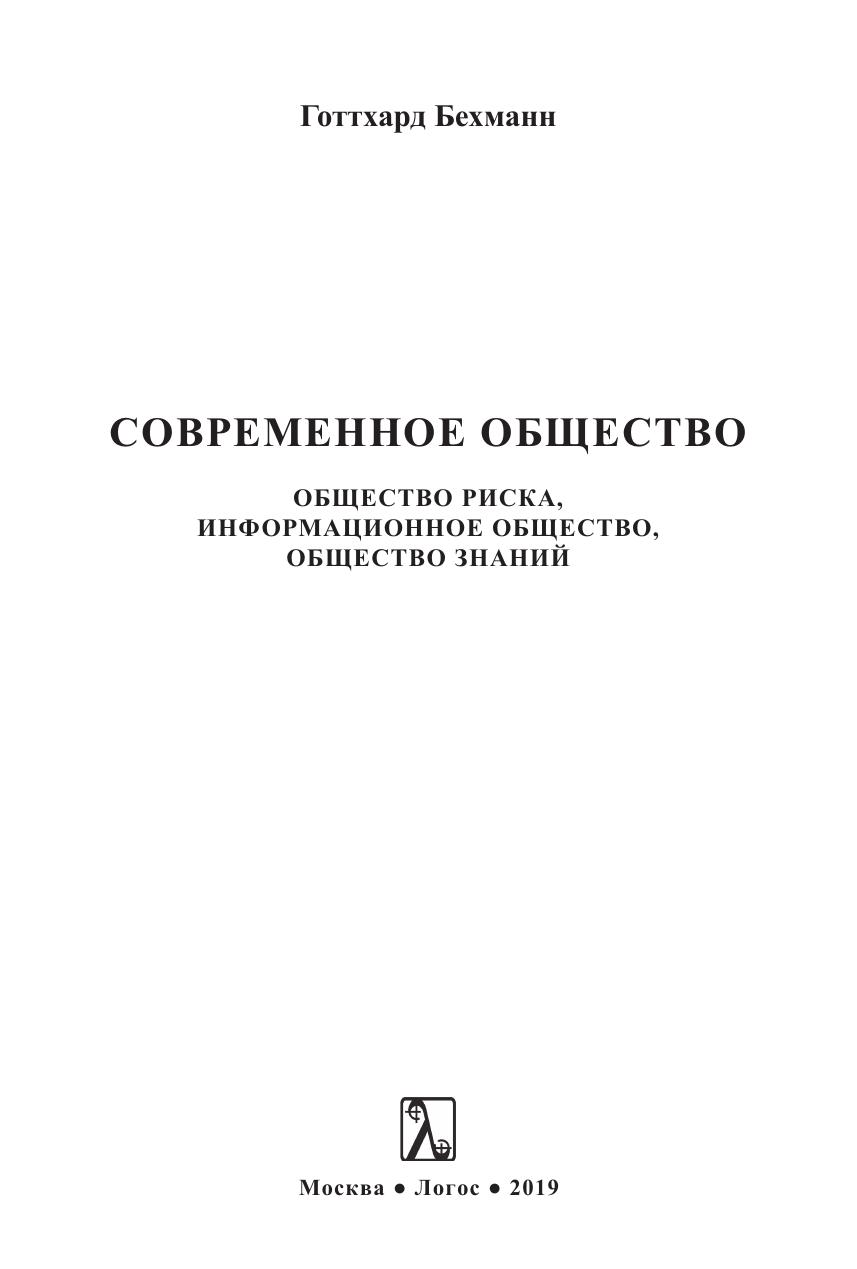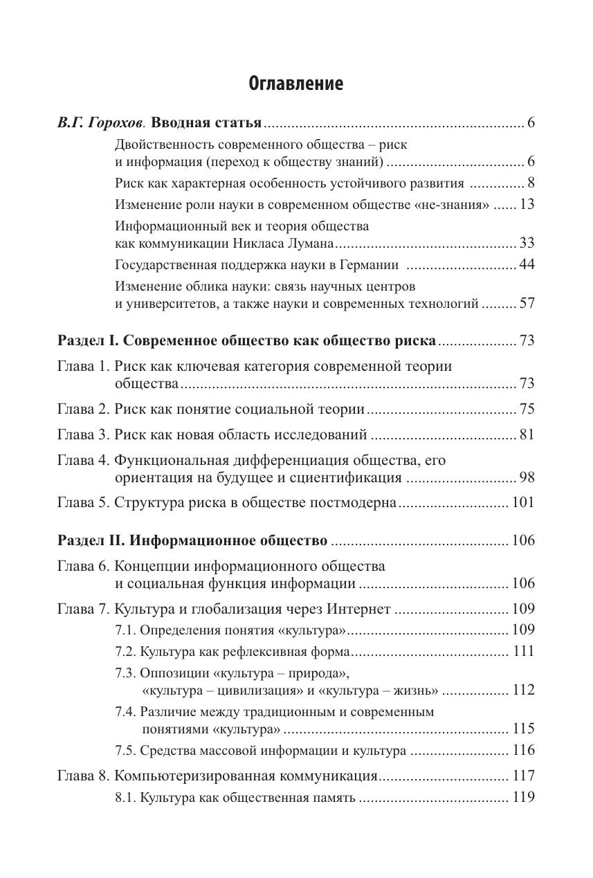 Рассматривается современное общество как общество риска. Приводятся определения риска, его структура в обществе постмодерна, говорится о функциональной дифференциации и ориентации на будущее. Раскрывается современное видение информационного общества, изложены концепции и социальная функция информации, интерпретируются понятия культуры и глобализации через призму Интернета. Анализируется проблема общества знаний. Освещается теория общества и теория систем Никласа Лумана. Для философов, социологов, культурологов, историков, представителей других гуманитарных наук. Может использоваться учеными и специалистами, политическими и государственными деятелями, анализирующими тенденции развития современного общества, разрабатывающими пути преодоления характерных для XXI века рисков, вызовов и угроз. Представляет интерес для широкого круга читателей.