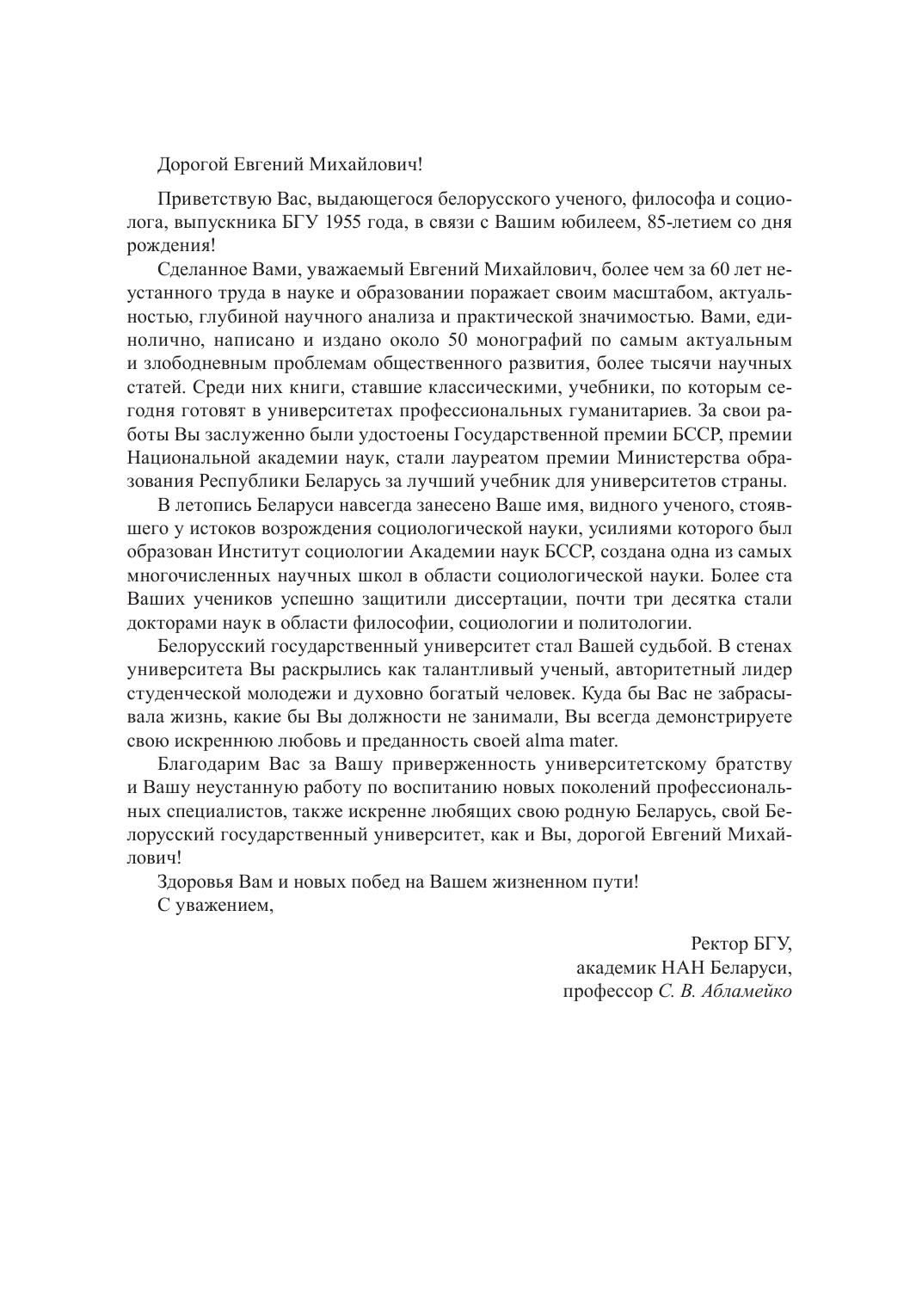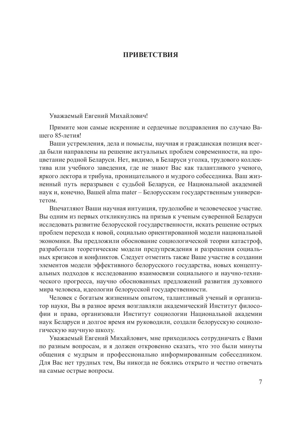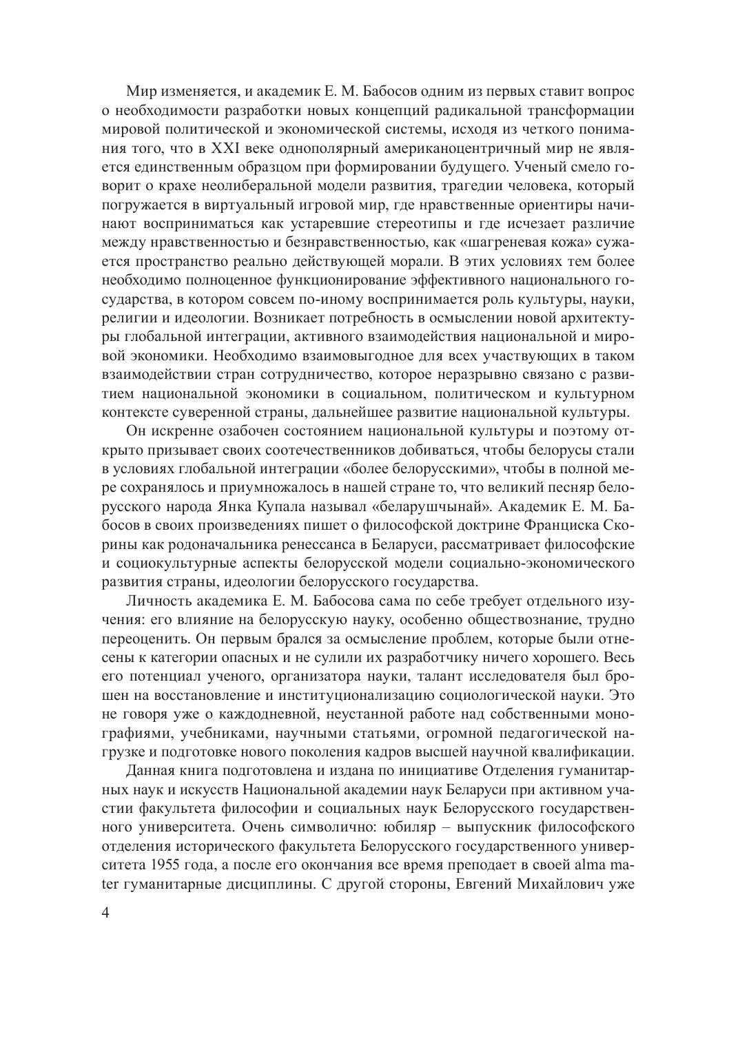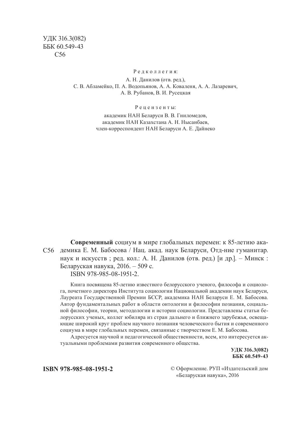 Книга посвящена 85-летию известного белорусского ученого, философа и социолога, почетного директора Института социологии Национальной академии наук Беларуси, Лауреата Государственной Премии БССР, академика НАН Беларуси Е. М. Бабосова. Автор фундаментальных работ в области онтологии и философии познания, социальной философии, теории, методологии и истории социологии. Представлены статьи белорусских ученых, коллег юбиляра из стран дальнего и ближнего зарубежья, освещающие широкий круг проблем научного познания человеческого бытия и современного социума в мире глобальных перемен, связанные с творчеством Е. М. Бабосова. Адресуется научной и педагогической общественности, всем, кто интересуется актуальными проблемами развития современного общества.