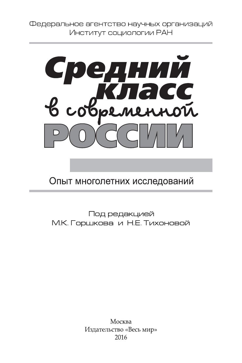подгрупп среднего класса (прежде всего его «ядра»), оценка перспектив роста численности российского среднего класса с учетом его места и роли на рынке труда, характеристика взглядов и поведенческих практик его представителей, влияния на них начавшегося с осени 2014 г. экономического кризиса, а также анализ специфики запросов и ожиданий этой части населения страны по отношению к государству.