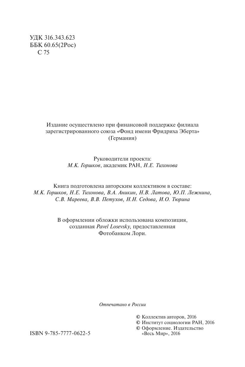 В основе книги – результаты многолетних исследований Института социологии РАН, выполненных в сотрудничестве с Представительством Фонда им. Ф. Эберта (Германия) в Российской Федерации в 2003–2015 гг.
