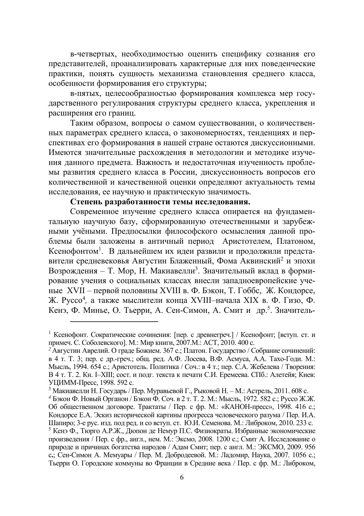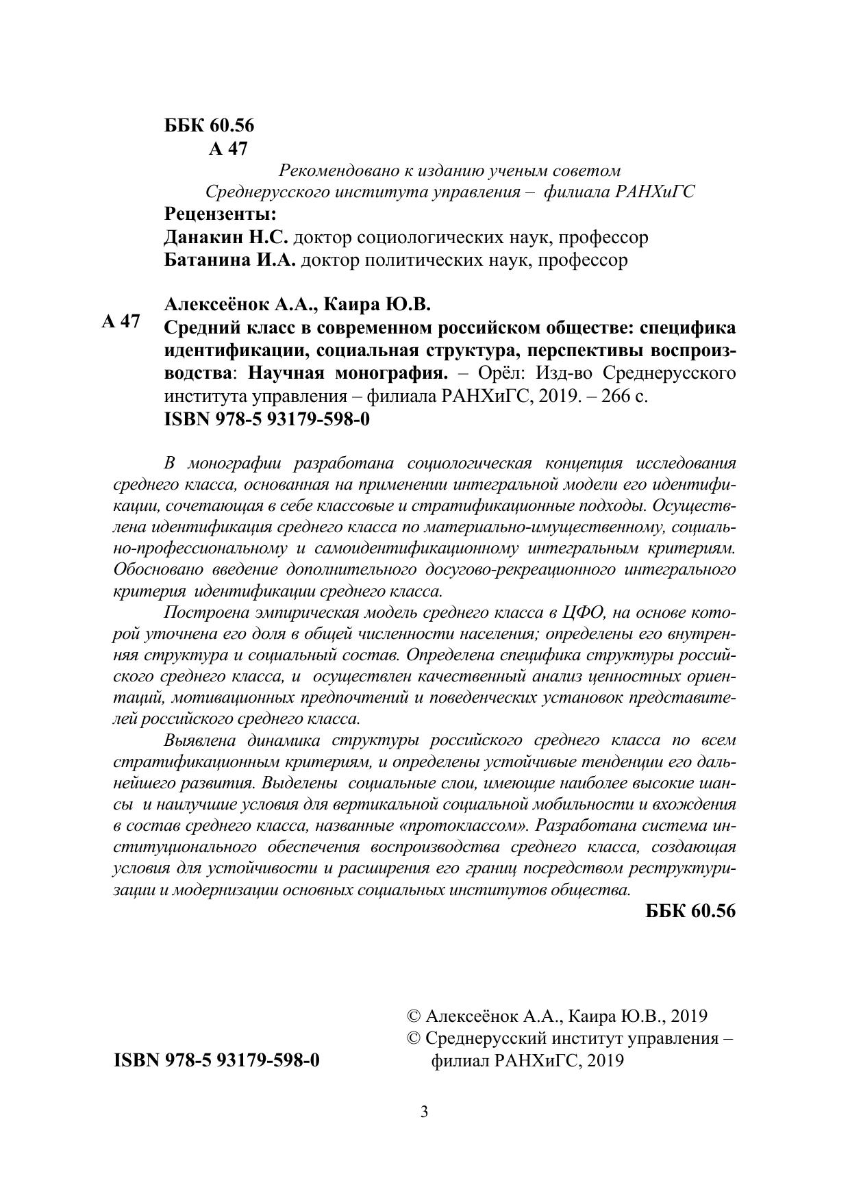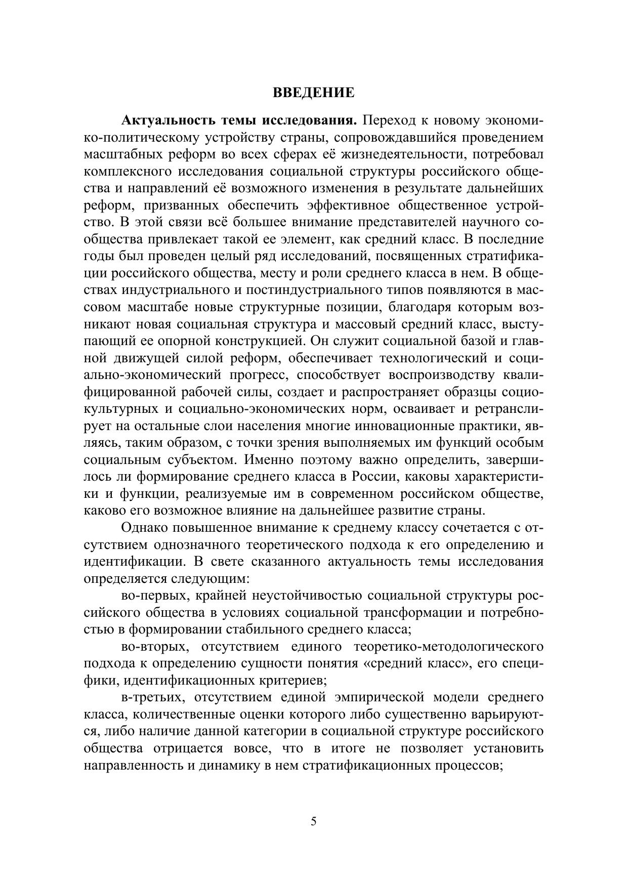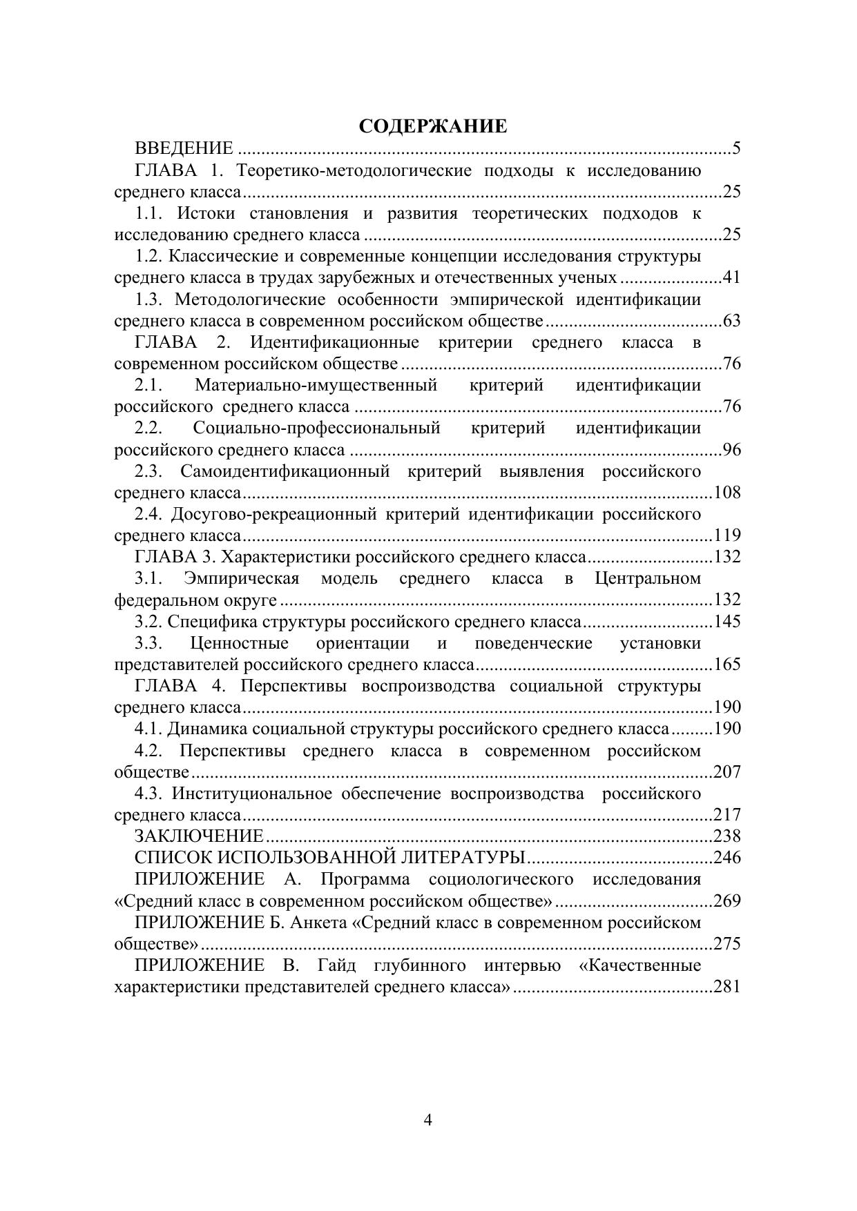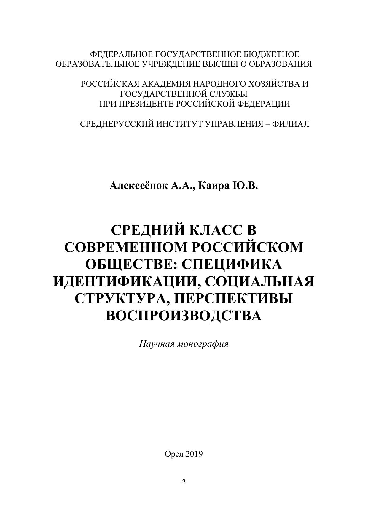 В монографии разработана социологическая концепция исследования среднего класса, основанная на применении интегральной модели его идентификации, сочетающая в себе классовые и стратификационные подходы. Осуществлена идентификация среднего класса по материально-имущественному, социально-профессиональному и самоидентификационному интегральным критериям. Обосновано введение дополнительного досугово-рекреационного интегрального критерия идентификации среднего класса. Построена эмпирическая модель среднего класса в ЦФО, на основе которой уточнена его доля в общей численности населения; определены его внутренняя структура и социальный состав. Определена специфика структуры российского среднего класса, и осуществлен качественный анализ ценностных ориентаций, мотивационных предпочтений и поведенческих установок представителей российского среднего класса. Выявлена динамика структуры российского среднего класса по всем стратификационным критериям, и определены устойчивые тенденции его дальнейшего развития. Выделены социальные слои, имеющие наиболее высокие шансы и наилучшие условия для вертикальной социальной мобильности и вхождения в состав среднего класса, названные «протоклассом». Разработана система институционального обеспечения воспроизводства среднего класса, создающая условия для устойчивости и расширения его границ посредством реструктуризации и модернизации основных социальных институтов общества.
