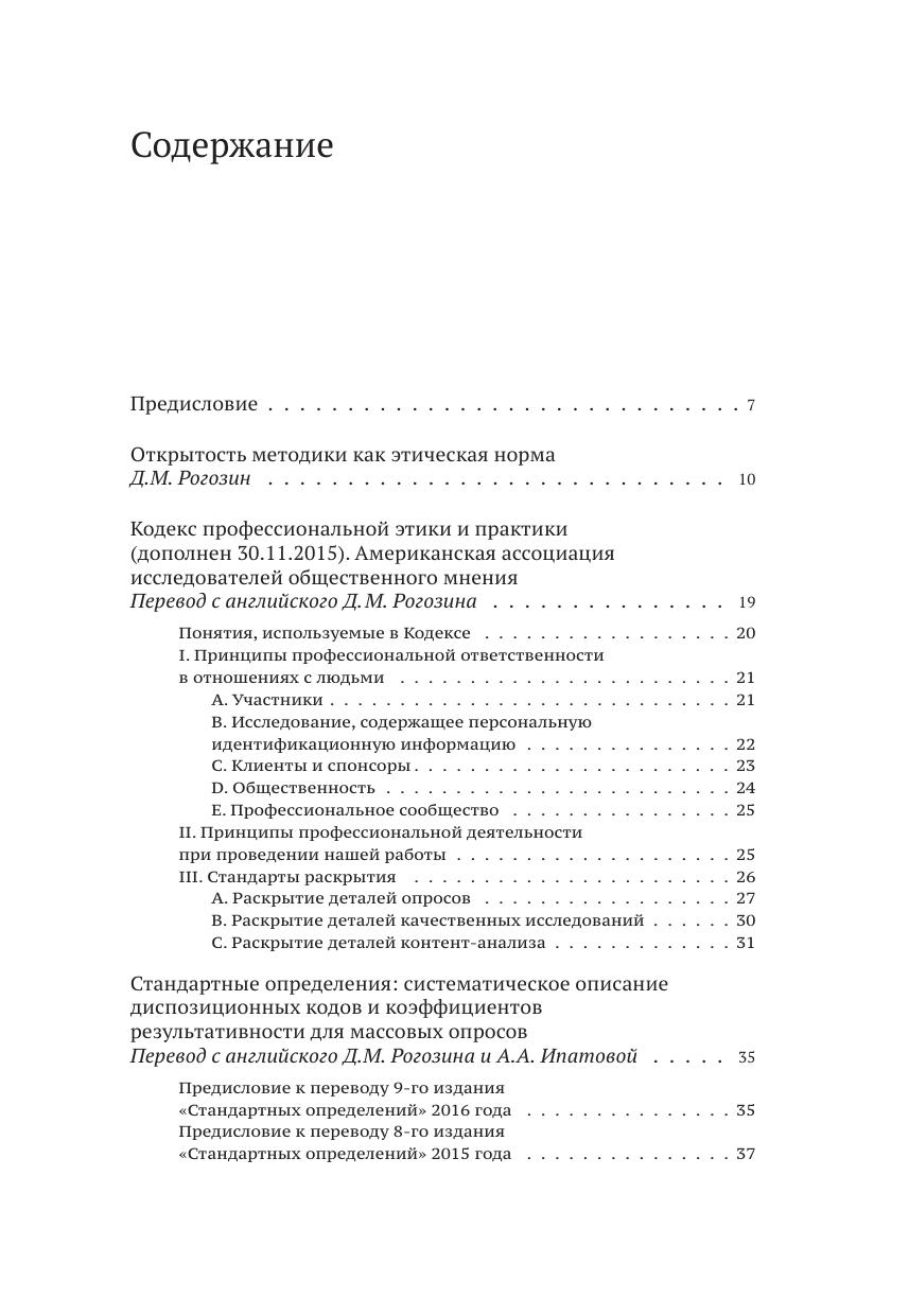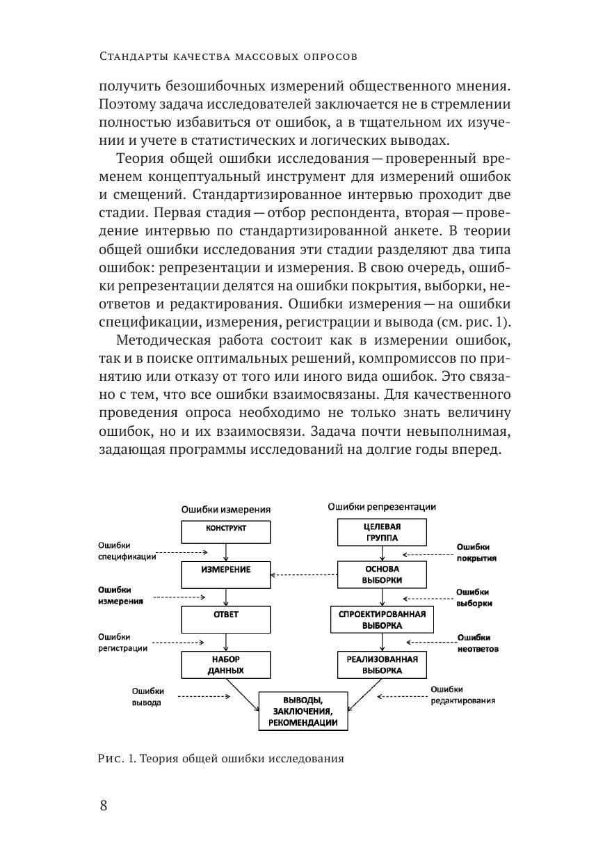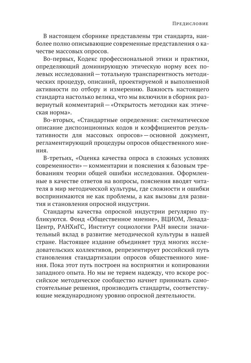 Качество опросов общественного мнения определяется точностью и эффективностью процедур и мероприятий по отбору респондентов, установлению контакта, получению информированного согласия, проведению и завершению интервью, учету и анализу отказавшихся от участия в опросе. Качество каждой процедуры, каждого мероприятия задается стандартами и требованиями учета и контроля отклонений от спроектированного опросного дизайна. Специалистами Института социального анализа и прогнозирования РАНХиГС предложены переводы стандартов качества Американской ассоциации исследователей общественного мнения (AAPOR), которые дополнены оригинальными статьями, адаптирующими американский опыт к российской действительности. Сборник будет полезен специалистам в области массовых опросов, исследователям общественного мнения, журналистам, политическим аналитикам, государственным служащим, использующим результаты опросов в своей профессиональной деятельности, а также студентам, аспирантам и преподавателям по социальным и политическим наукам.