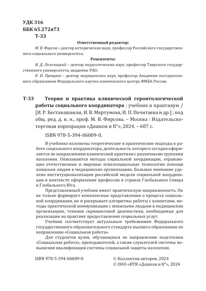 Представленный учебник имеет практическую направленность. Он не только формирует комплексные представления о процессе социальной координации, но и раскрывает алгоритмы работы с клиентами, методы практической коммуникации с пожилыми людьми в медицинских организациях, техники скрининговой диагностики, необходимые для реализации на практике предоставления социальных услуг.