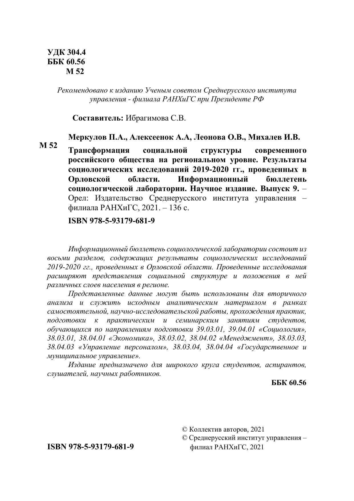 Трансформация социальной структуры современного российского общества на региональном уровне. Результаты социологических исследований 2019-2020 гг., проведенных в Орловской области. Информационный бюллетень социологической лаборатории. Выпуск 9