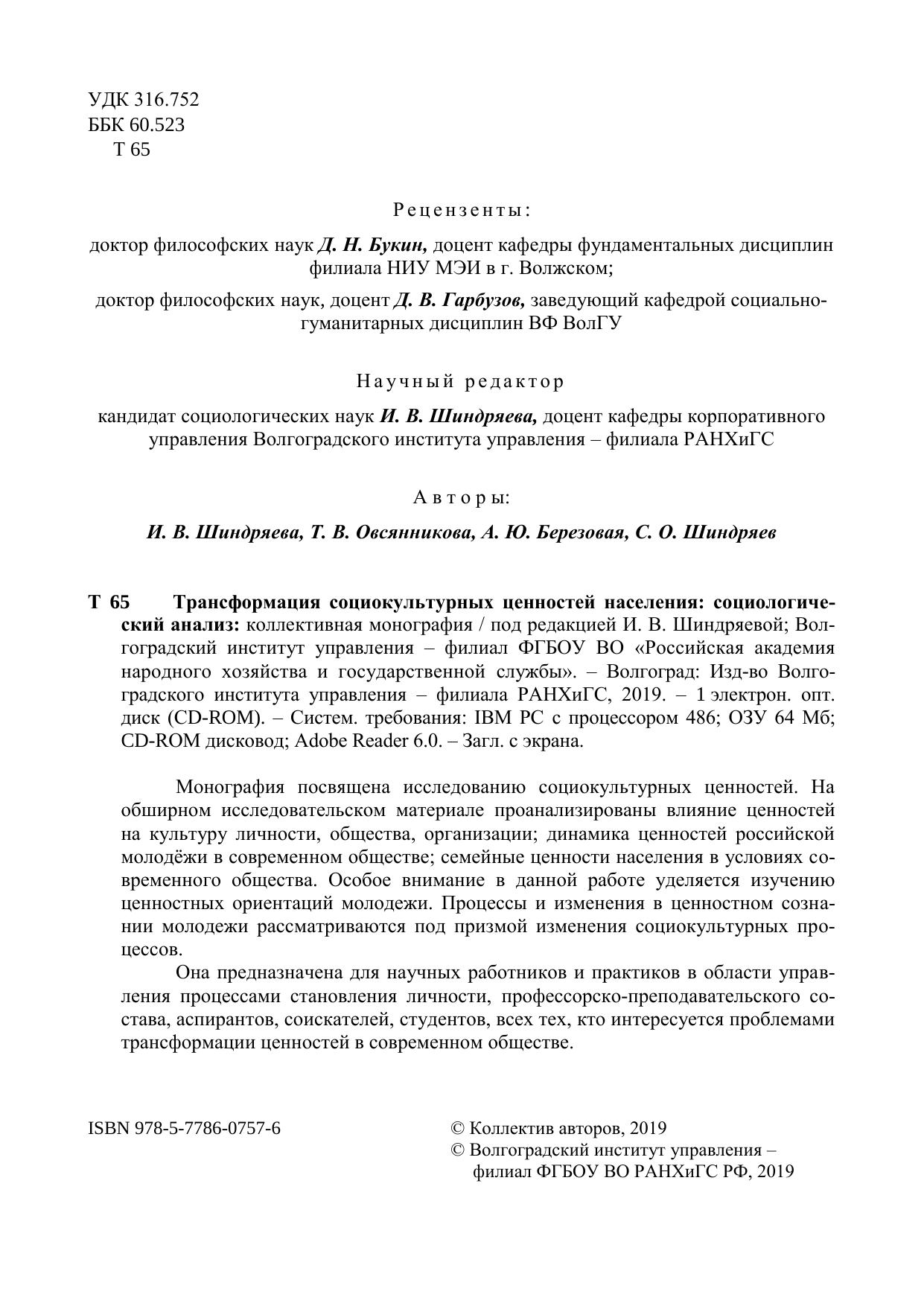 Монография посвящена исследованию социокультурных ценностей. На обширном исследовательском материале проанализированы влияние ценностей на культуру личности, общества, организации; динамика ценностей российской молодѐжи в современном обществе; семейные ценности населения в условиях со-временного общества. Особое внимание в данной работе уделяется изучению ценностных ориентаций молодежи. Процессы и изменения в ценностном созна-нии молодежи рассматриваются под призмой изменения социокультурных про-цессов. Она предназначена для научных работников и практиков в области управ-ления процессами становления личности, профессорско-преподавательского со-става, аспирантов, соискателей, студентов, всех тех, кто интересуется проблемами трансформации ценностей в современном обществе.