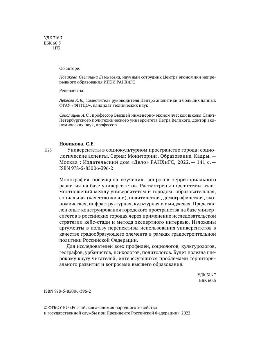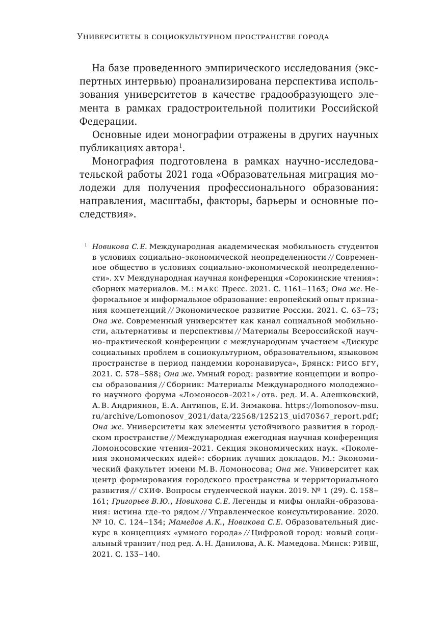 Монография посвящена изучению вопросов территориального развития на базе университетов. Рассмотрены подсистемы взаимоотношений между университетом и городом: образовательная, социальная (качество жизни), политическая, демографическая, экономическая, инфраструктурная, культурная и имиджевая. Представлен опыт конструирования городского пространства на базе университетов в российских городах через применение исследовательской стратегии кейс-стади и метода экспертного интервью. Изложены аргументы в пользу перспективы использования университетов в качестве градообразующего элемента в рамках градостроительной политики Российской Федерации. Для исследователей всех профилей, социологов, культурологов, географов, урбанистов, психологов, политологов. Будет полезна широкому кругу читателей, интересующихся проблемами территориального развития и вопросами высшего образования.