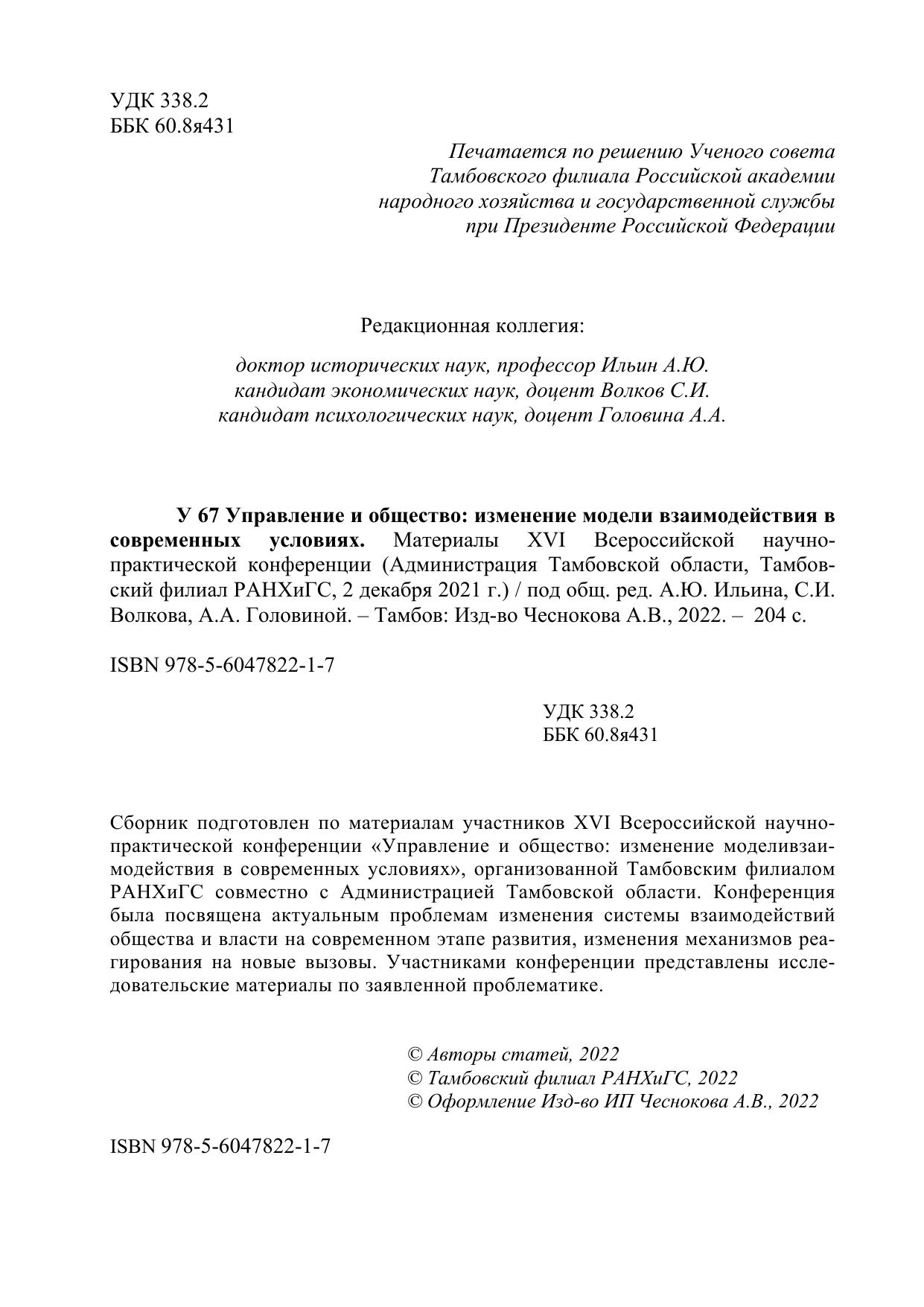Управление и общество: изменение модели взаимодействия в современных условиях. Материалы ХVI Всероссийской научно-практической конференции (Администрация Тамбовской области, Тамбовский филиал РАНХиГС, 2 декабря 2021 г.)